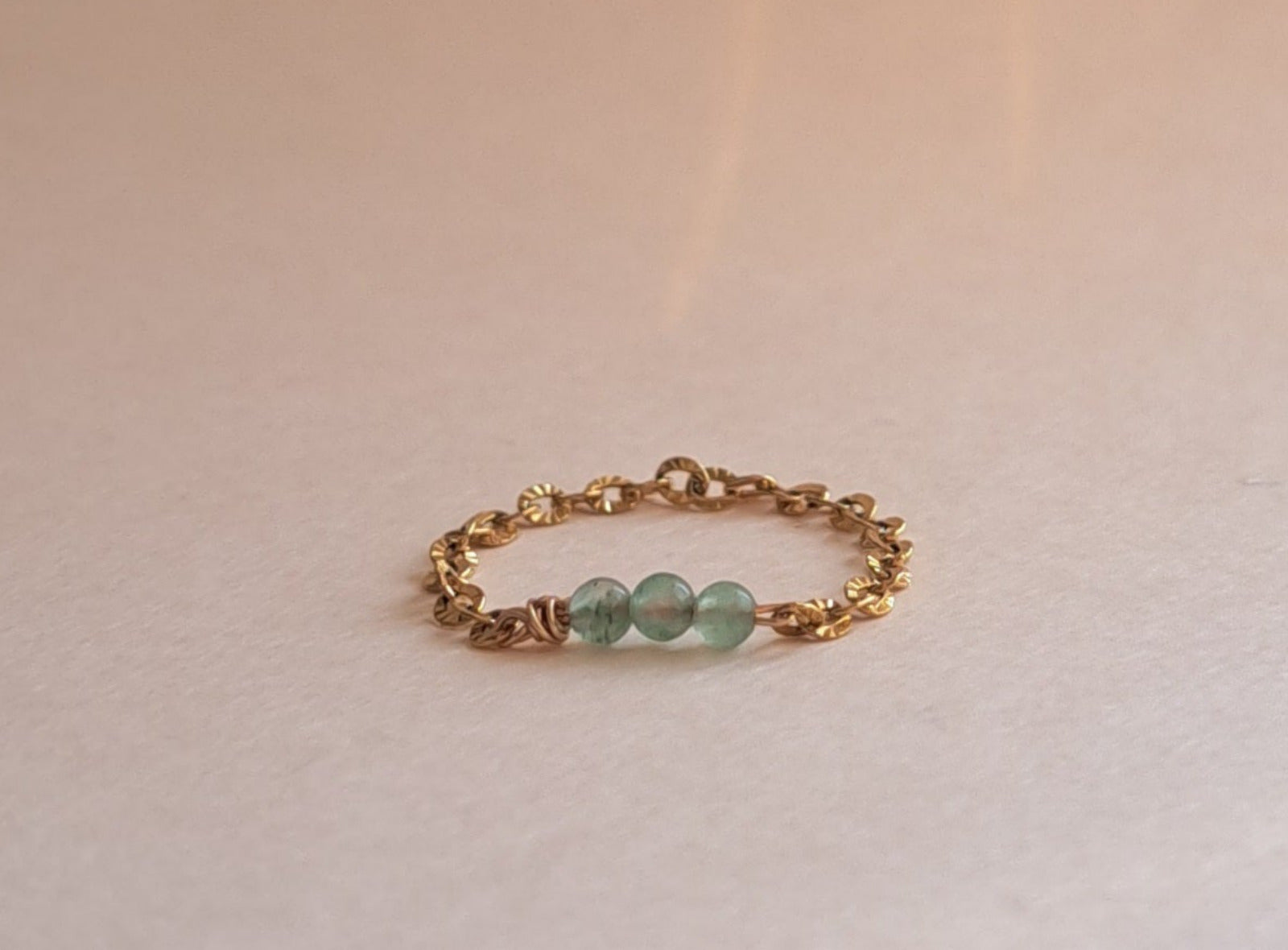 Bague en acier inoxydable, chaînette striée dorée et 3 perles d'aventurine verte de 3mm.