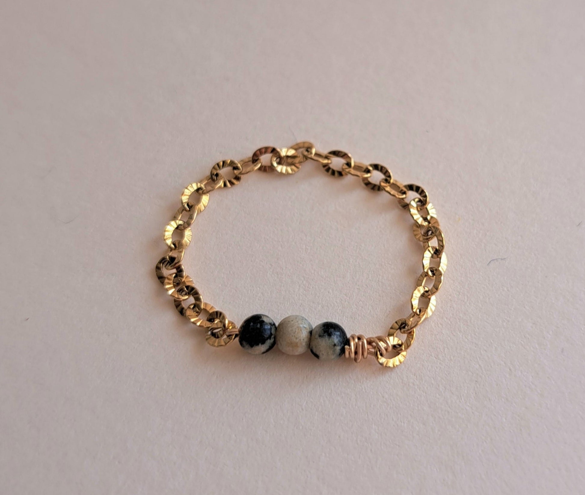 Bague en acier inoxydable, chaînette striée dorée et 3 perles de jaspe léopard de 3mm.