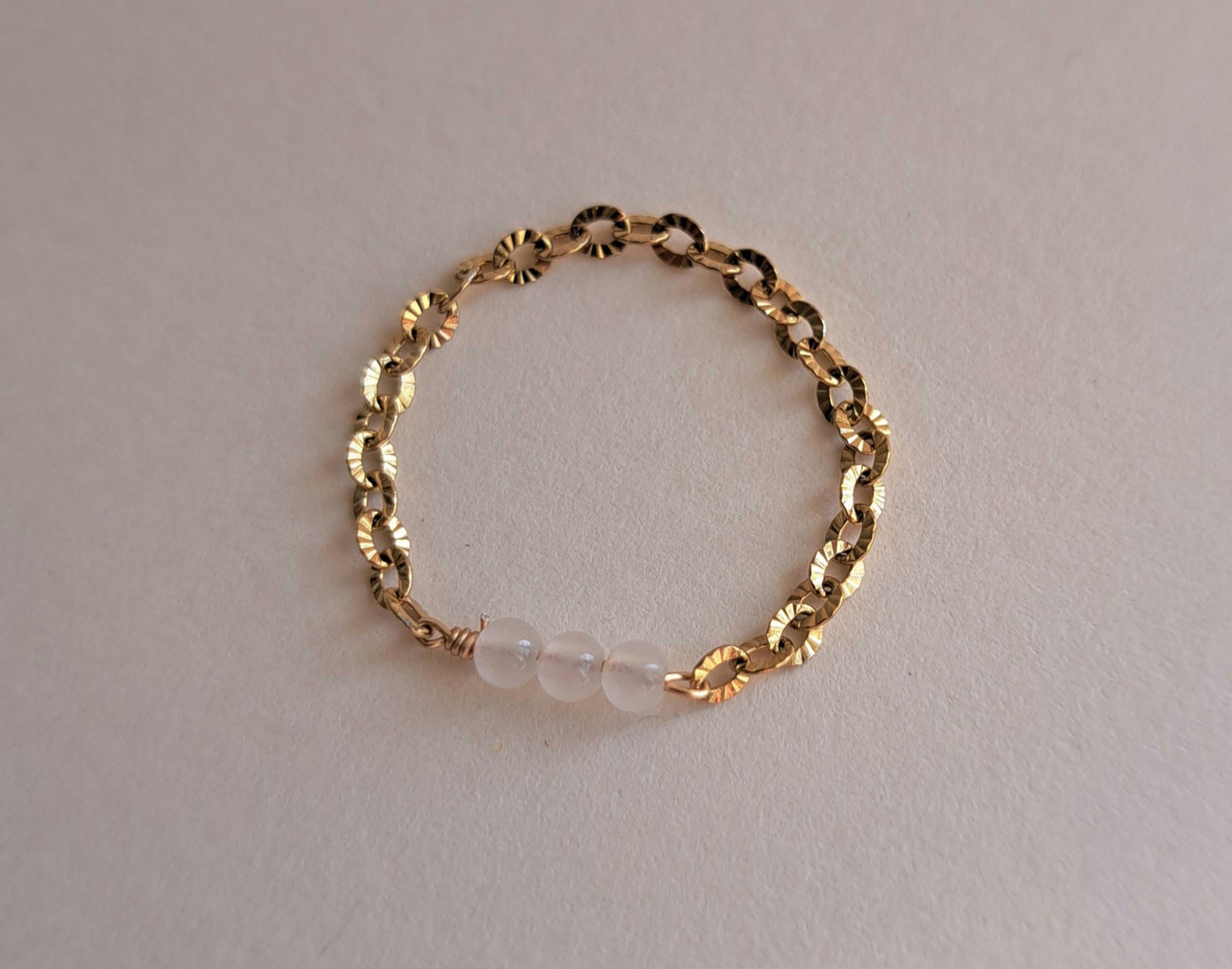 Bague en acier inoxydable, chaînette striée dorée et 3 perles de lune blanche 3mm.