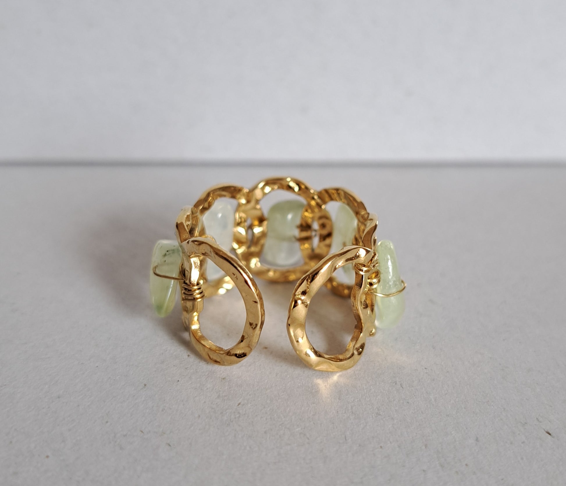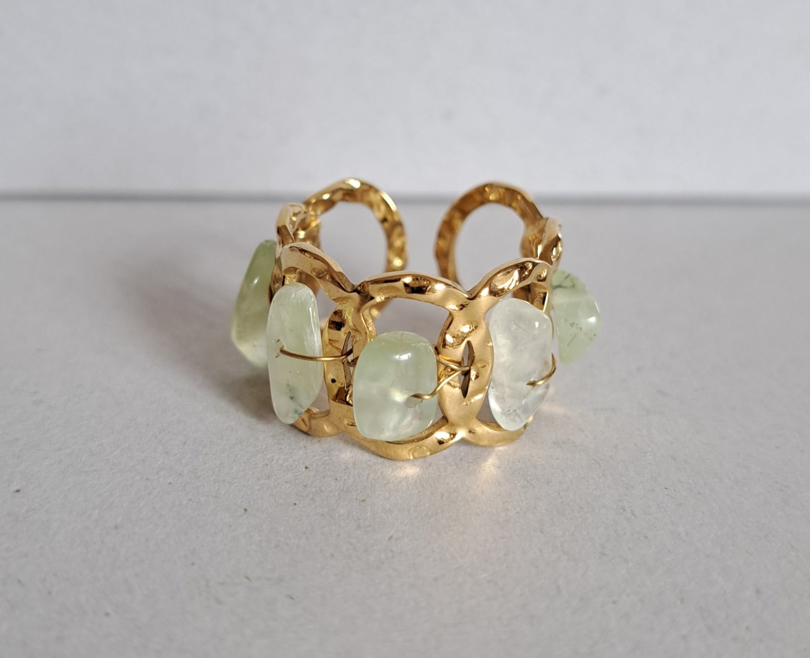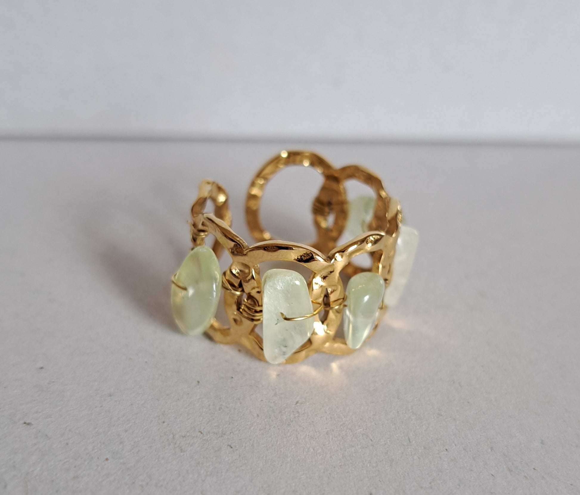 Adjustable stainless steel ring made of interlocking textured circles and natural prehnite stones.