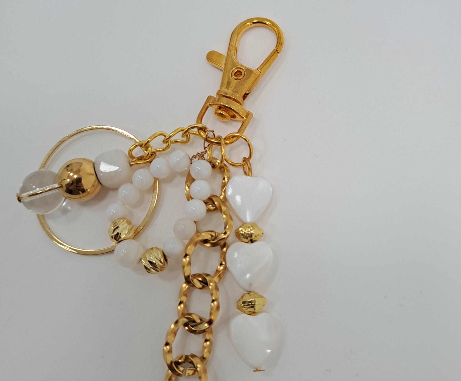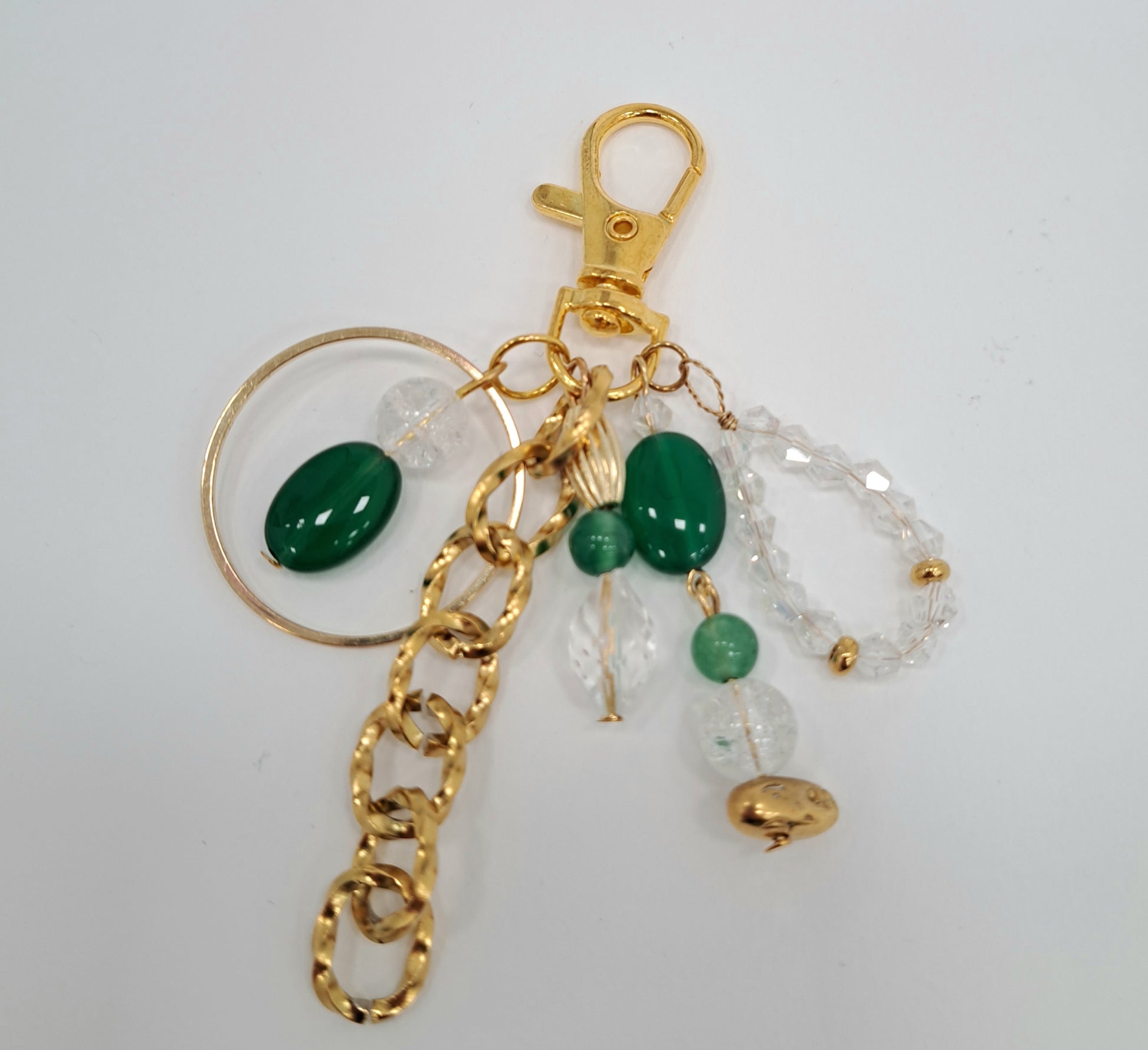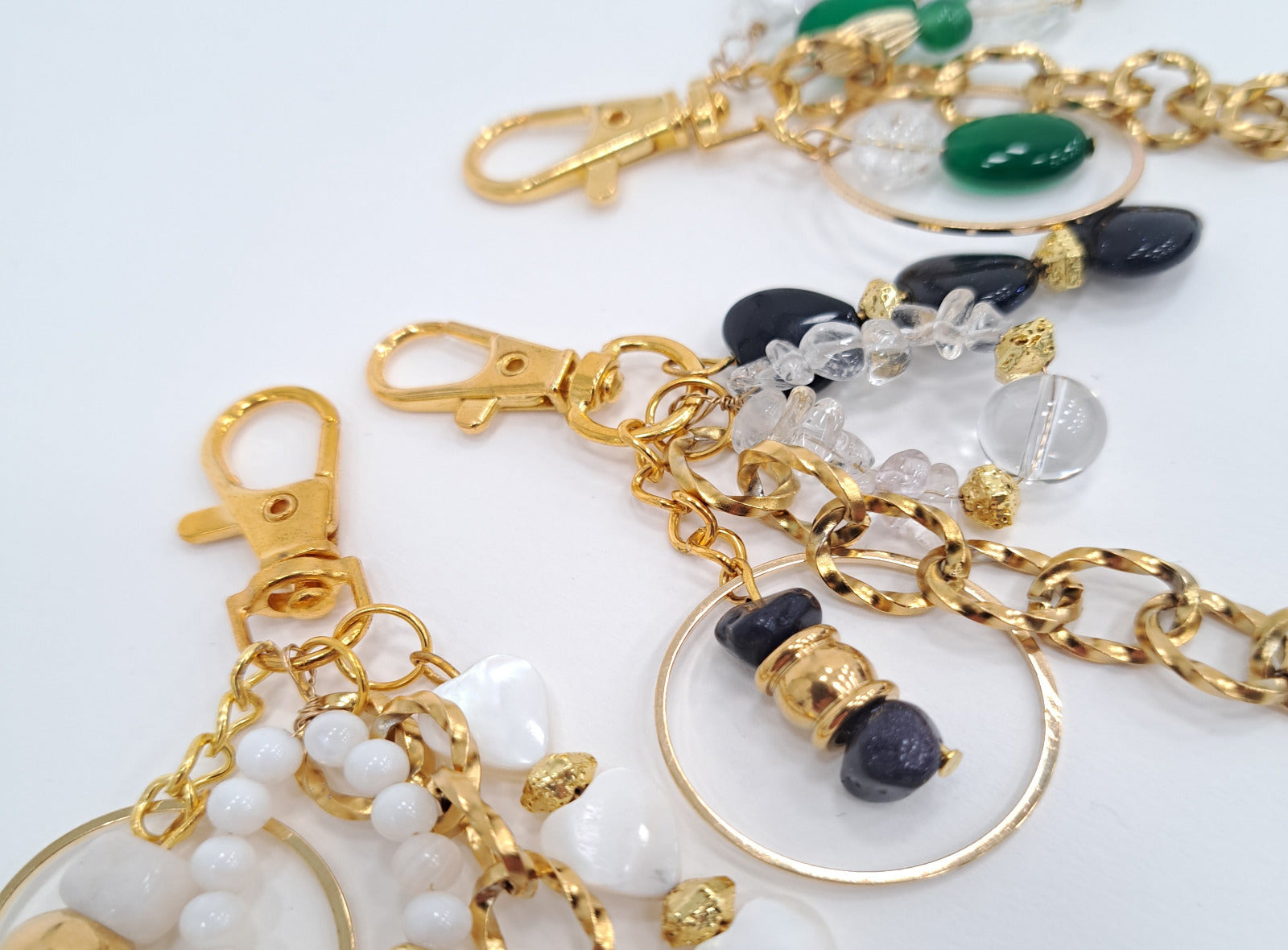 Bijou de sac composé d'un mousqueton doré, et de 4 éléments composés de pierres: