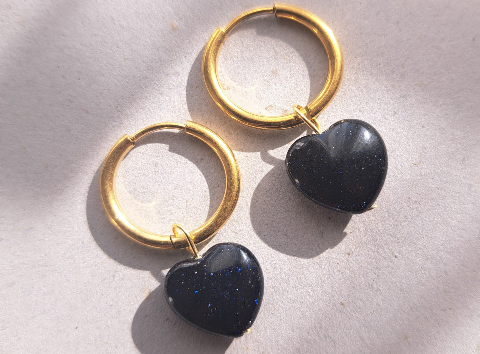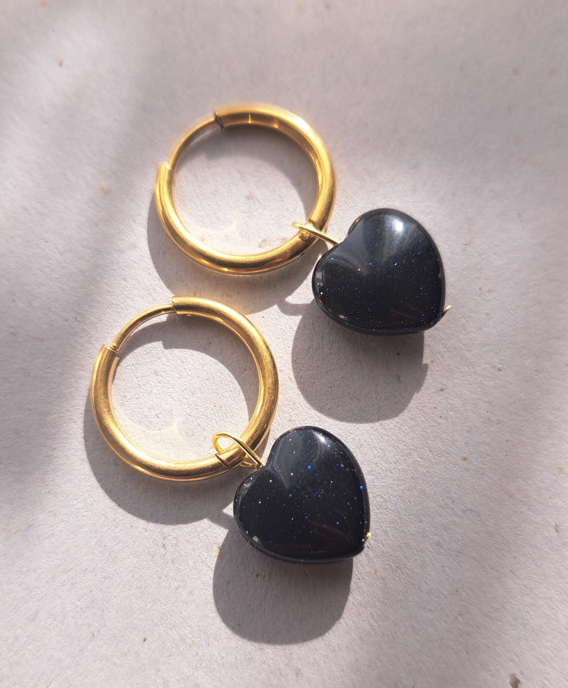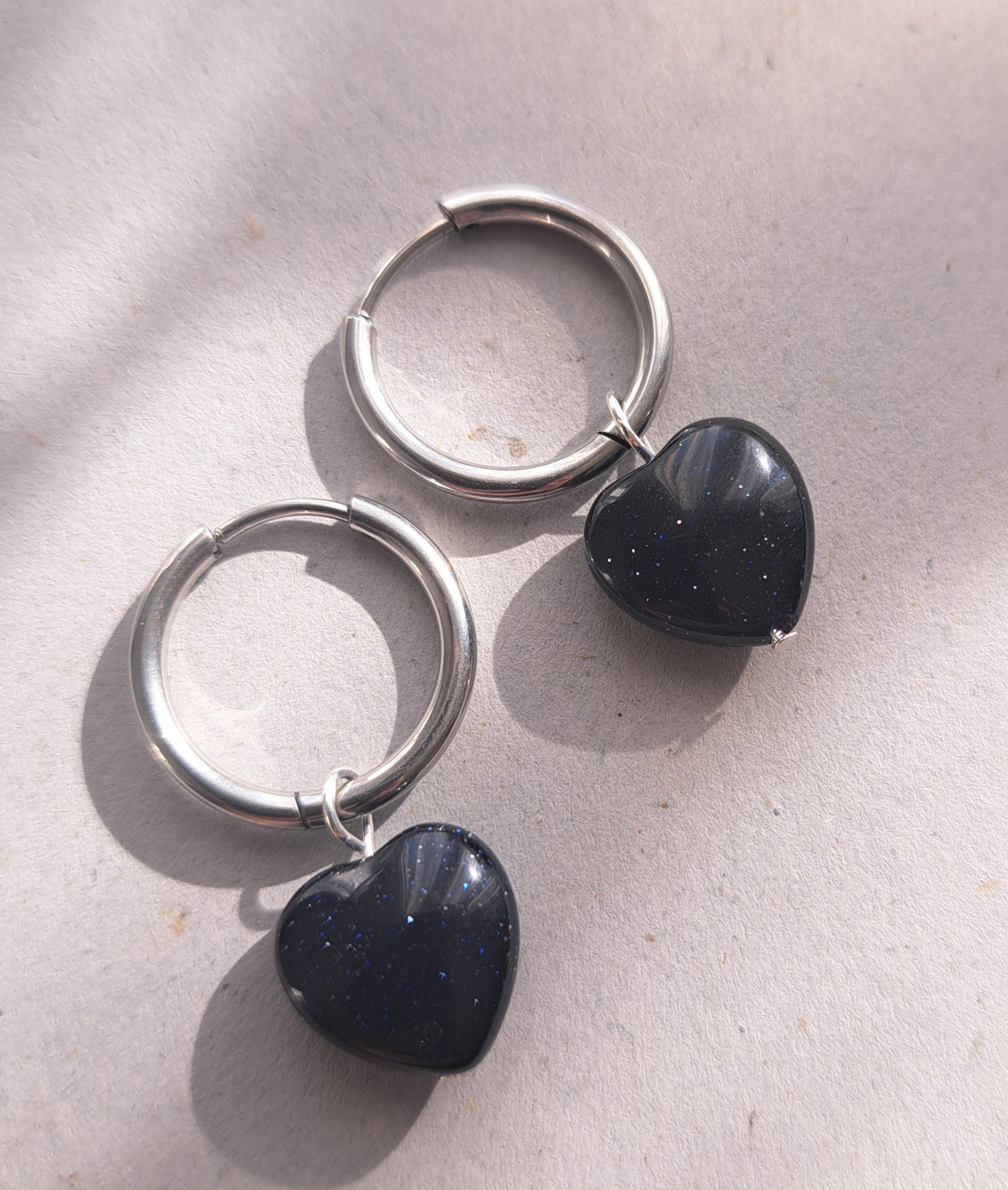 Boucles d'oreilles fines en acier inoxydable composées de 2 anneaux de 1,7cm de diamètre et de perles coeur en pierre Bluestone pailletée, bleu marine.