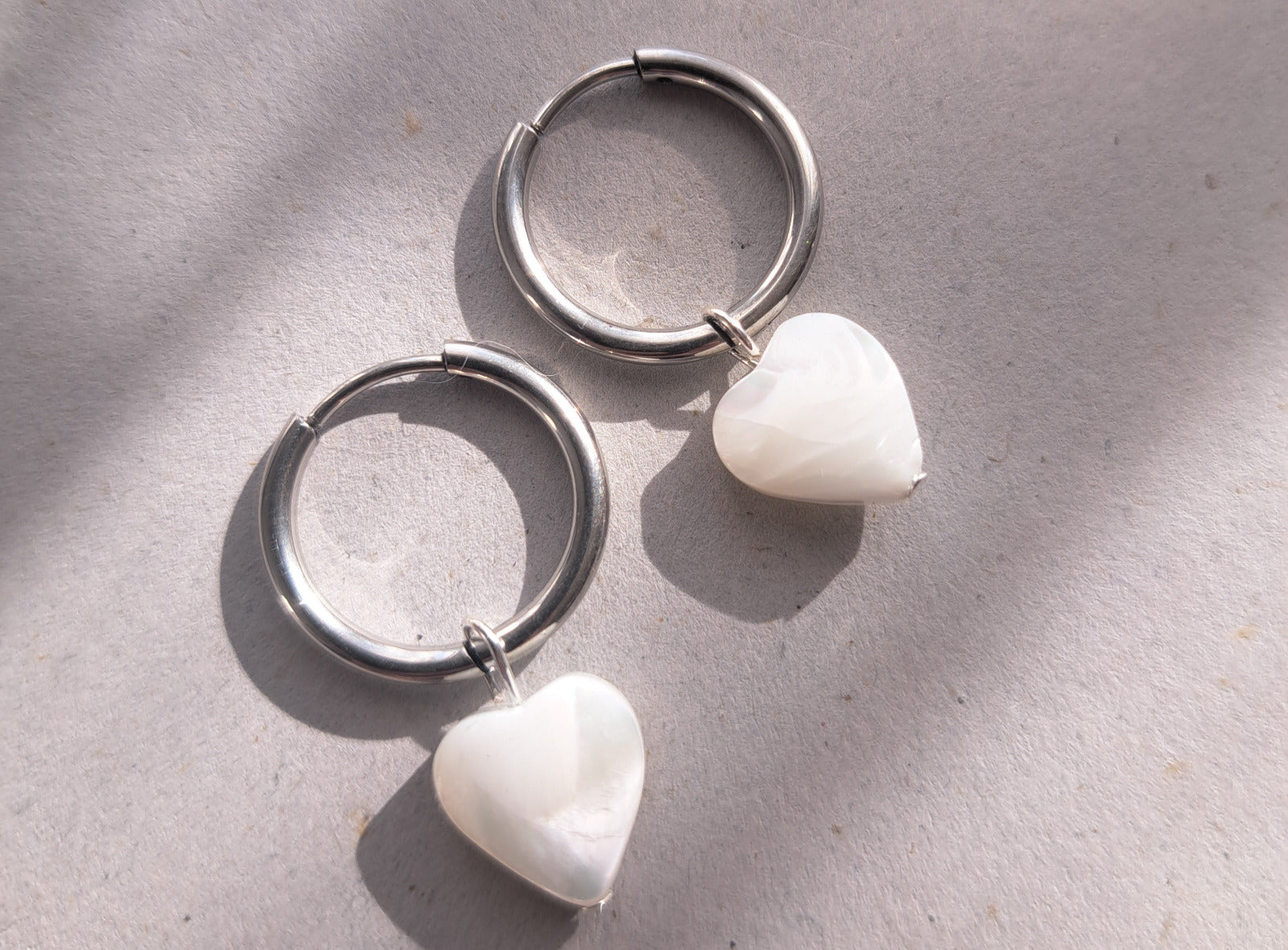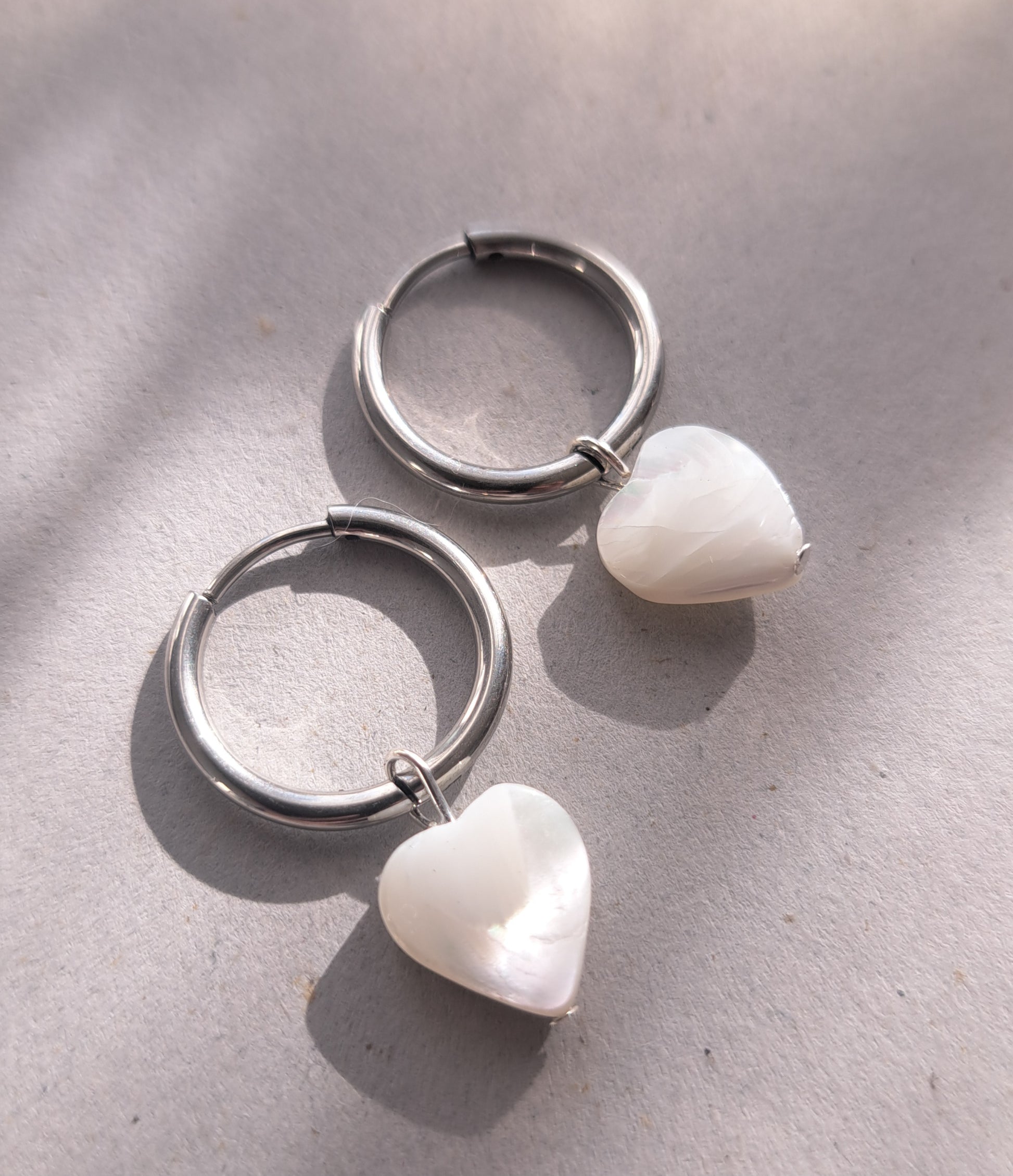Boucles d'oreilles fines en acier inoxydable composées de 2 anneaux de 1,7cm de diamètre et de perles de nacre coeur.