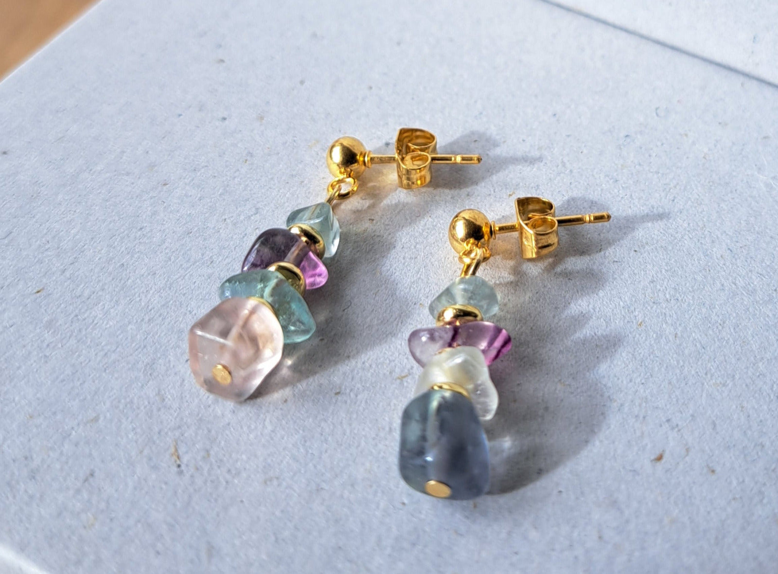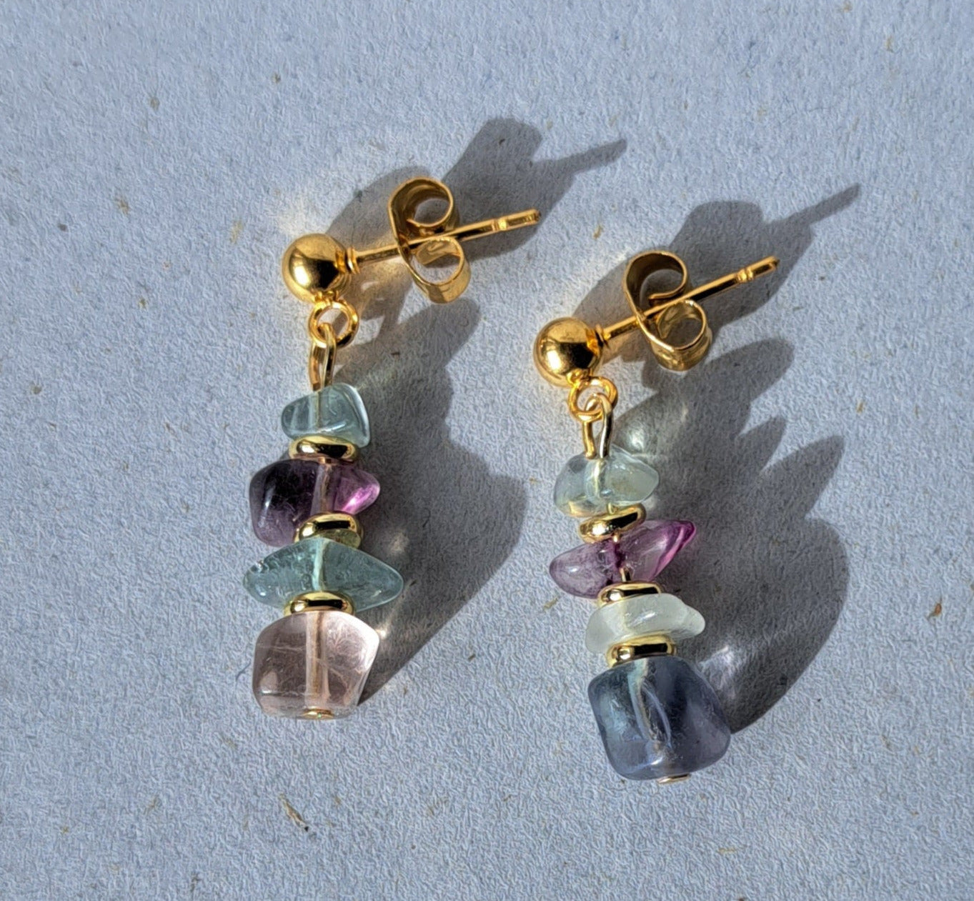 Fine earrings composed of a gold-plated stainless steel stud attachment, multi-colored fluorite beads and flat gold-plated beads.