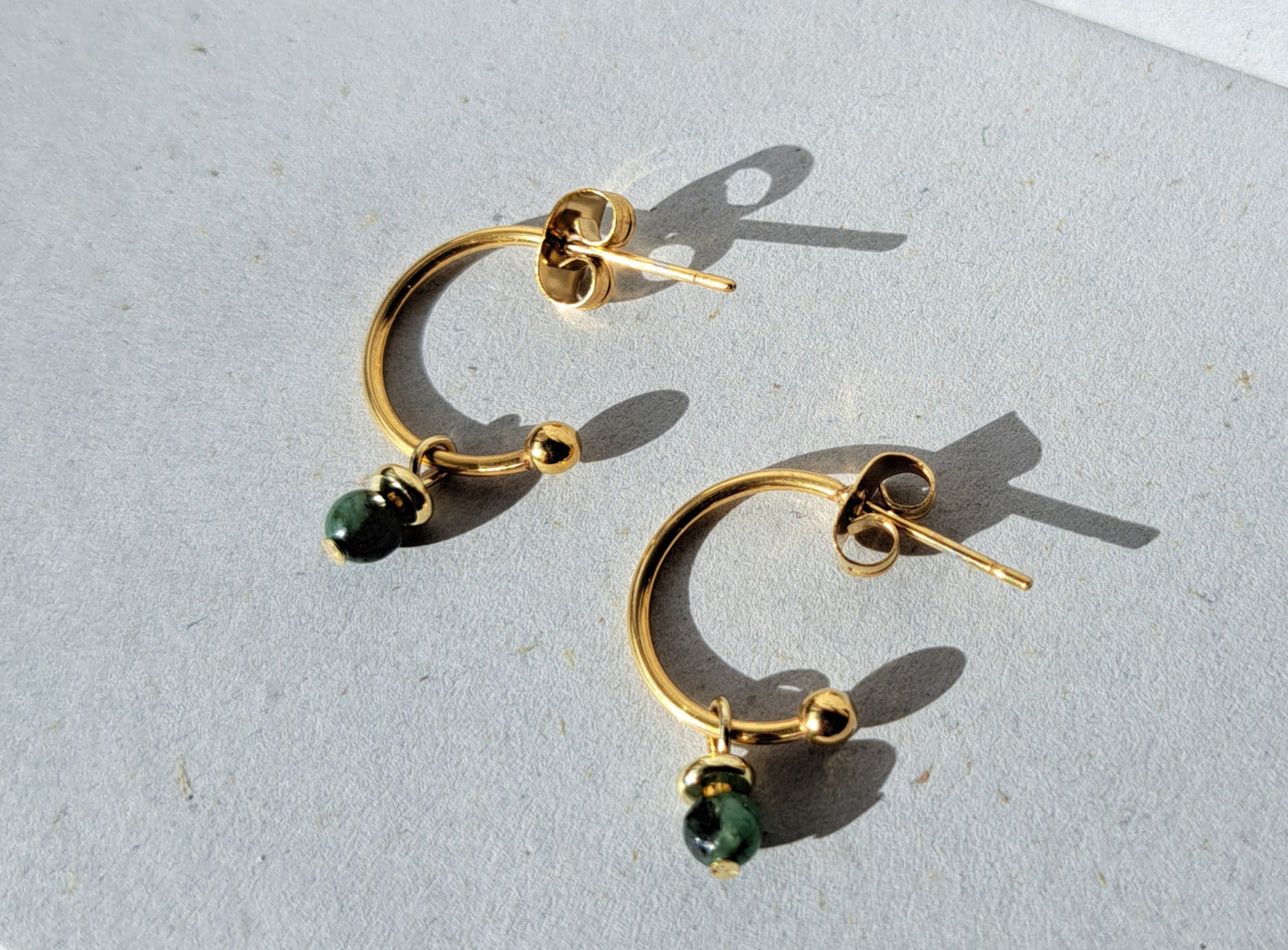 Fine earrings composed of a gold stainless steel hoop clip, emerald beads and flat gold beads.