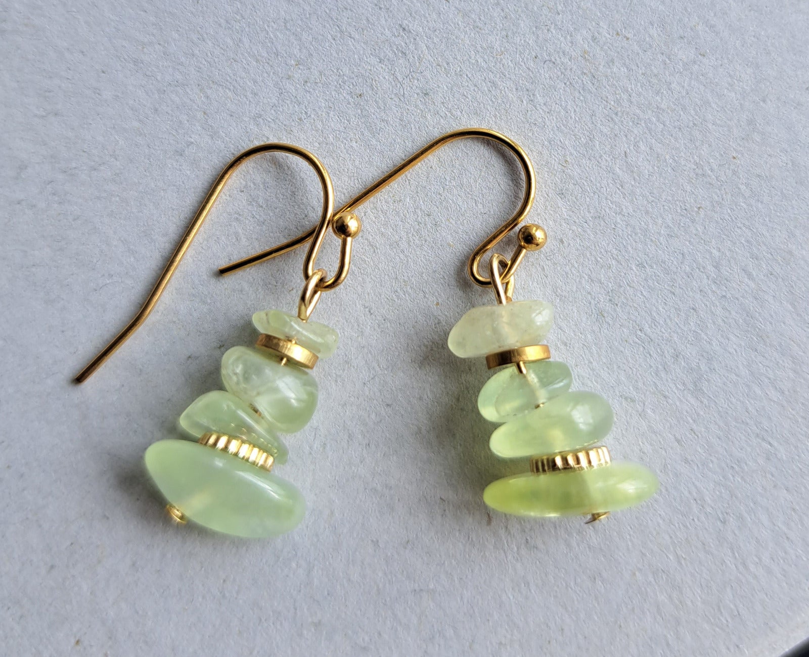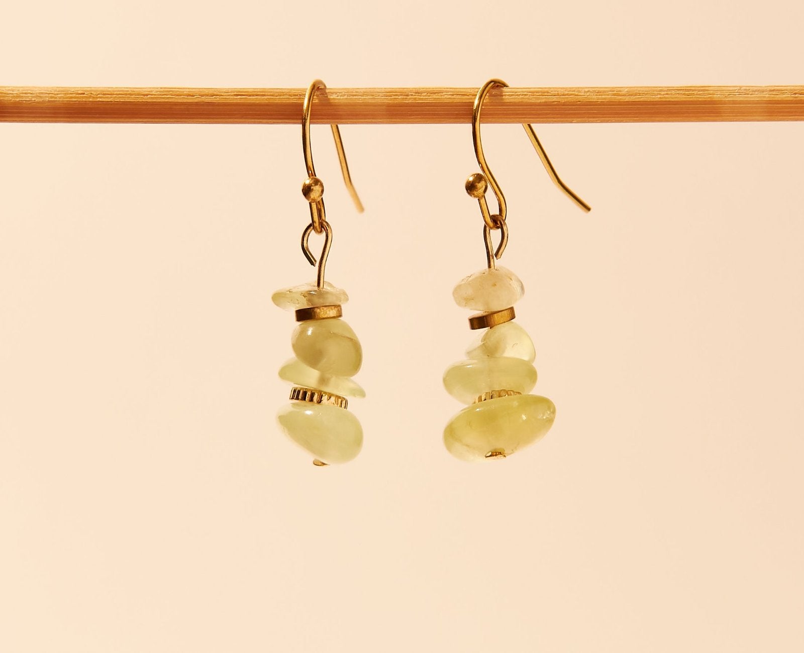 Earrings composed of a gold-plated stainless steel attachment and sea green prehnite stones and gold-plated rings.