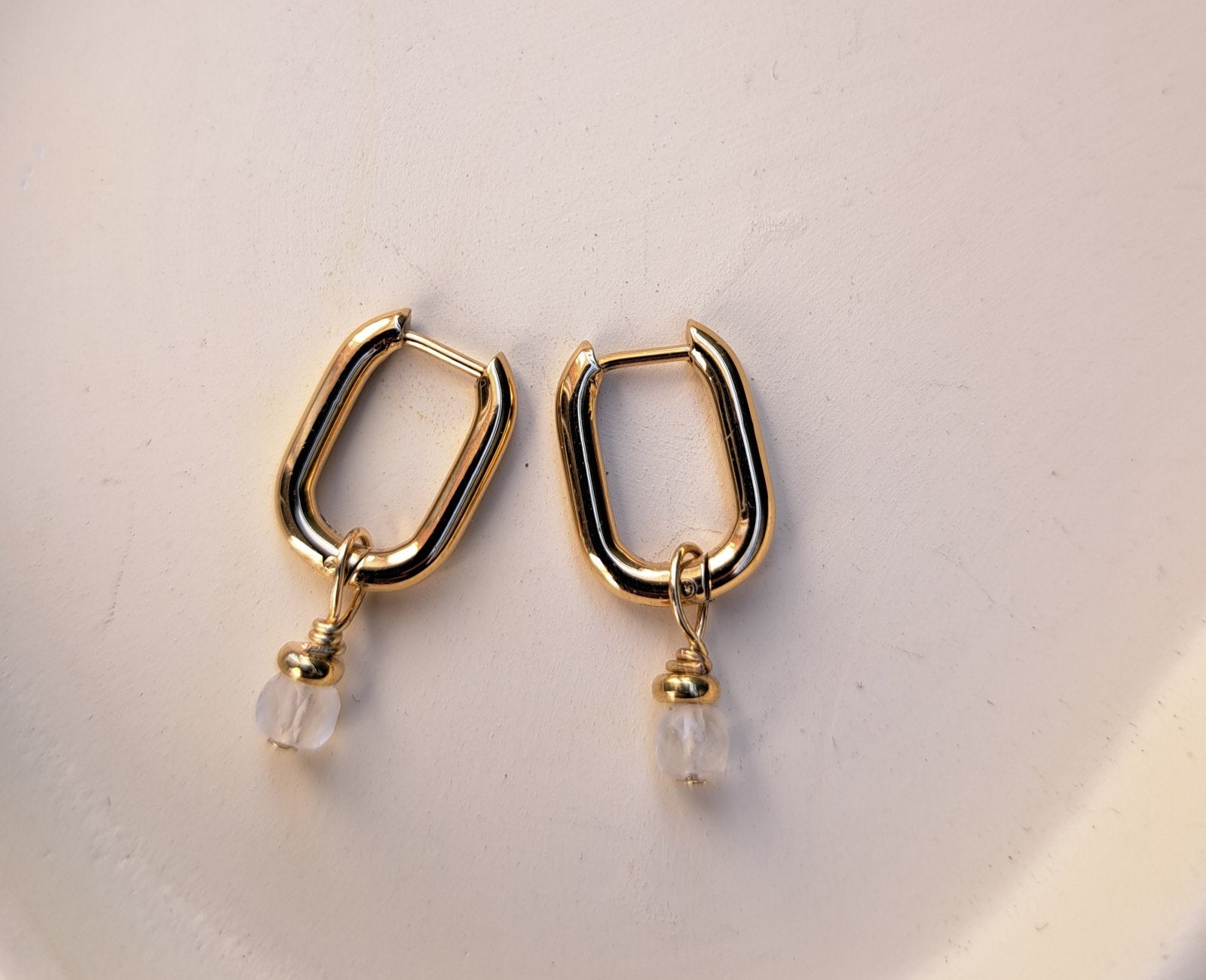 Boucles d'oreilles fines composées d'une base rectangulaire arrondie en acier inoxydable doré ou argenté, de perles de lune facettées et de perles plates.