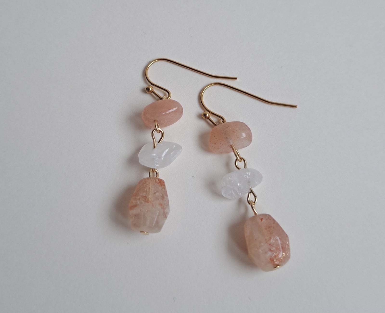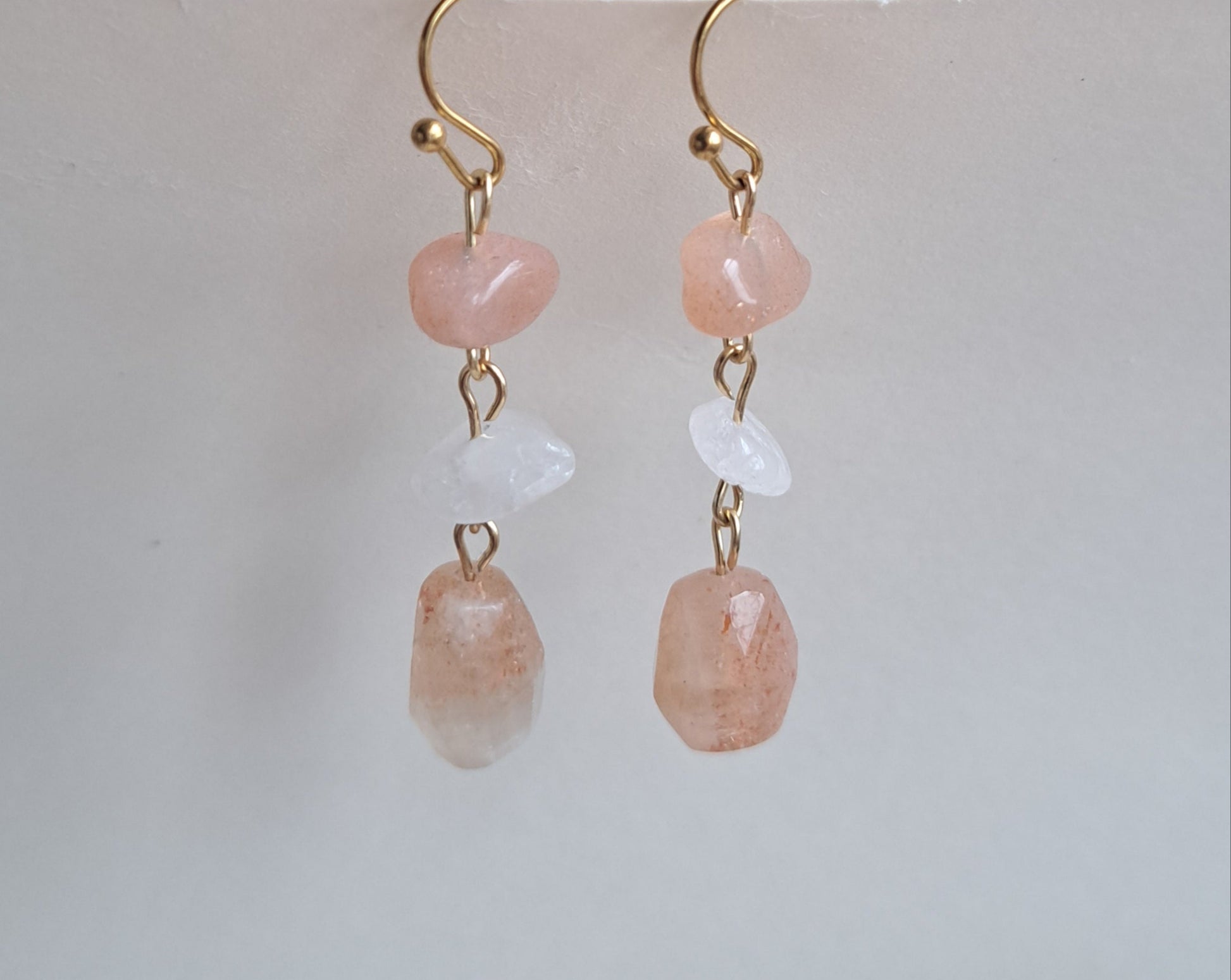 Boucles d'oreilles fines composées d'une attache pendante dorée en acier inoxydable, de 2 perles de soleil dans les tons corail/nude et d'une perle de cristal de roche blanche irisée.