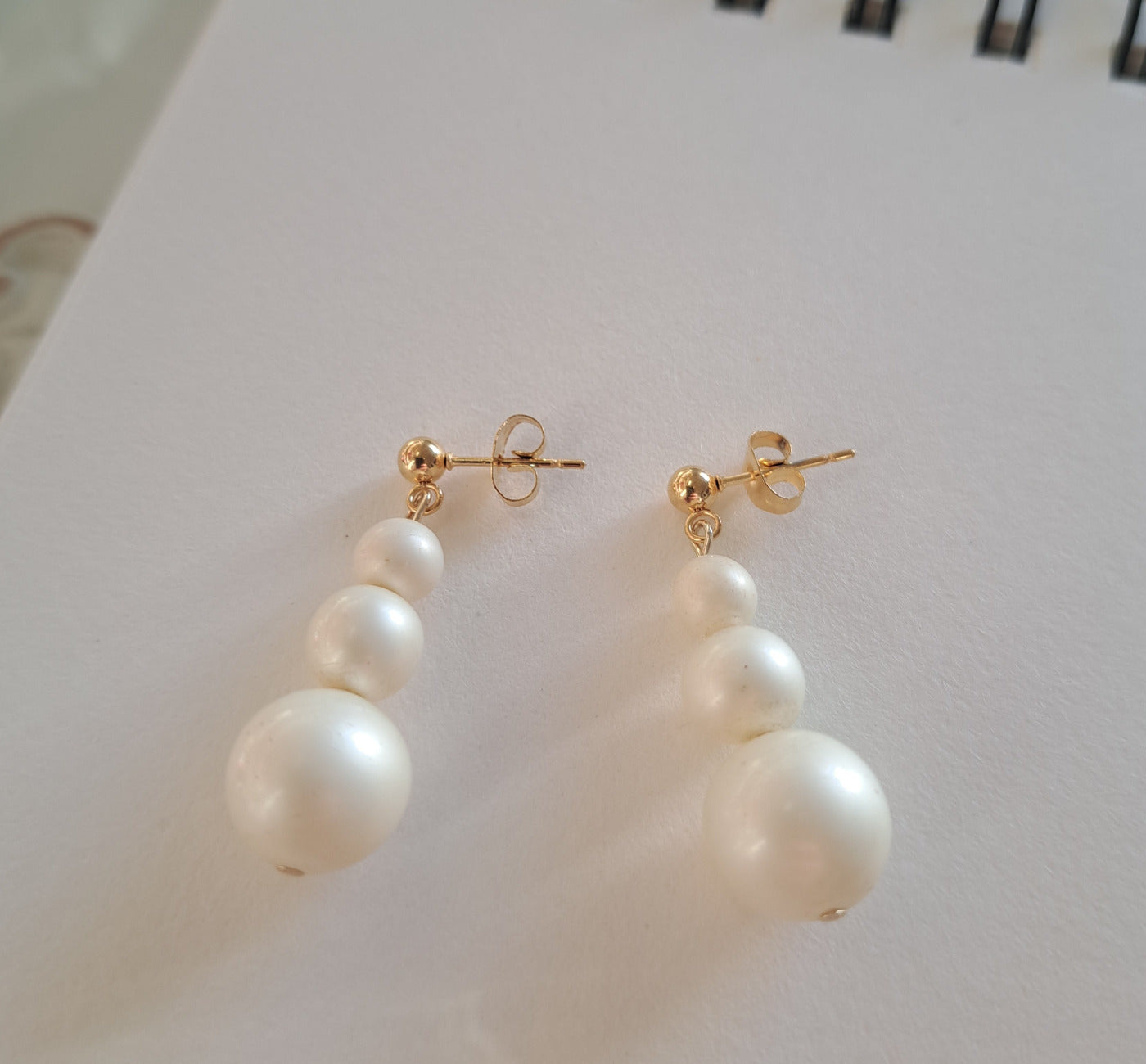 These upcycled earrings consist of 3 round ecru pearls and a gold-plated stud attachment.