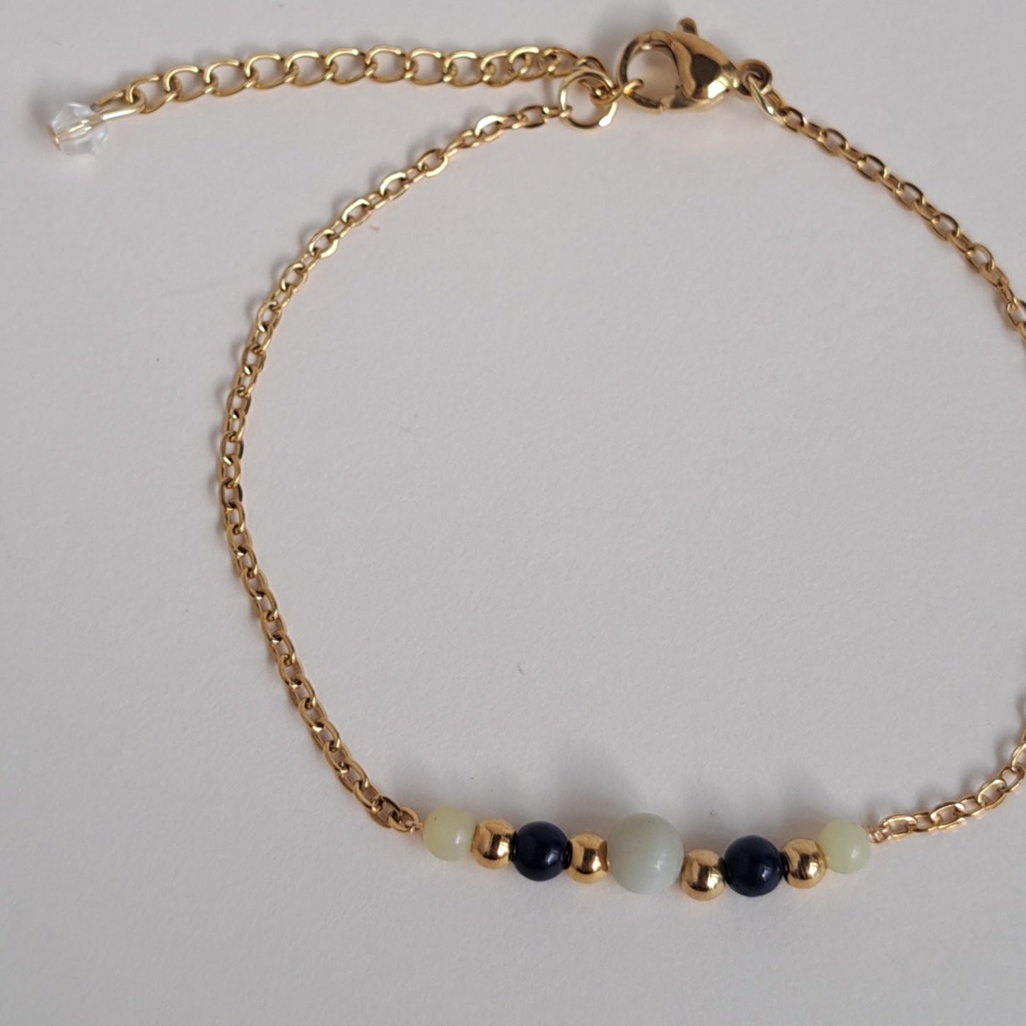 Bracelet fin composé d'une chaînette dorée en acier inoxydable, de perles dorées et de pierres naturelles.