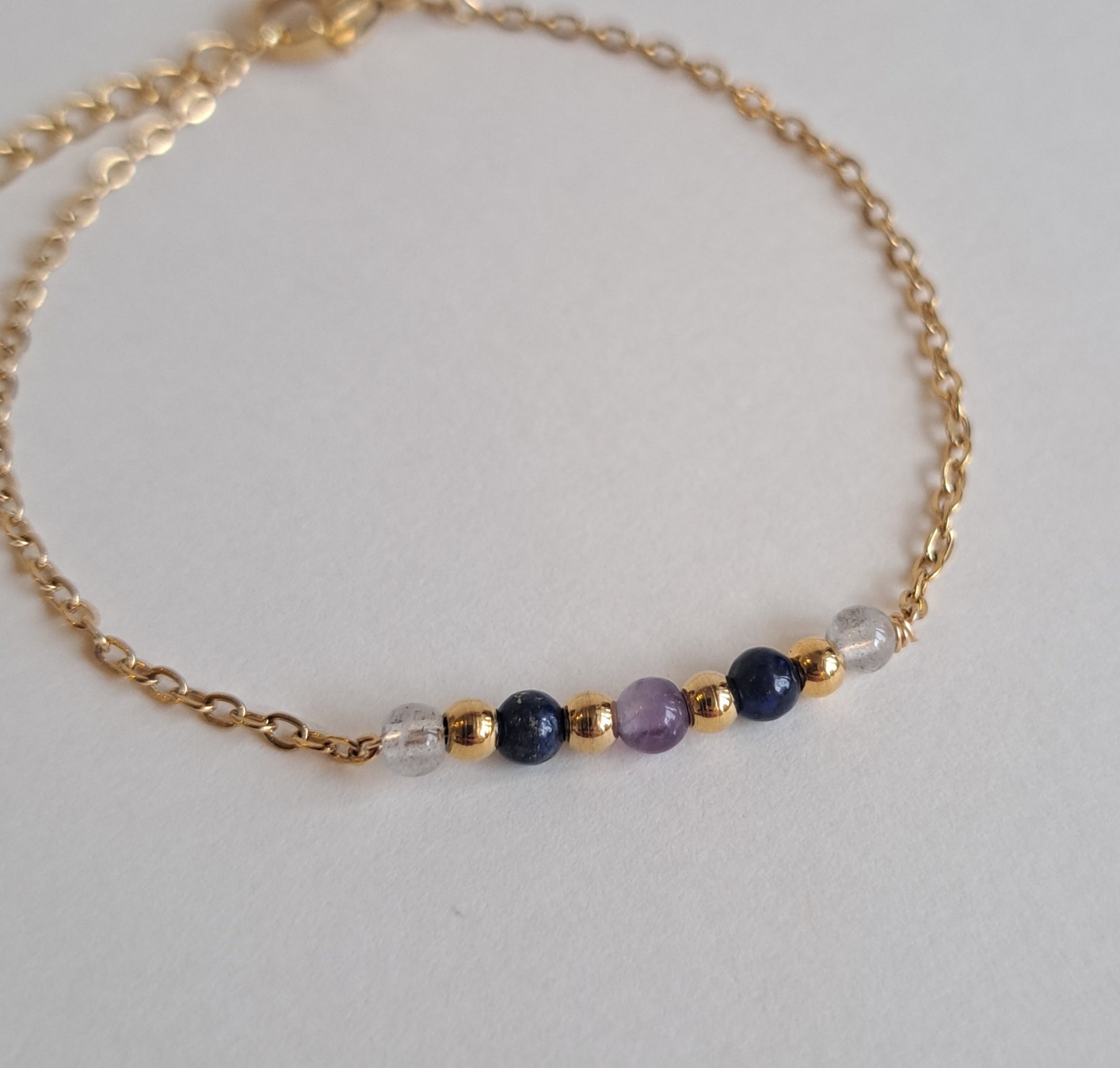 Bracelet fin composé d'une chaînette dorée en acier inoxydable, de perles dorées et de pierres naturelles.
