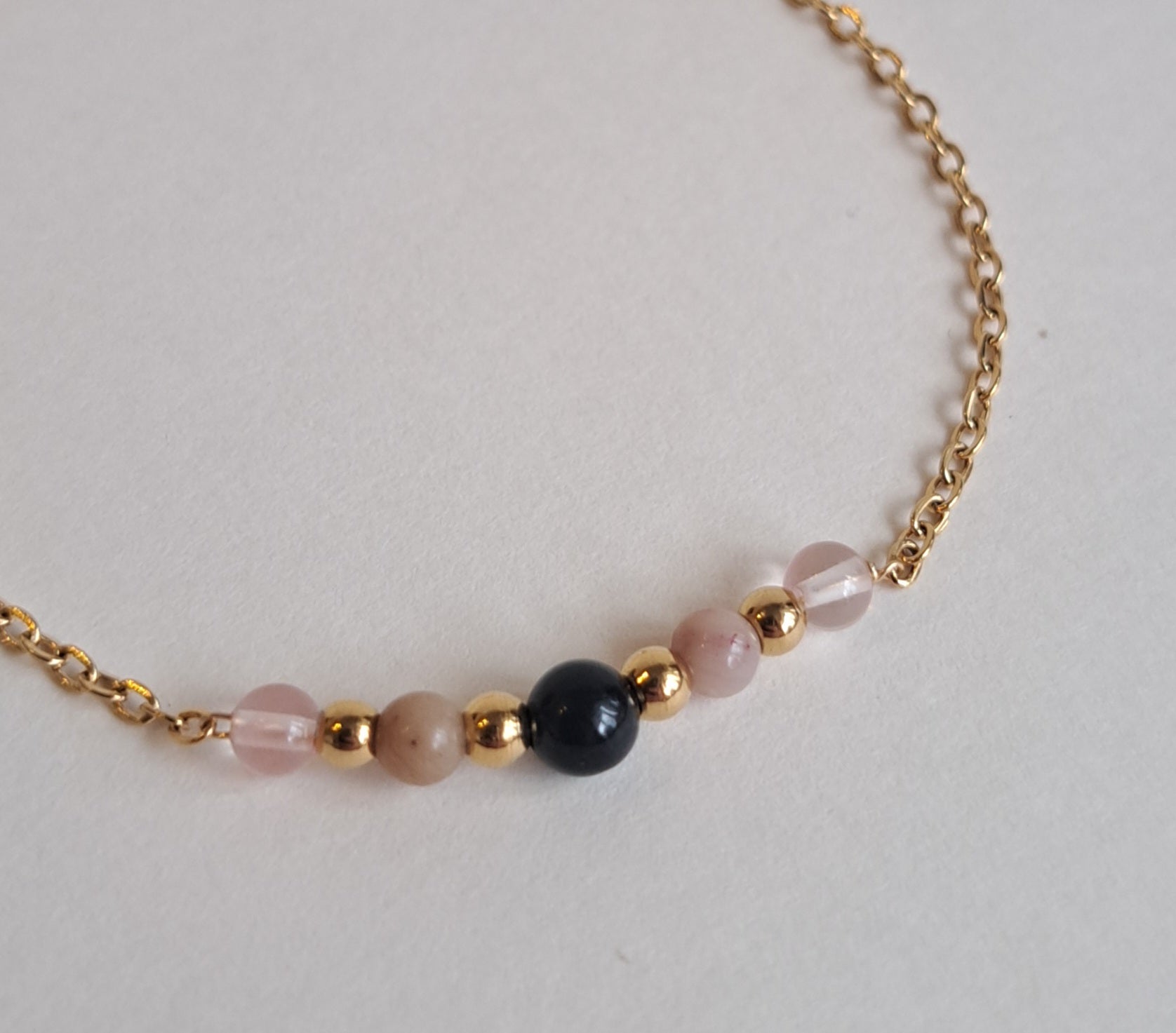 Le bracelet du Taureau se compose de pierres de Quartz rose, Rhodochrosite et Tourmaline.