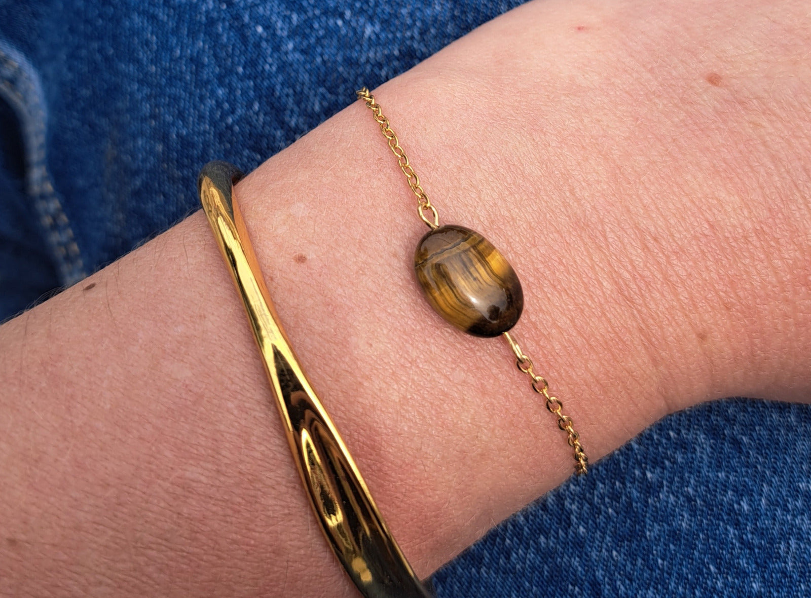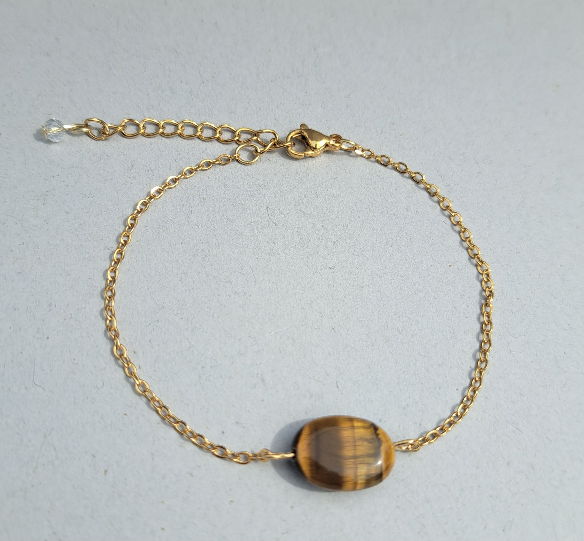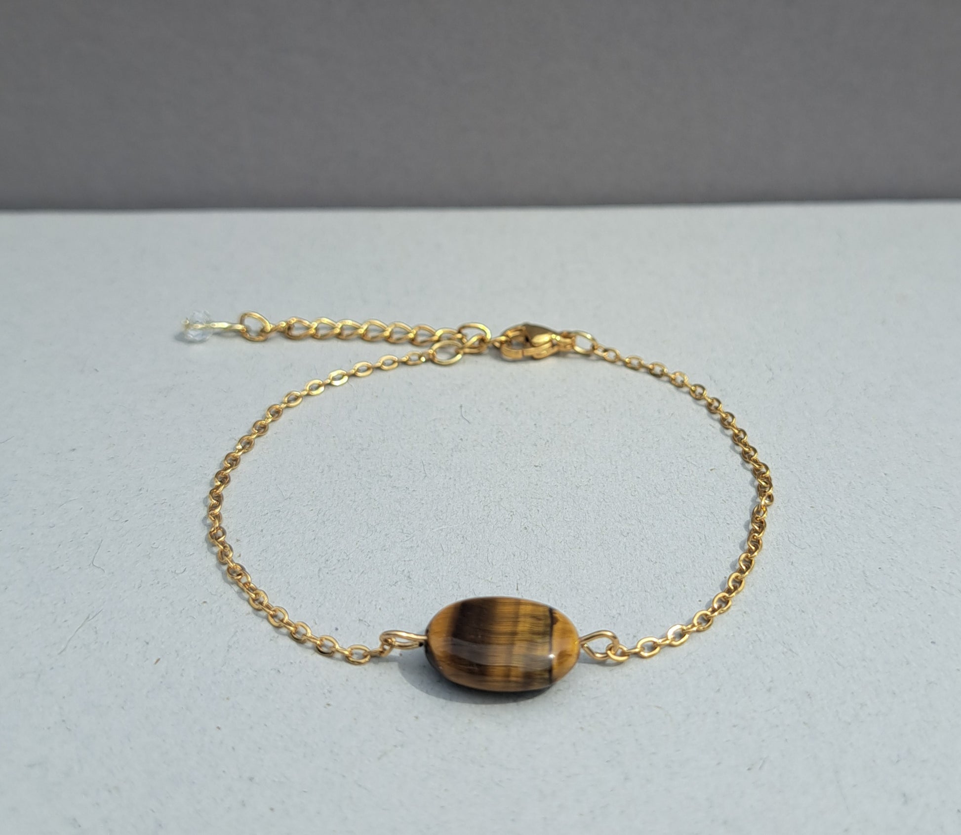 Fine bracelet composed of a golden stainless steel chain and a flat oval tiger's eye bead in brown tones.