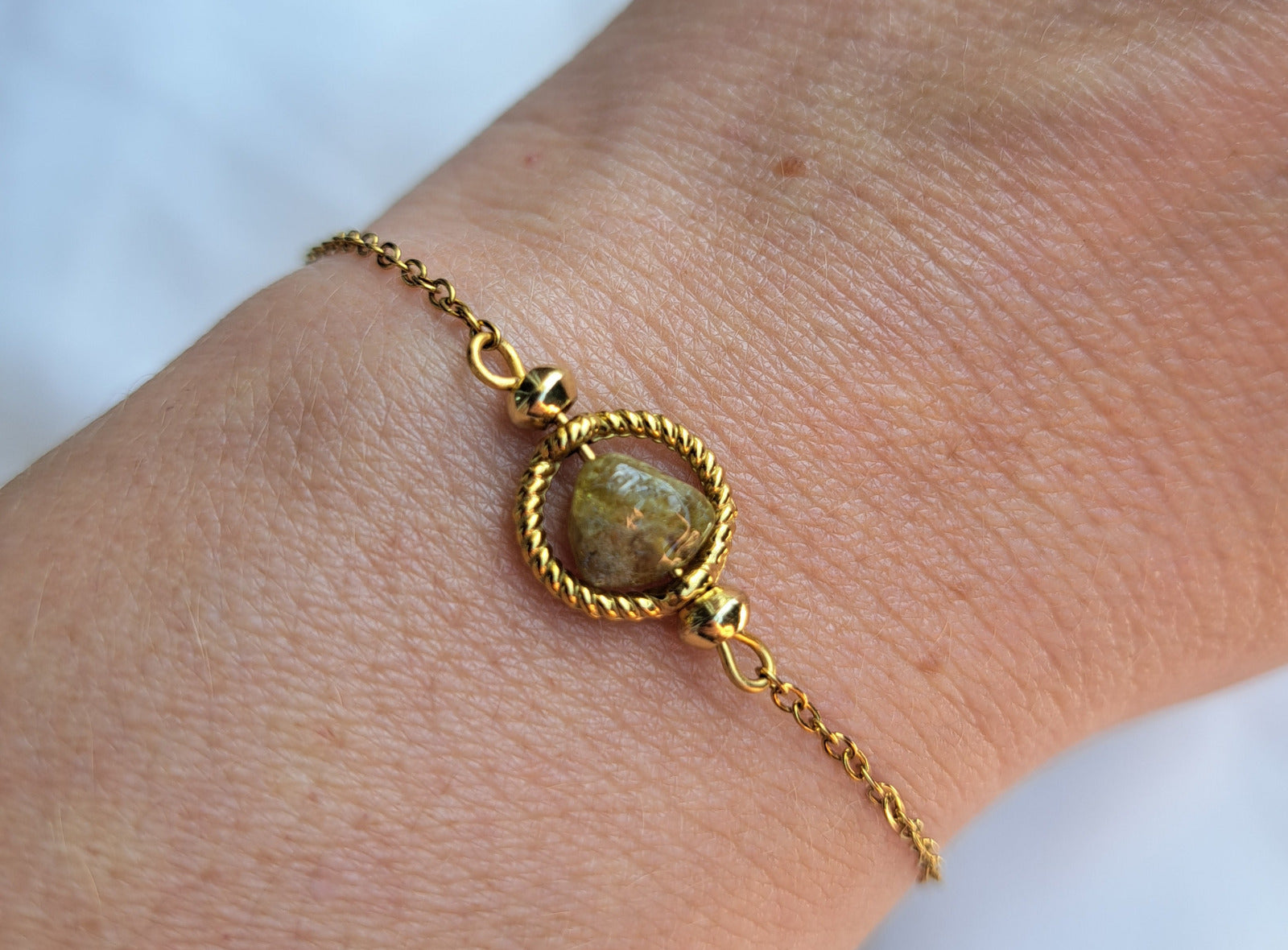 Bracelet fin composé d'une chaînette dorée en acier inoxydable, d'une applique ronde striée, de 2 petites perles dorées et d'une pierre de grenat vert: tons kaki