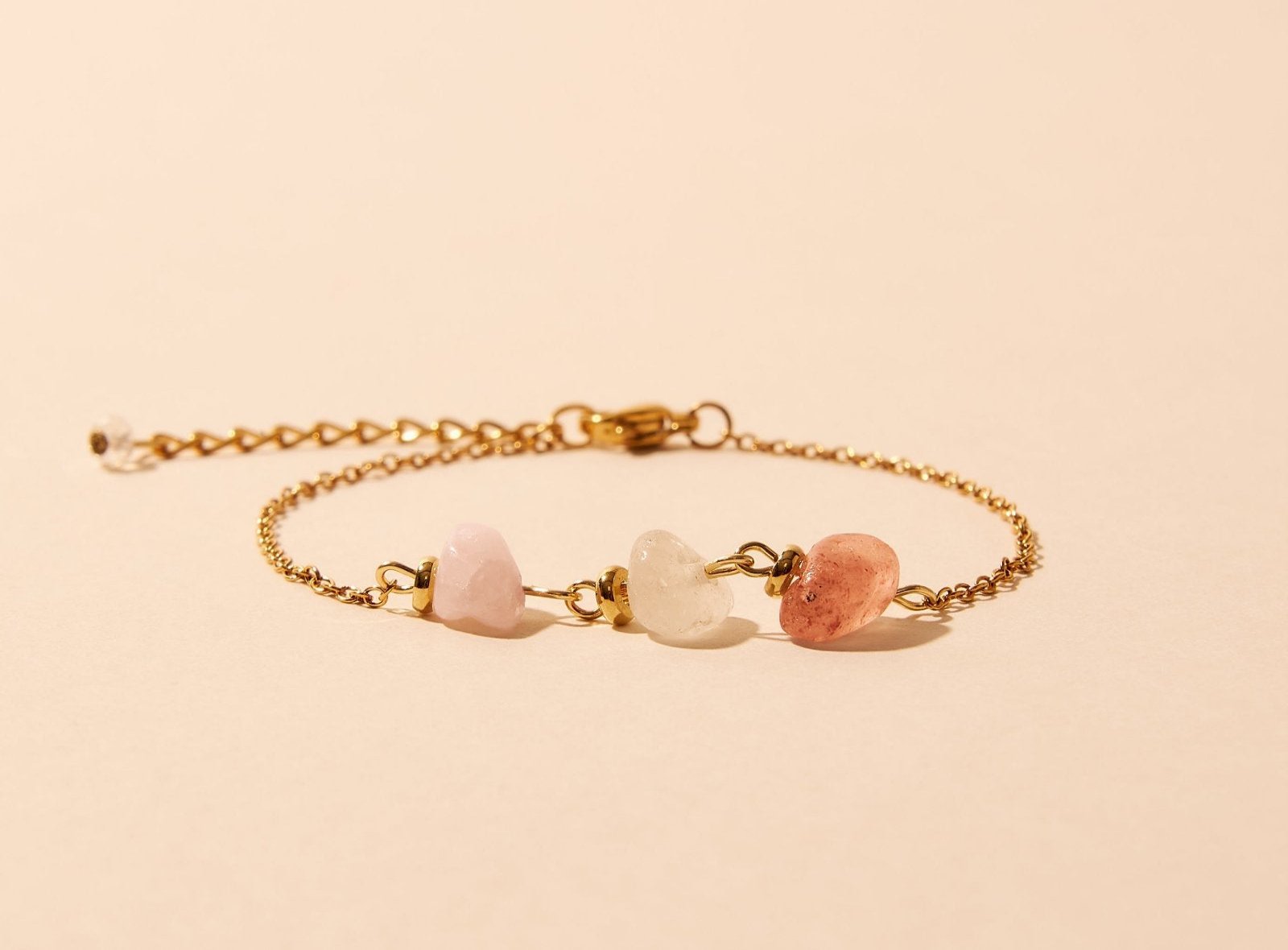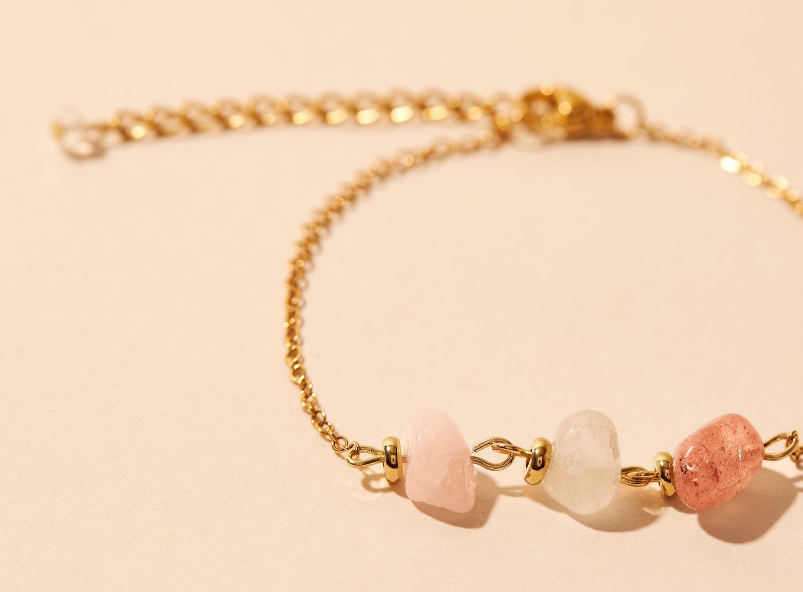 Fine bracelet composed of a golden stainless steel chain and 3 quartz beads: clear quartz (rock crystal), rose quartz and strawberry quartz and 3 golden spacer beads.