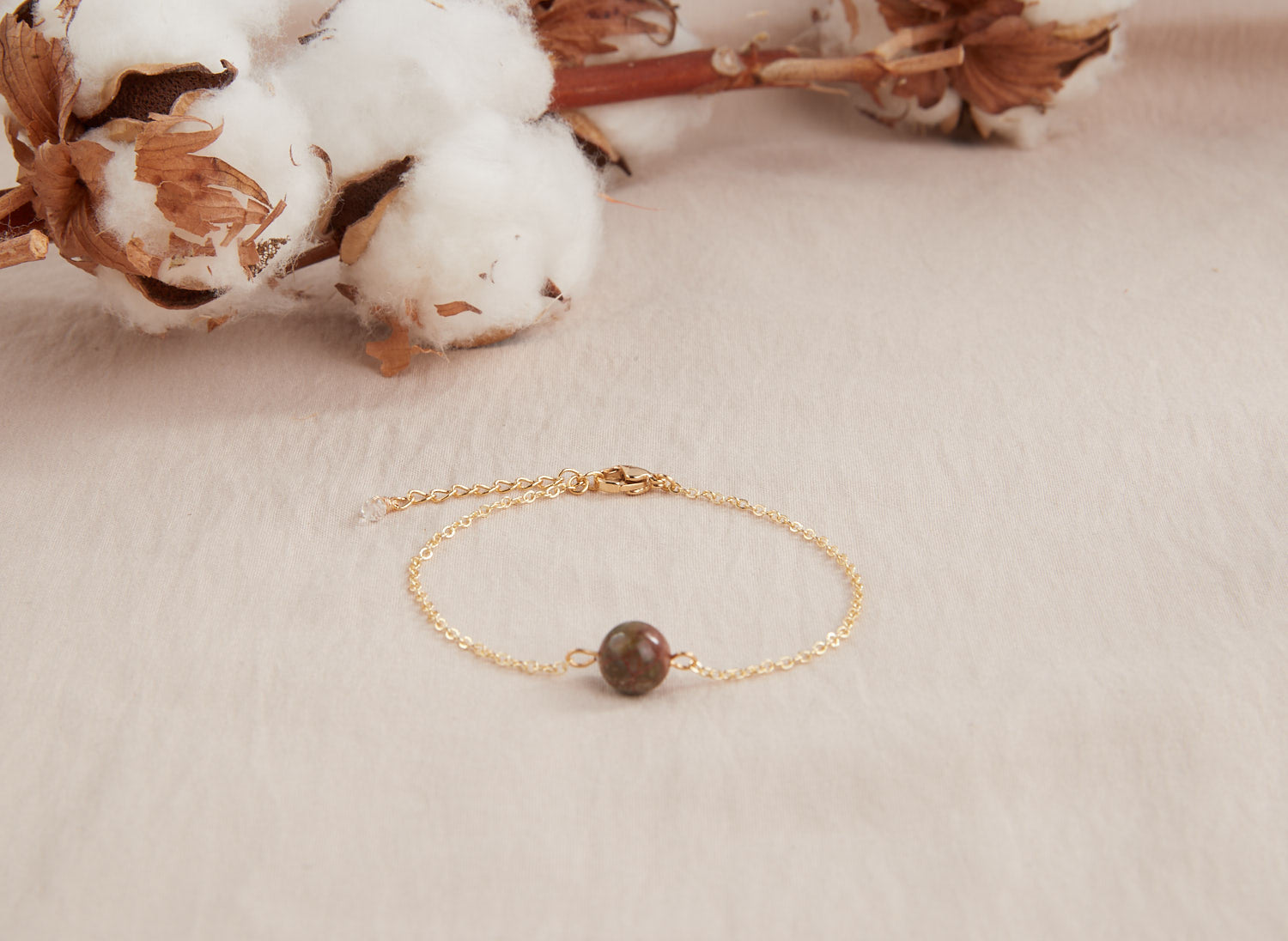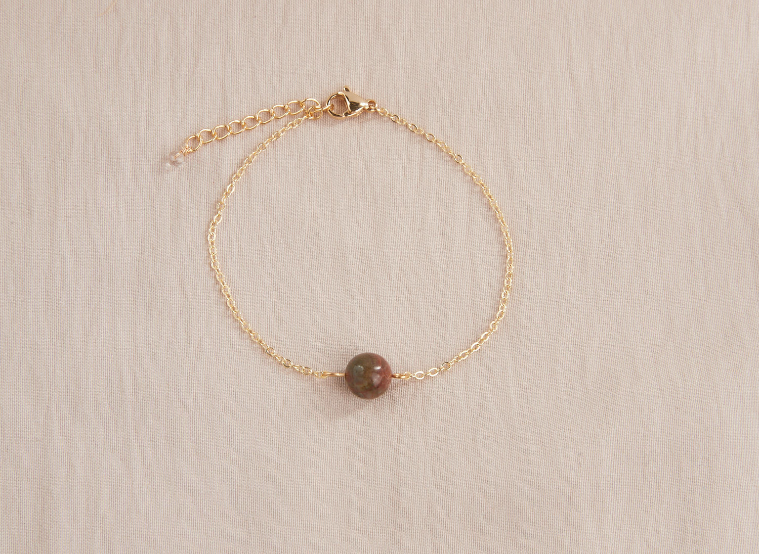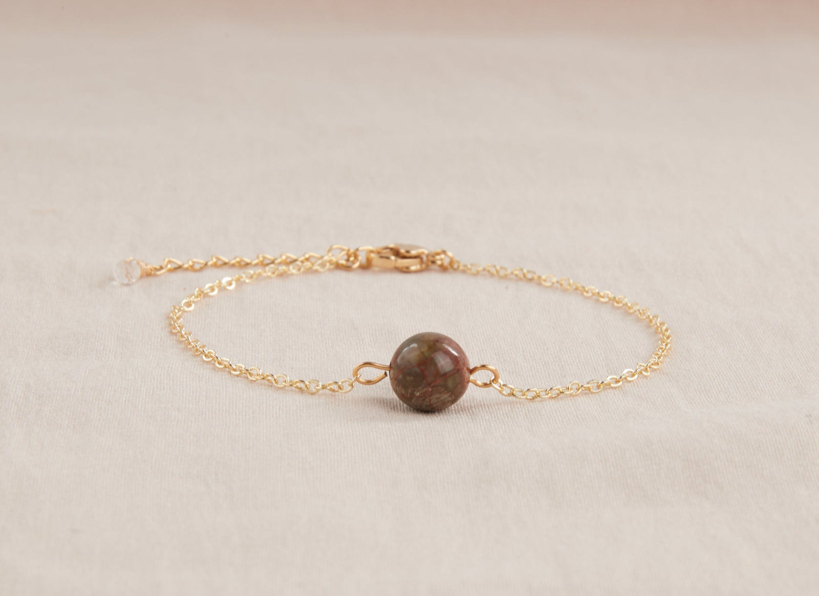 Fine bracelet composed of a silver stainless steel chain and an 8mm beige/brown ocean jasper bead.