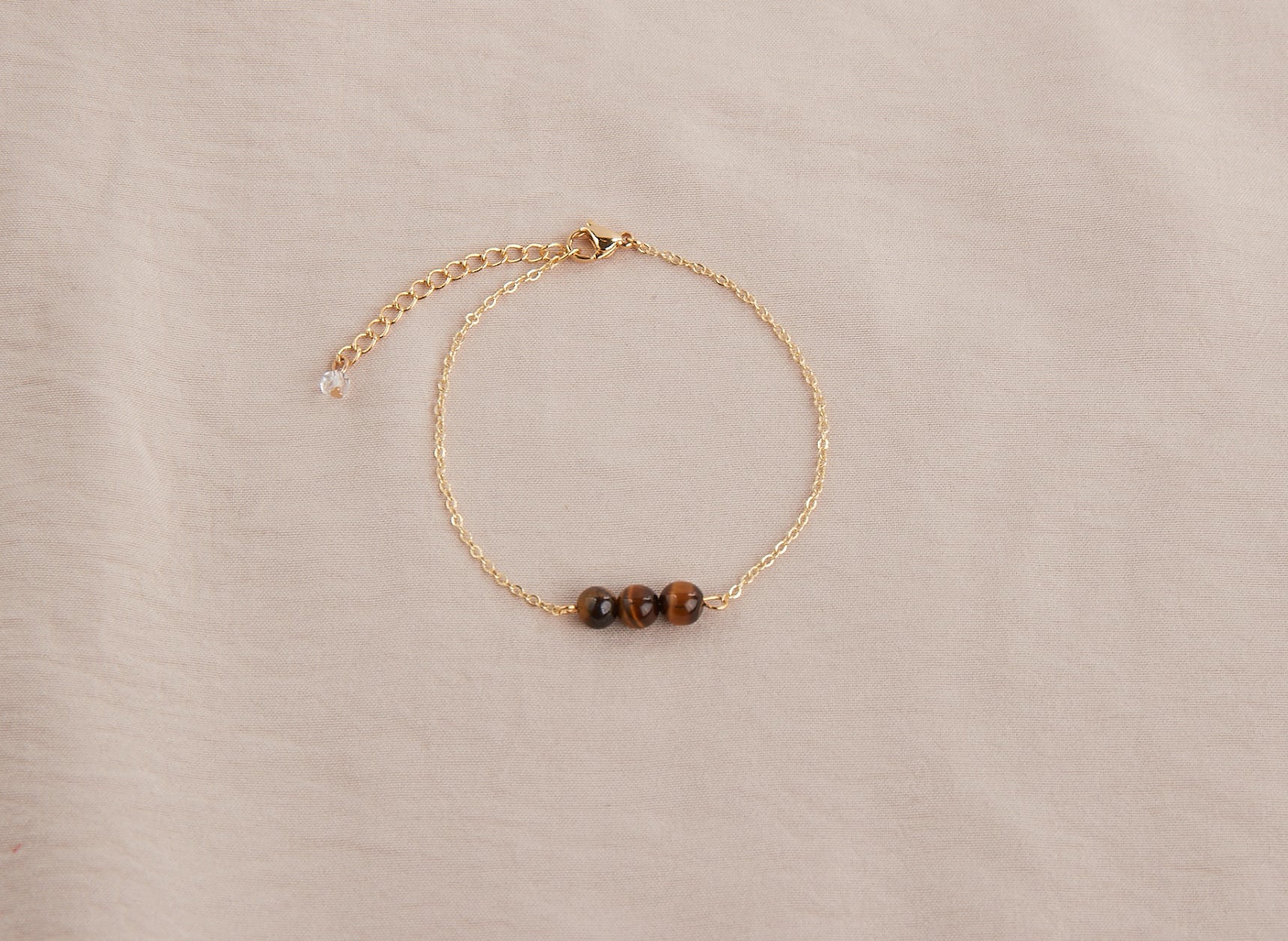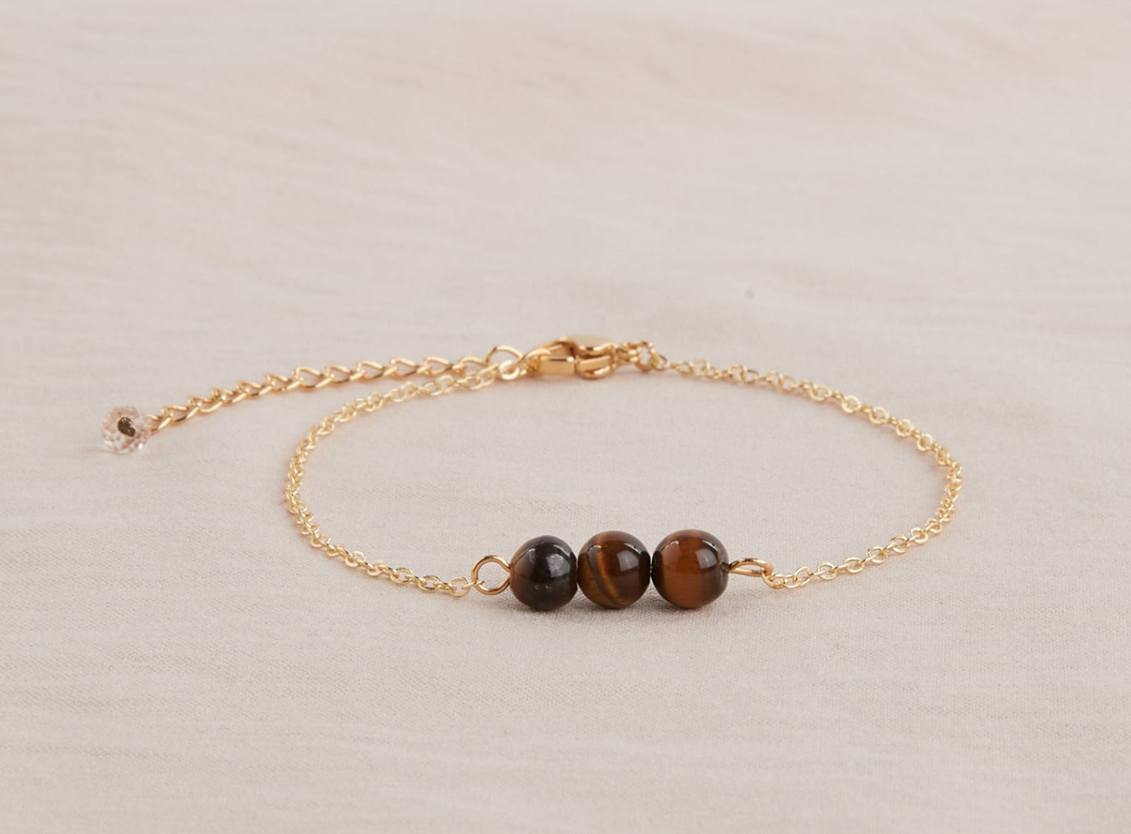 Fine bracelet composed of a golden stainless steel chain and three natural brown and beige tiger's eye beads.