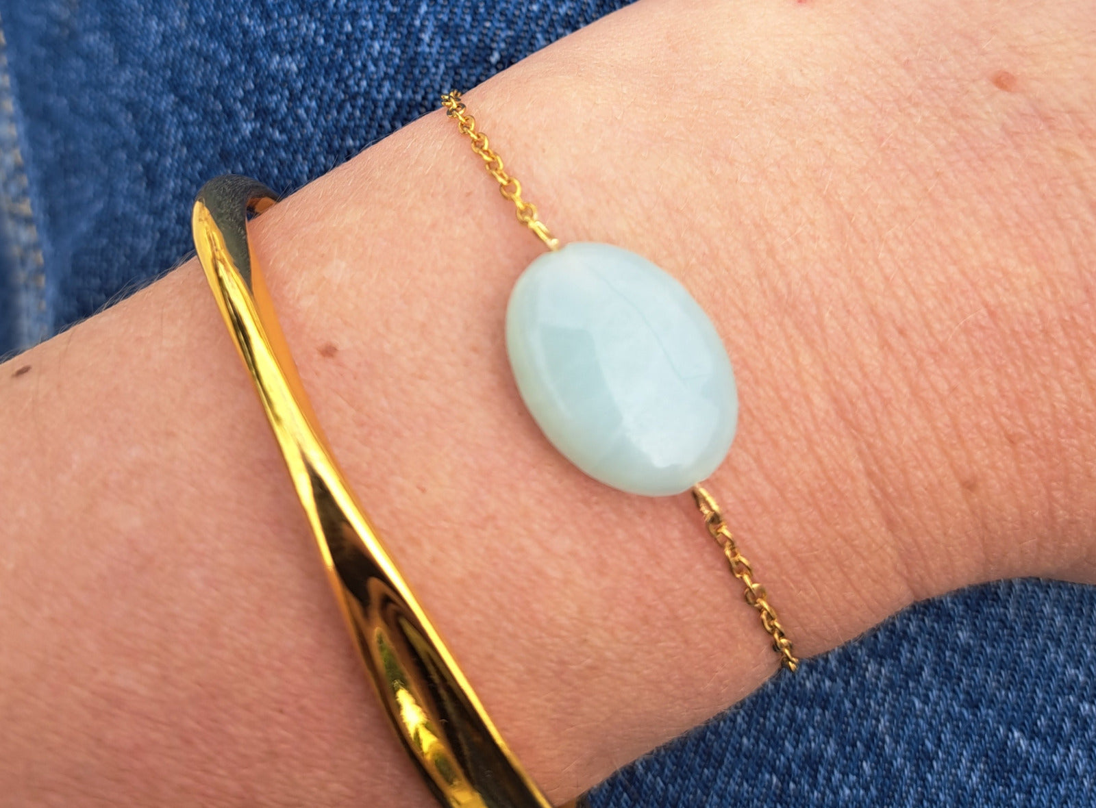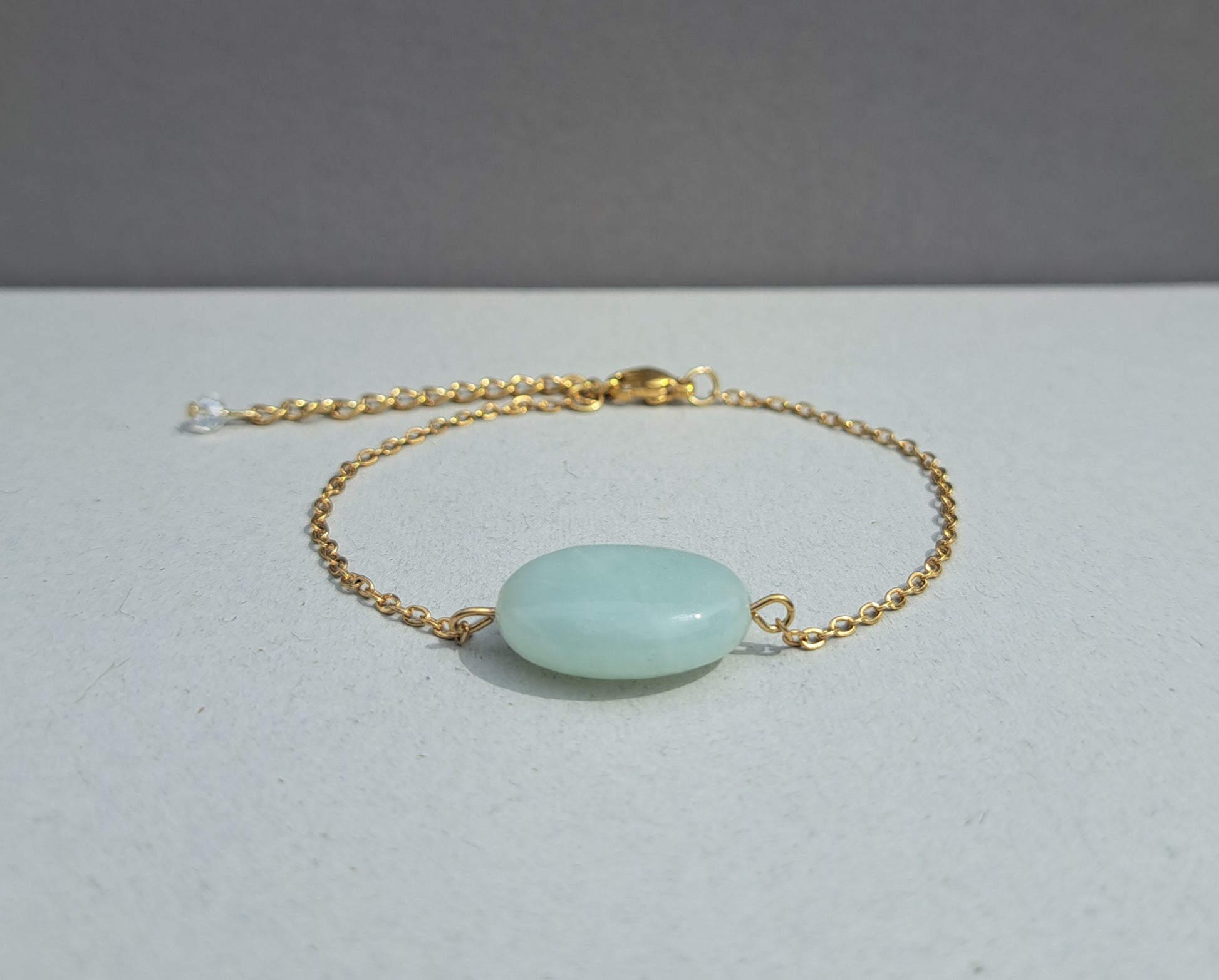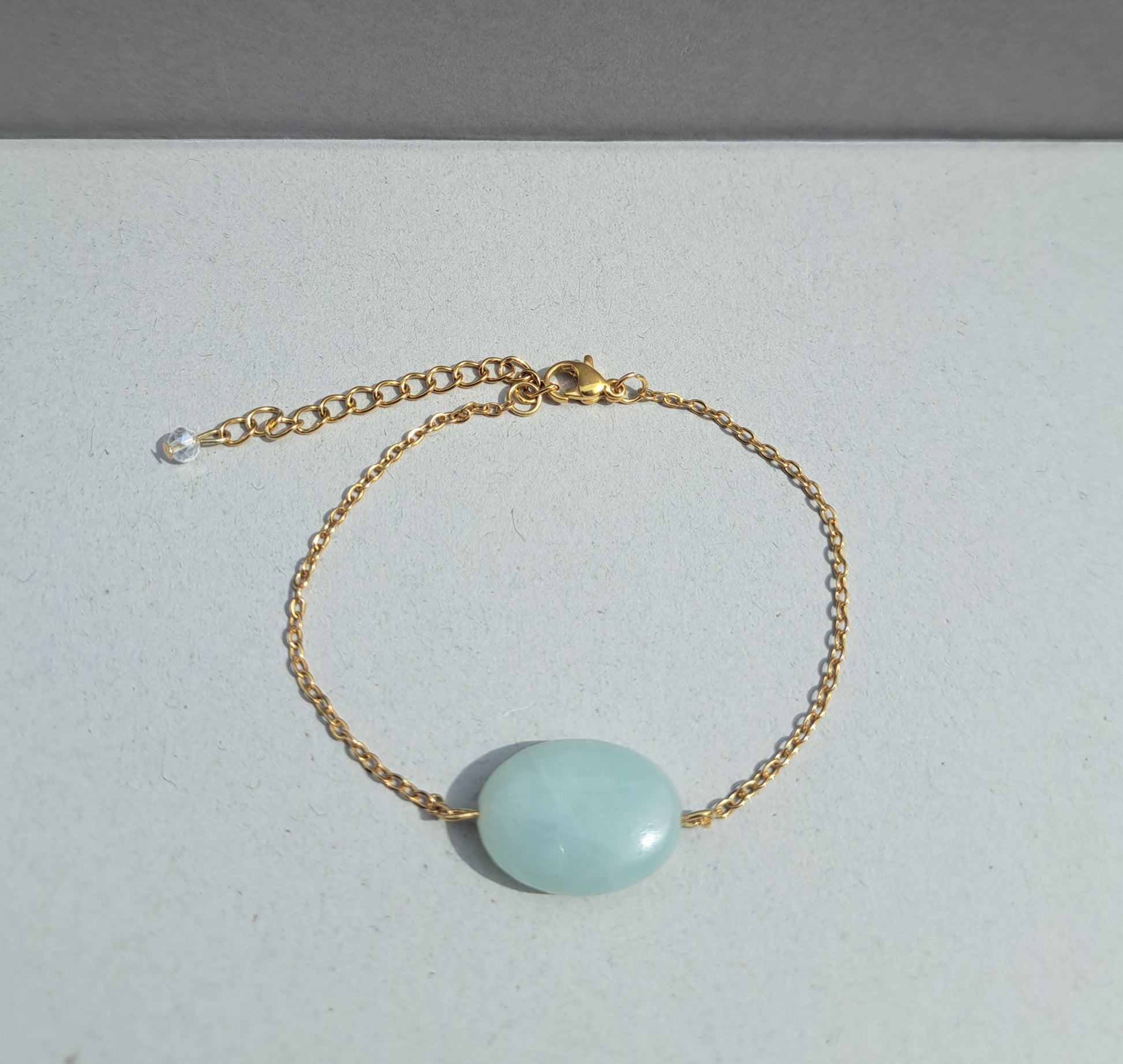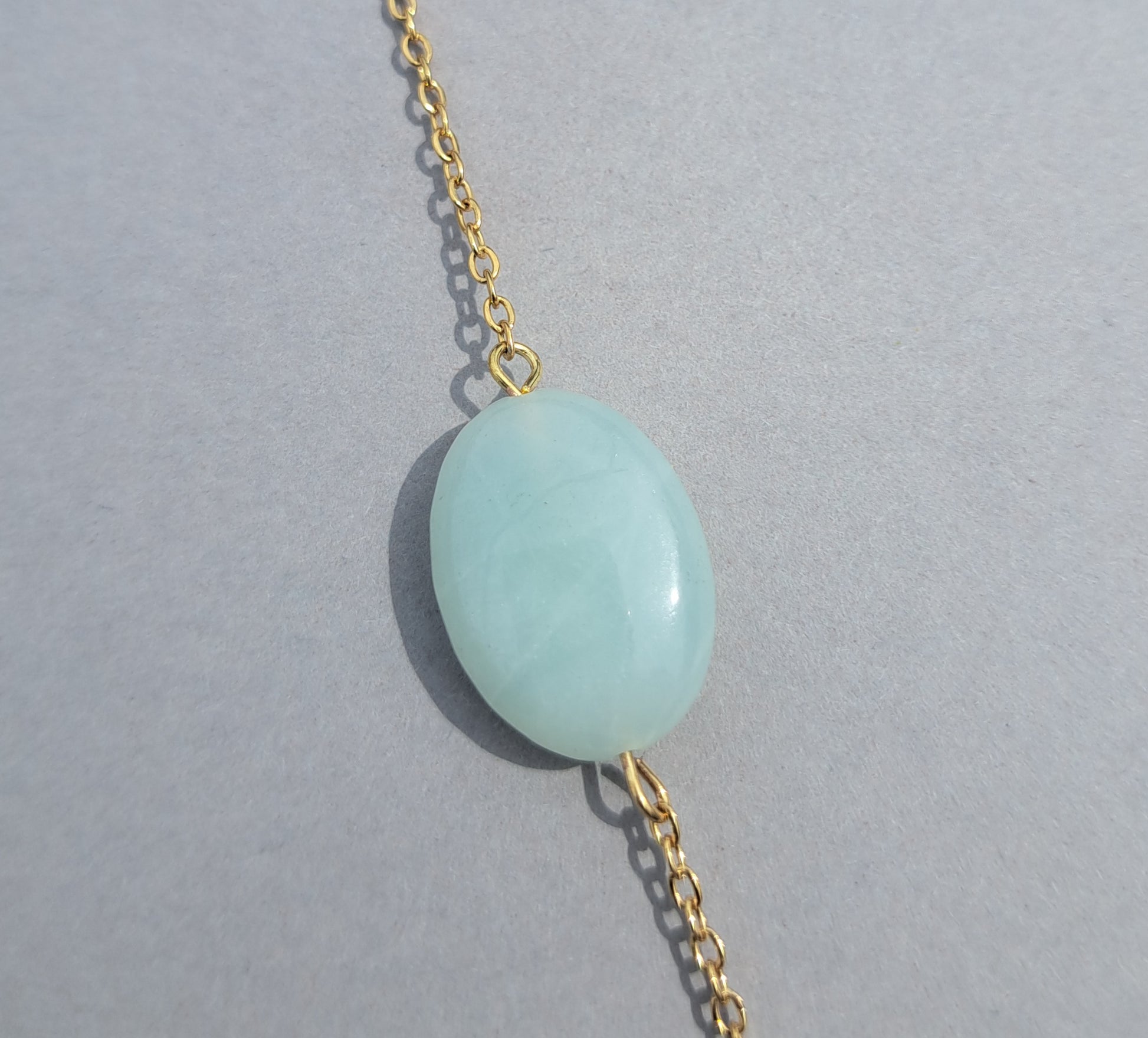 Fine bracelet composed of a golden stainless steel chain and a flat oval amazonite bead in shades of sea green and turquoise.