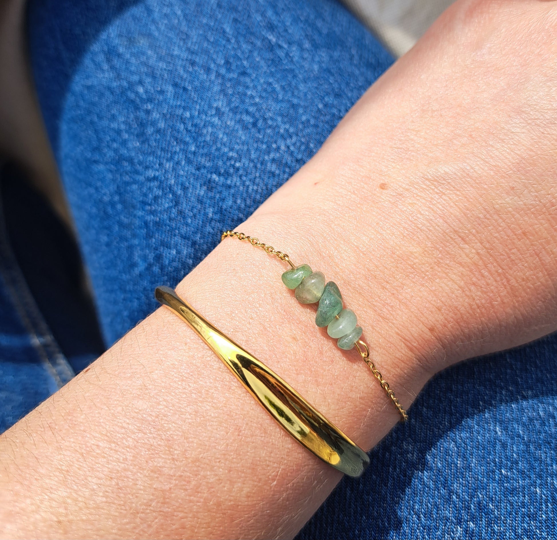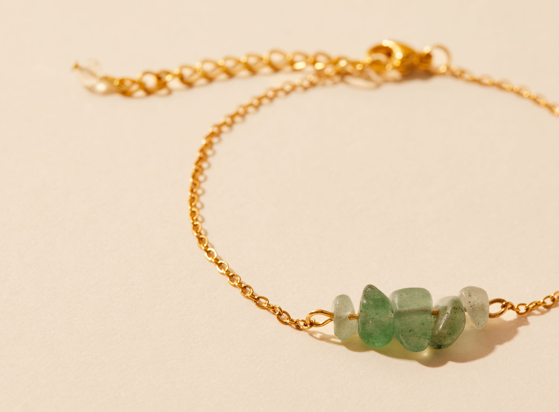 Fine bracelet composed of a golden stainless steel chain and green aventurine beads.