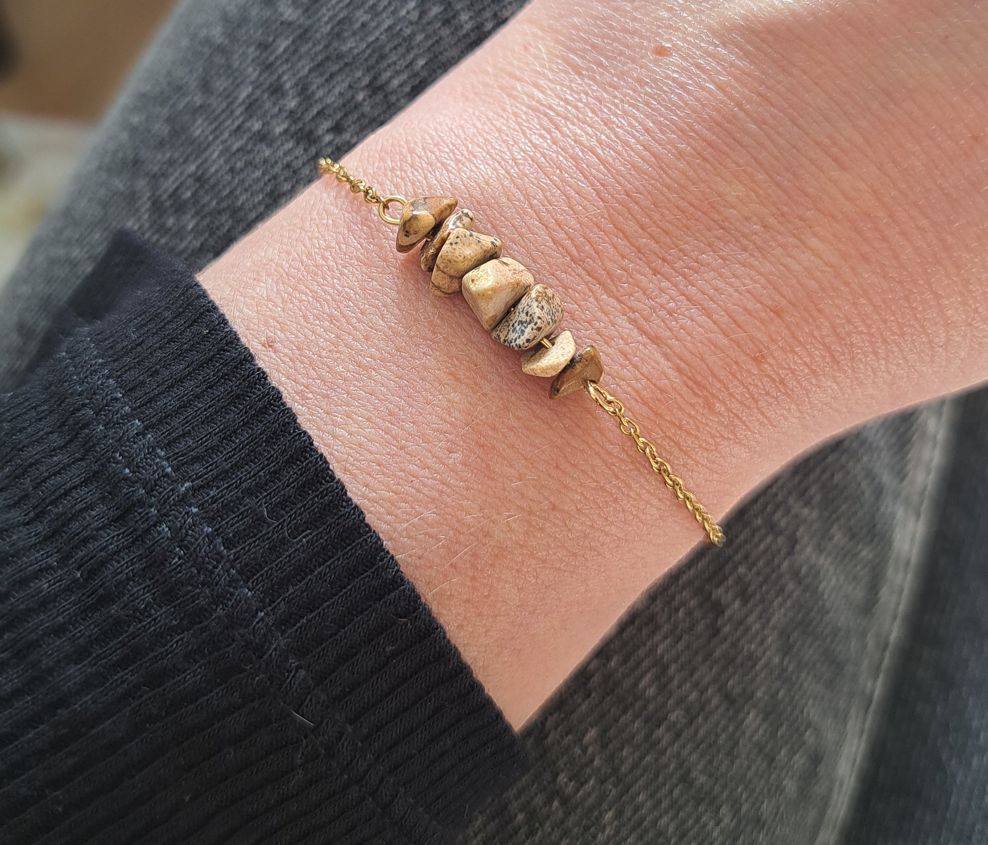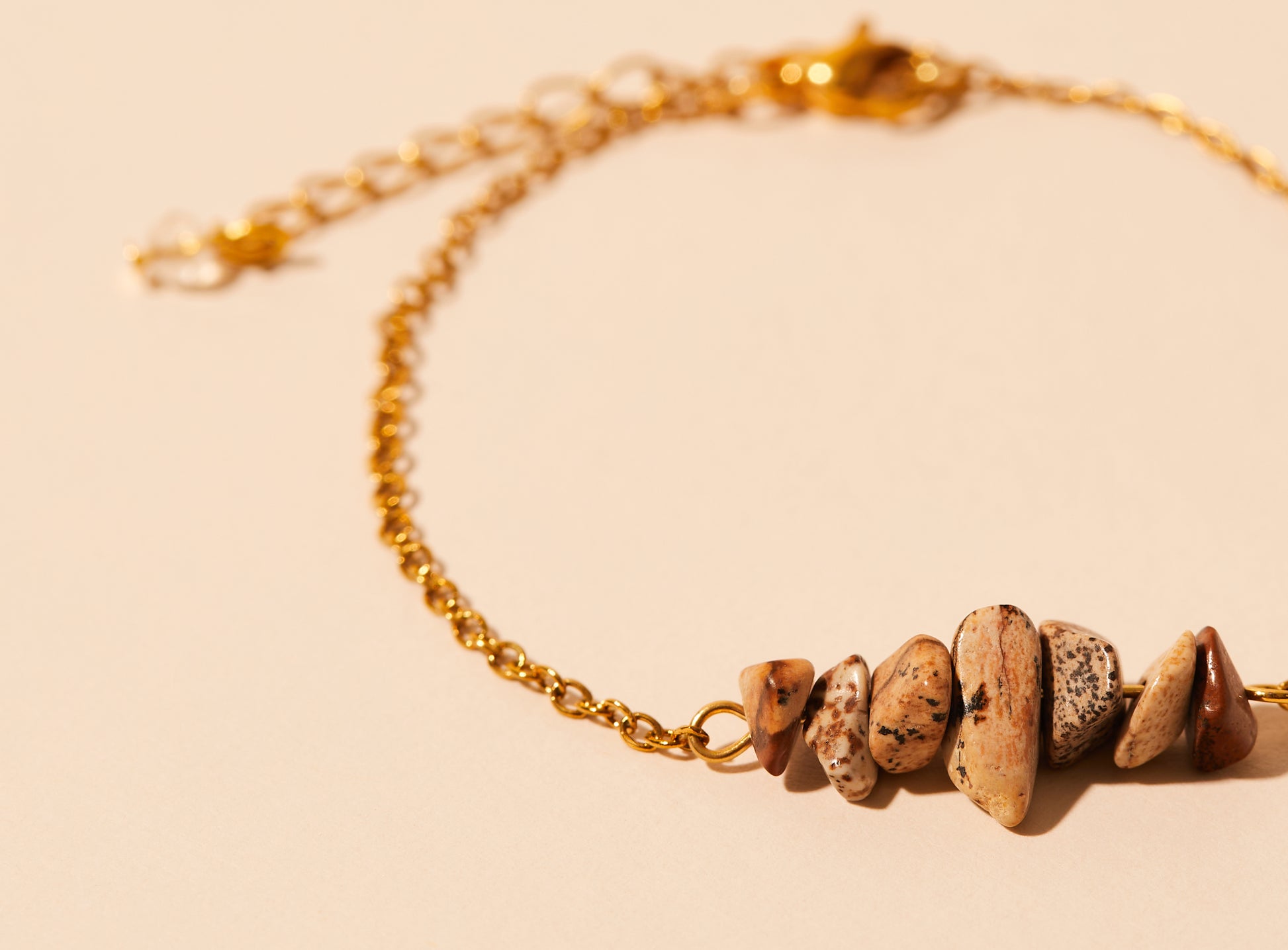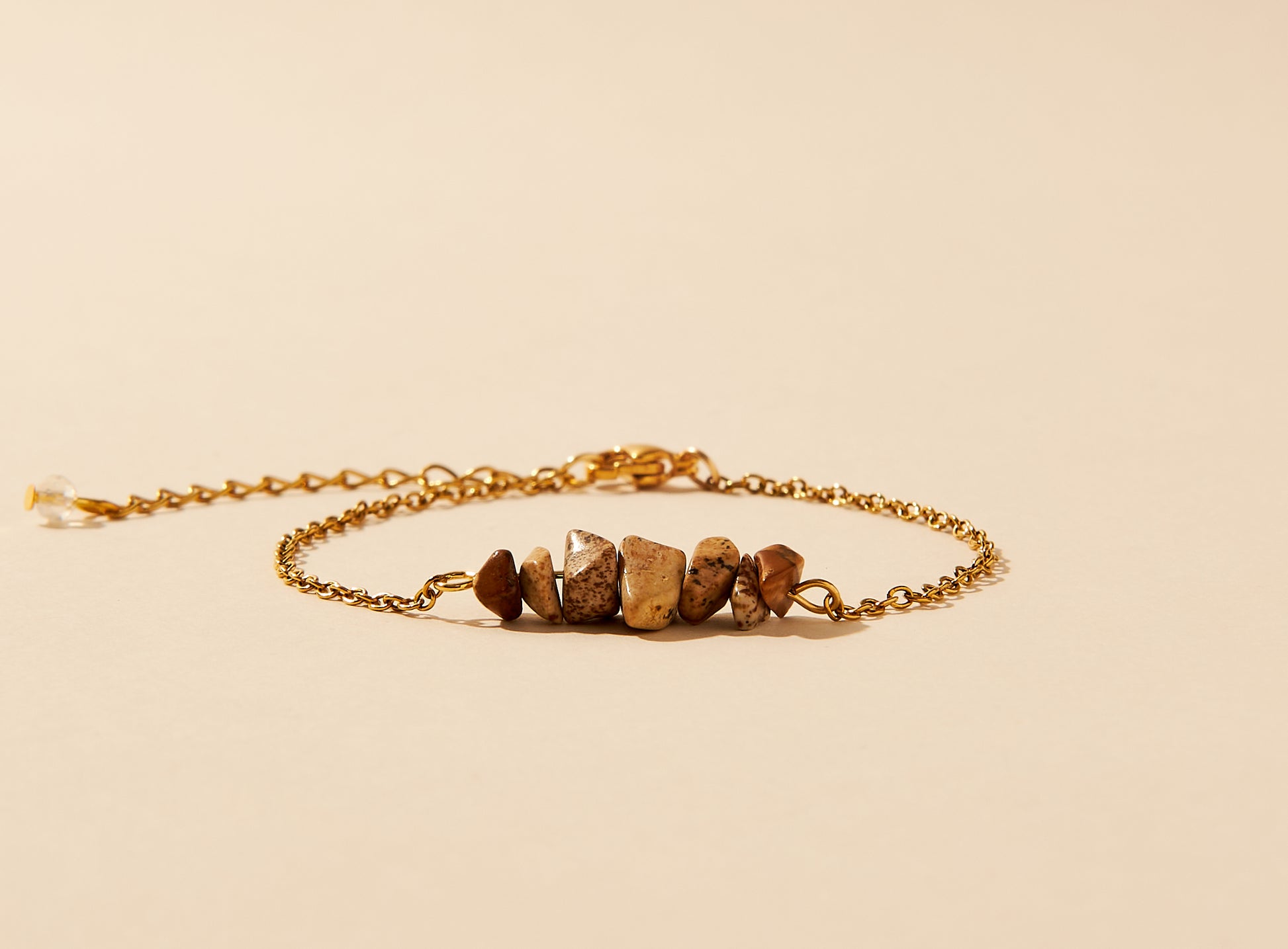 This bracelet is made up of a gold stainless steel chain and landscape jasper stones in speckled beige-brown tones.