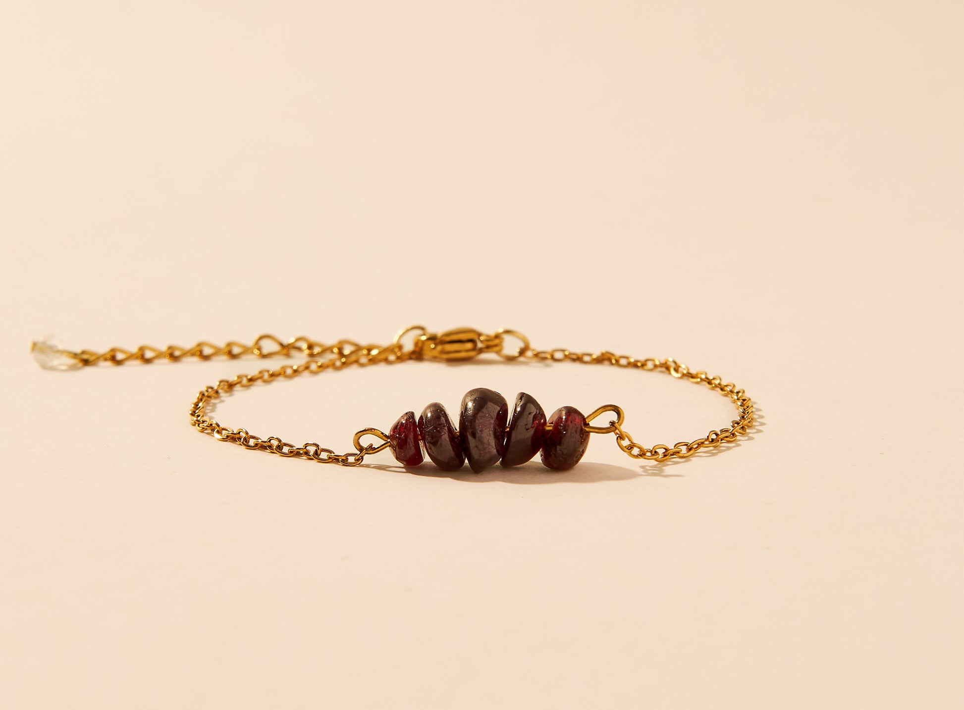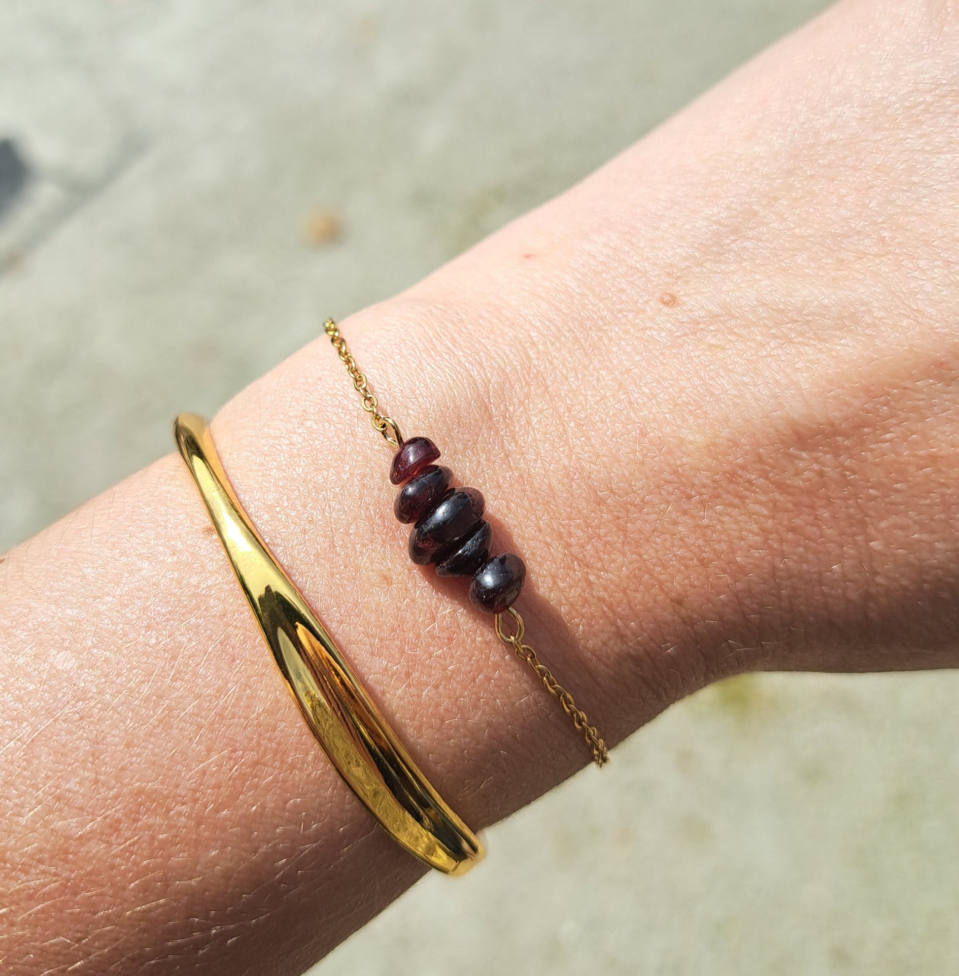 Fine bracelet composed of a golden stainless steel chain and burgundy-toned garnet beads.