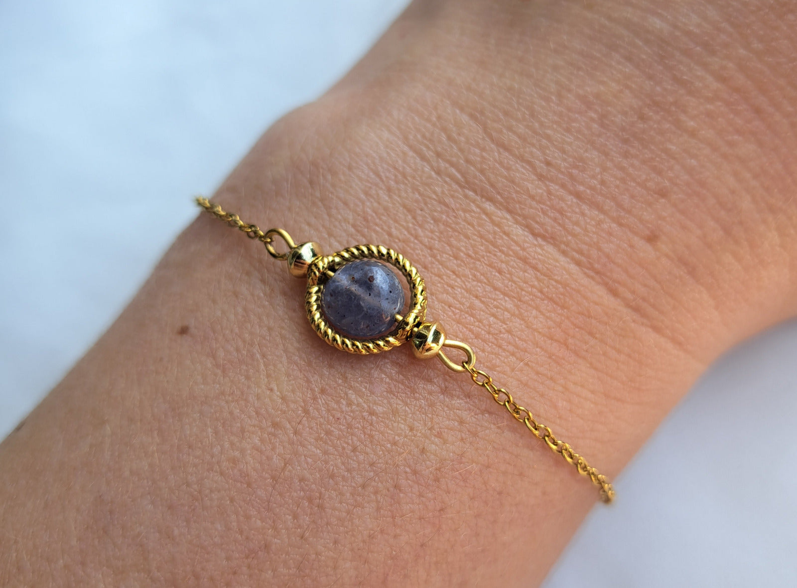 Bracelet fin composé d'une chaînette dorée en acier inoxydable, d'une applique ronde striée, de 2 petites perles dorées et d'une pierre Iolite: tons mauve et points violet.