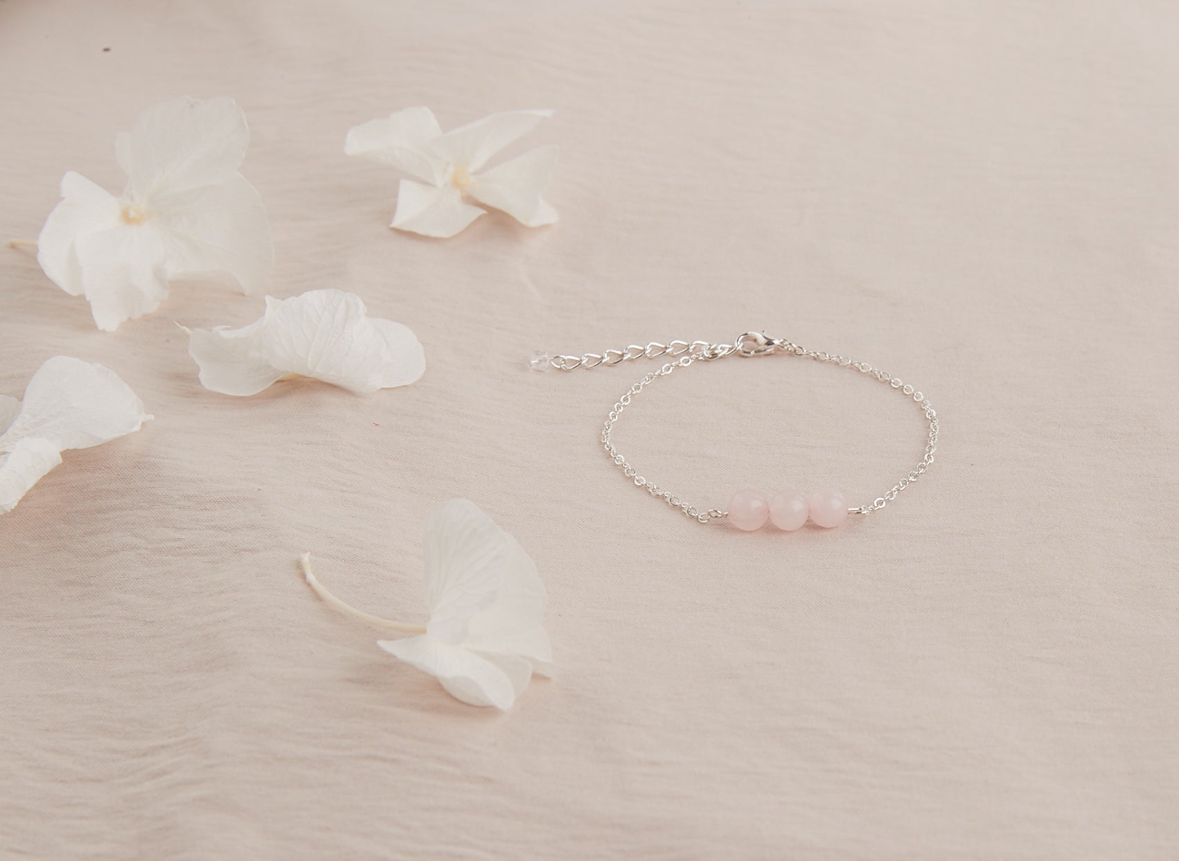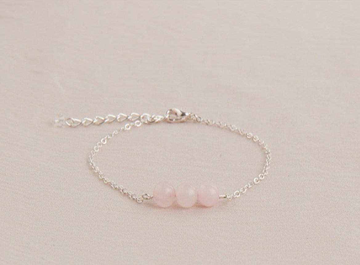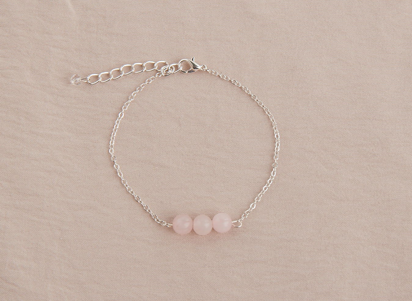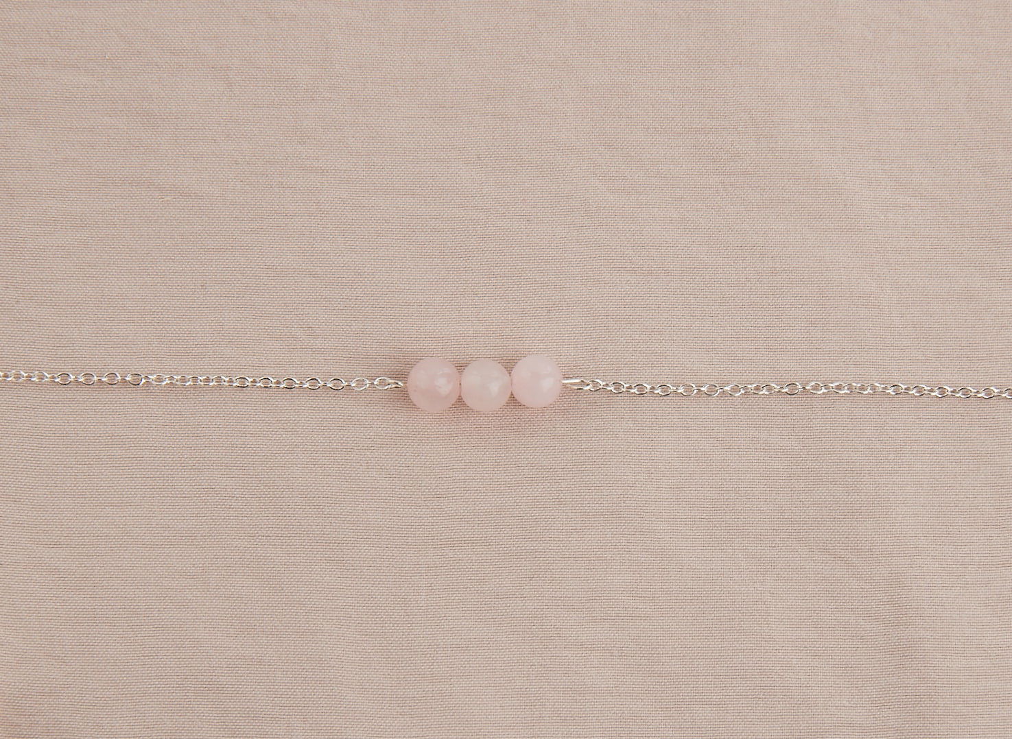 Fine bracelet composed of a silver stainless steel chain and three natural rose quartz beads.