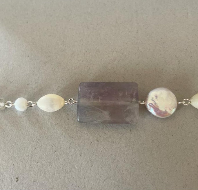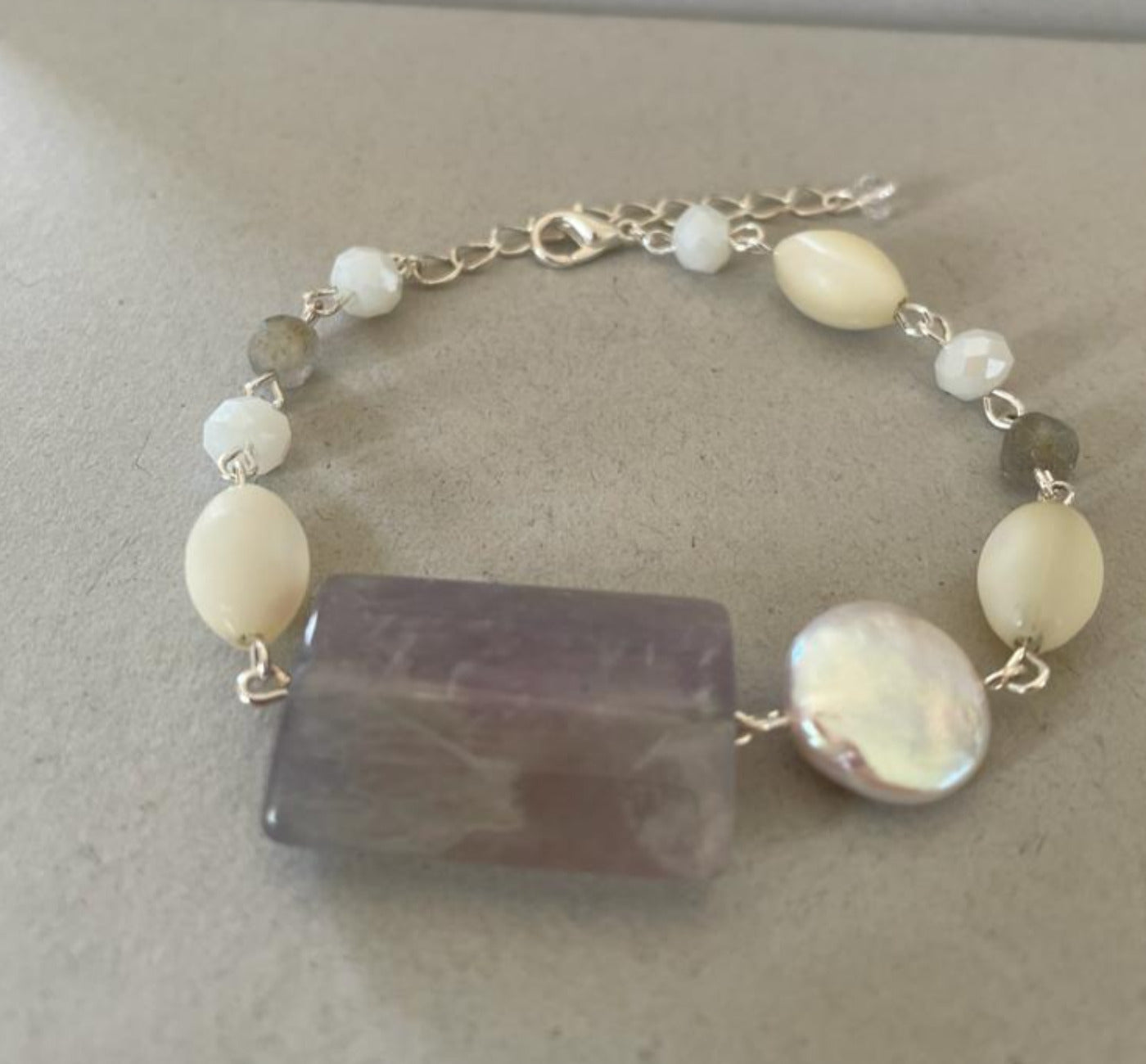 Second-hand bracelet made up of a cultured pearl and various pearls from two necklaces and recycled pearls.