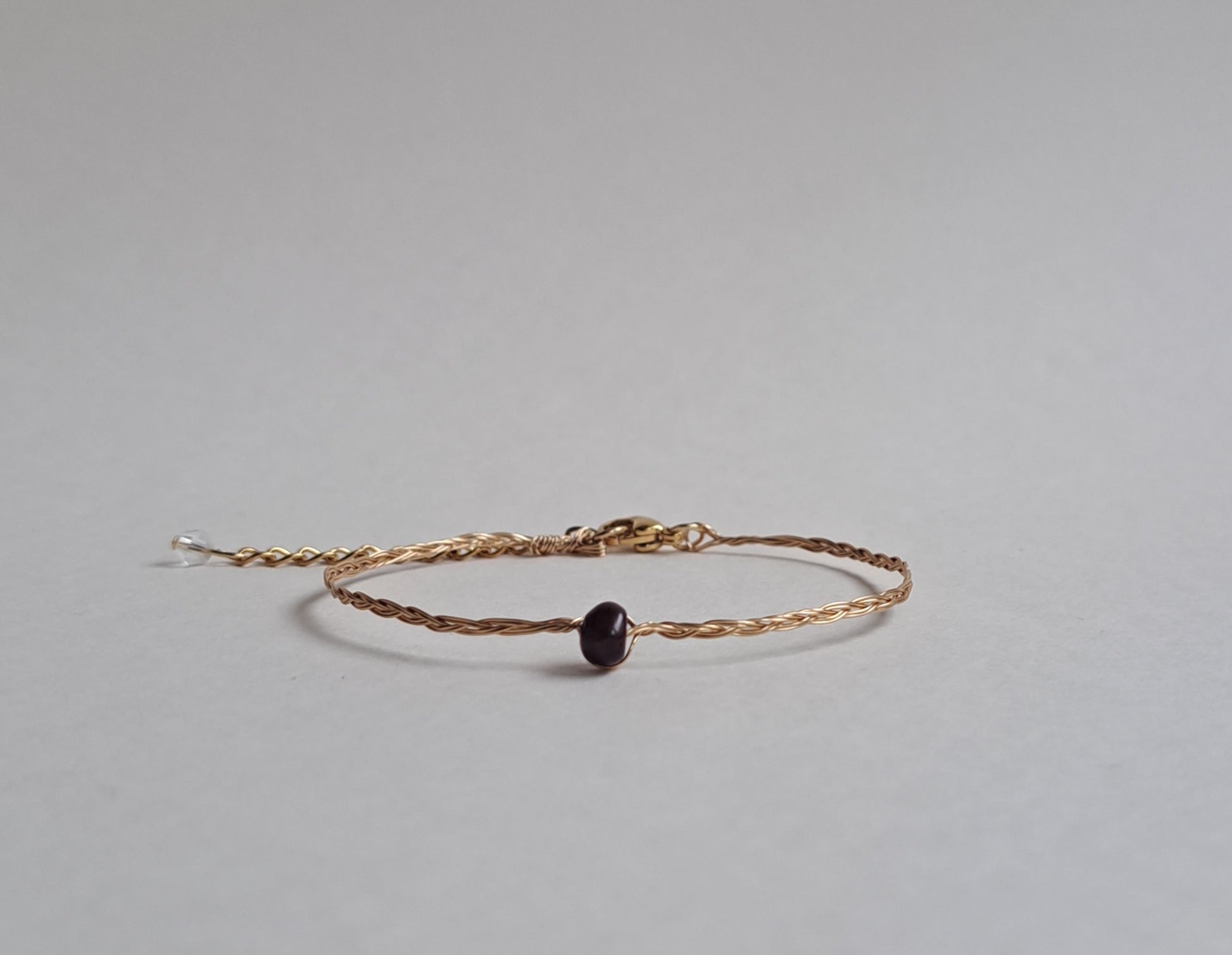 Bracelet fin composé d'une tresse de fil de laiton fin et d'une perle de Grenat bordeaux.