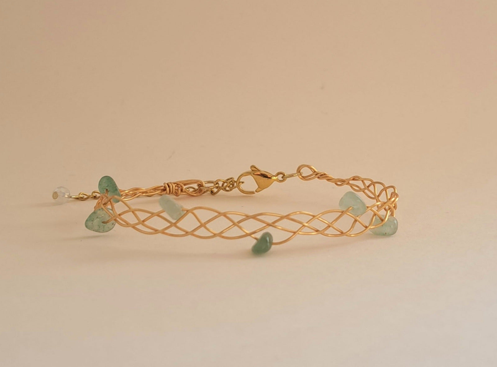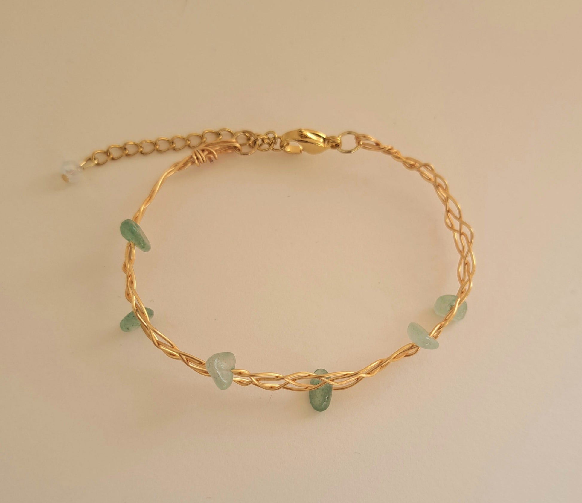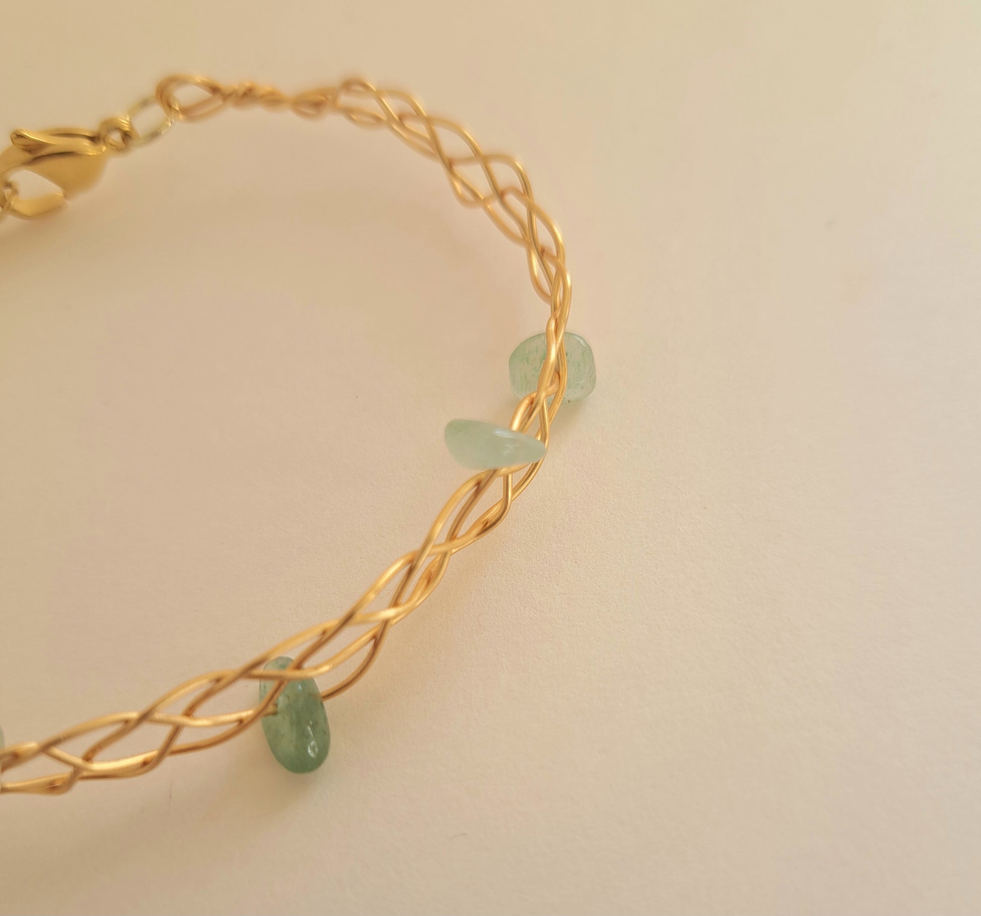 Bracelet fin composé d'une tresse de fil de laiton et de pierres naturelles d'aventurine.