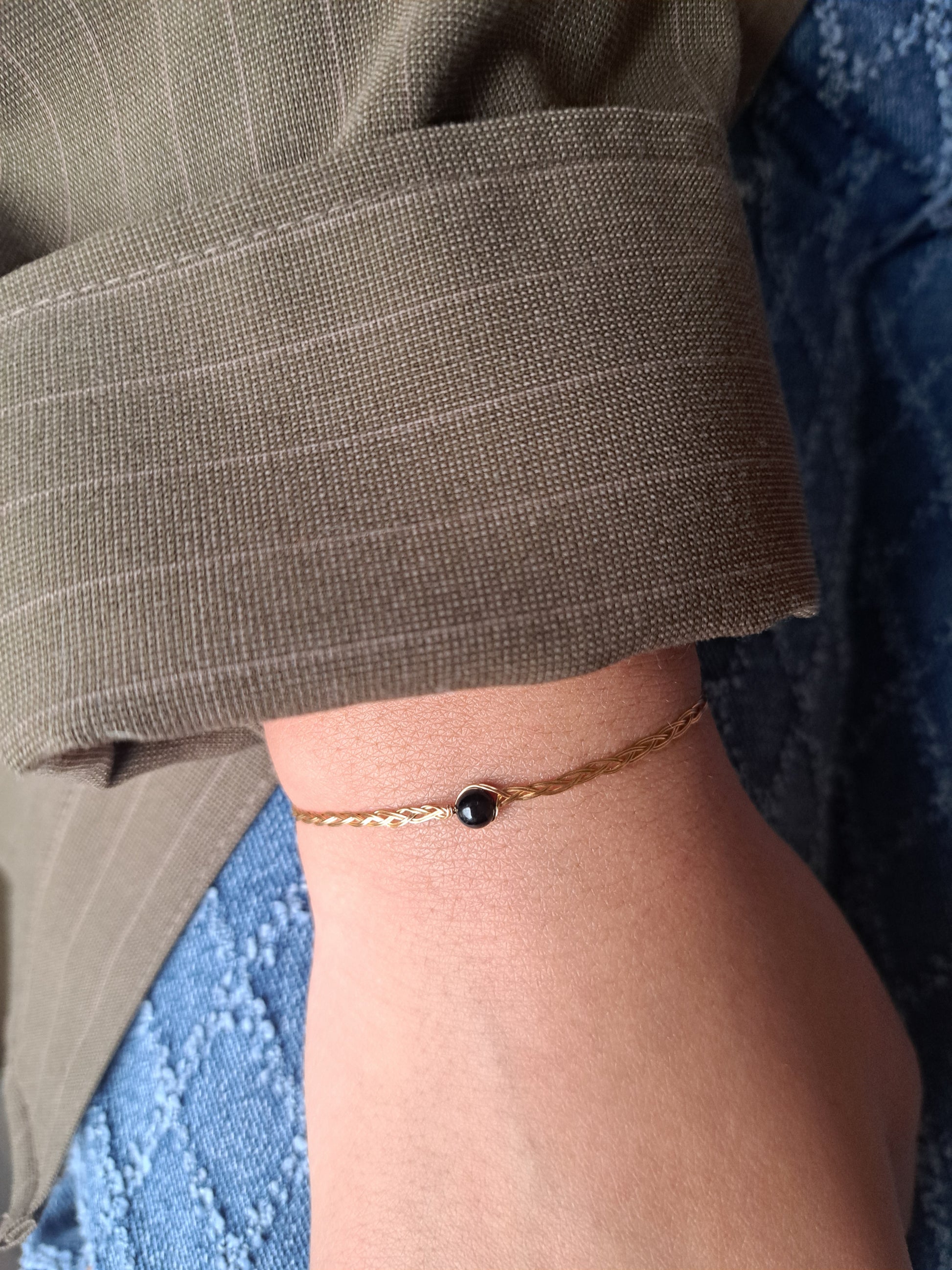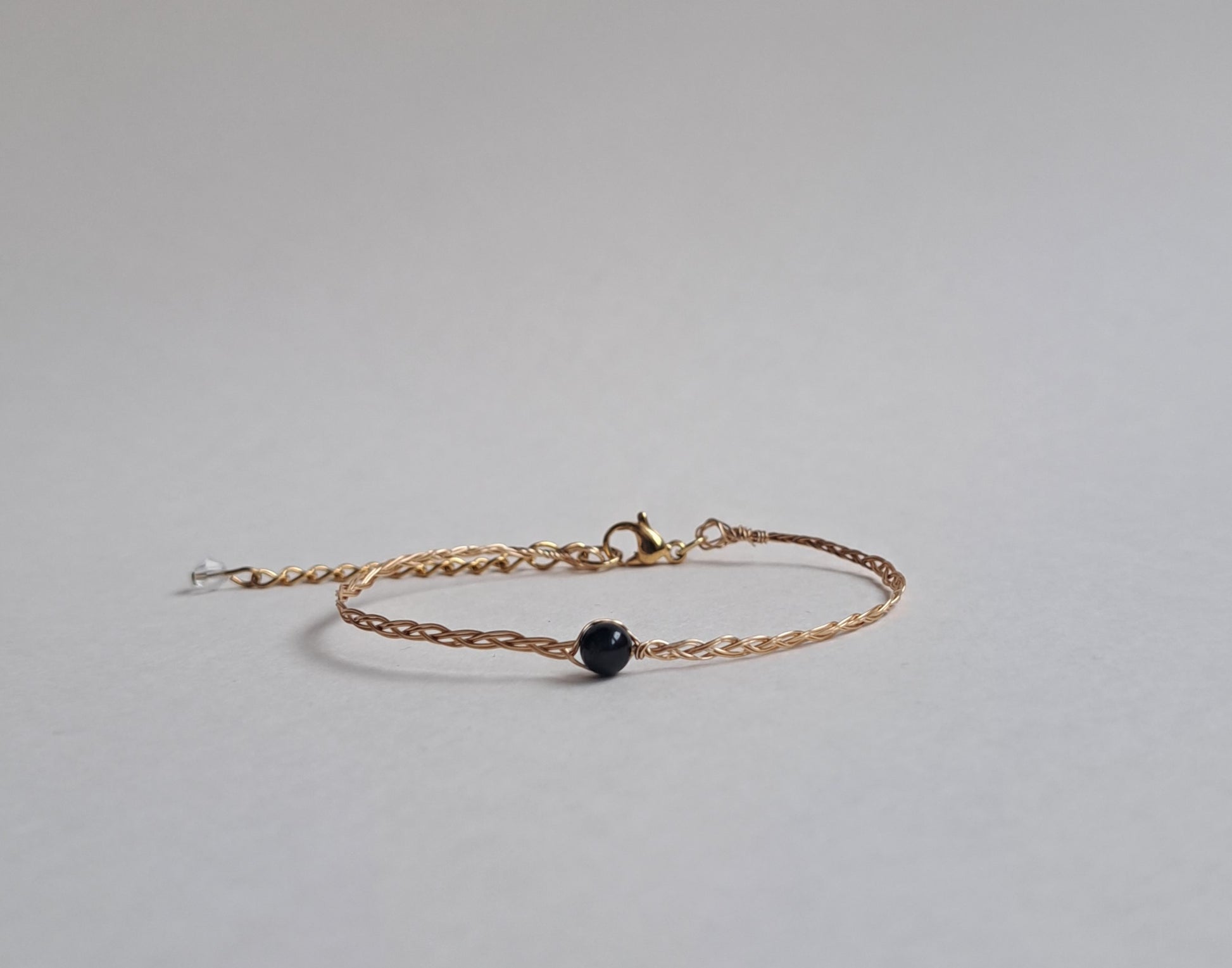 Bracelet fin composé d'une tresse de fil de laiton fin et d'une perle de tourmaline noire.