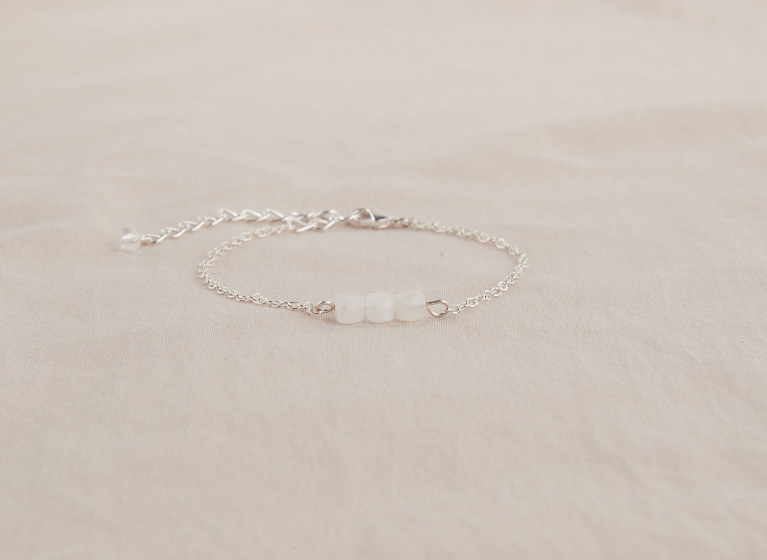 A clasp and an extension chain decorated with a glass pearl finish this bracelet.