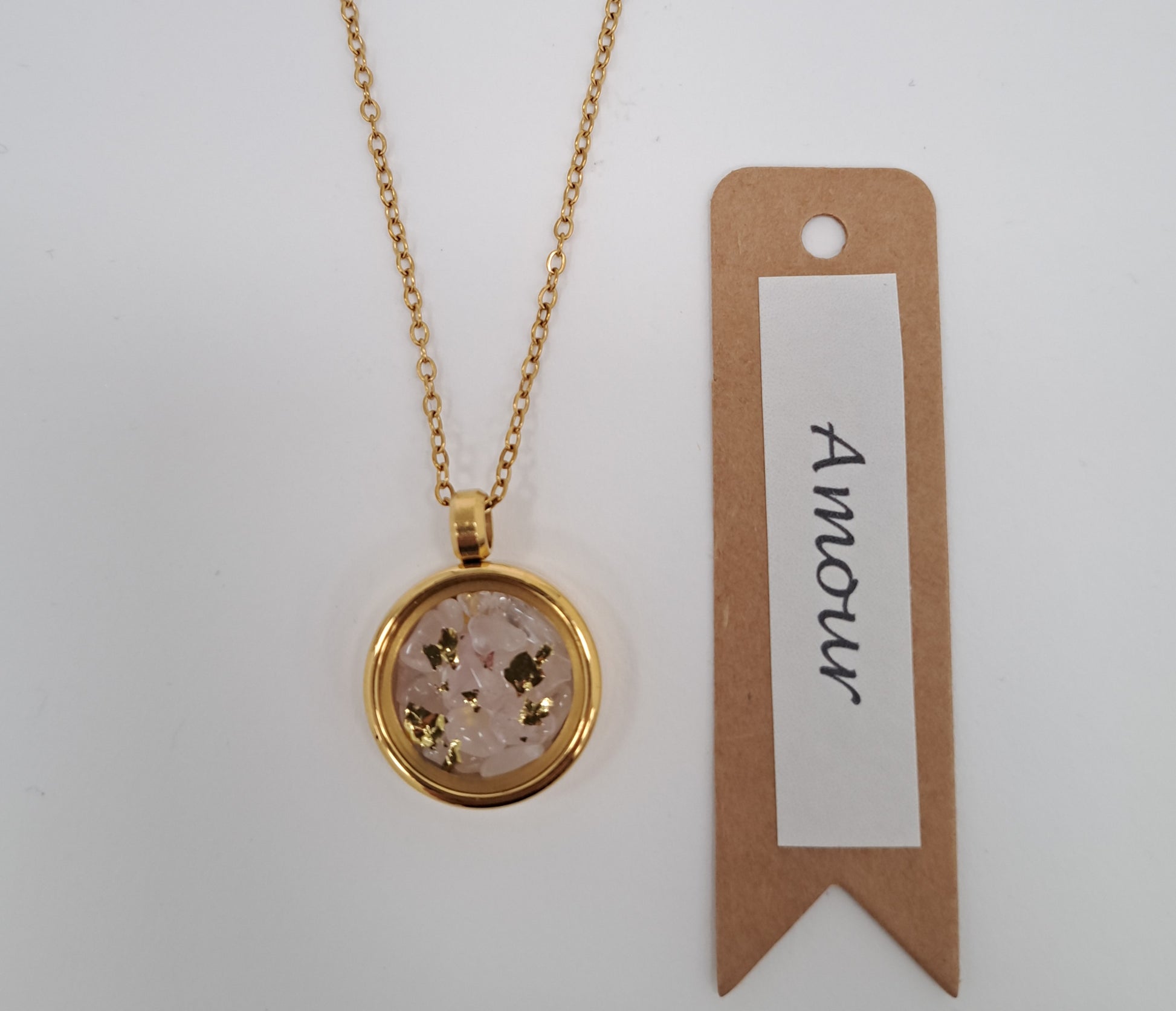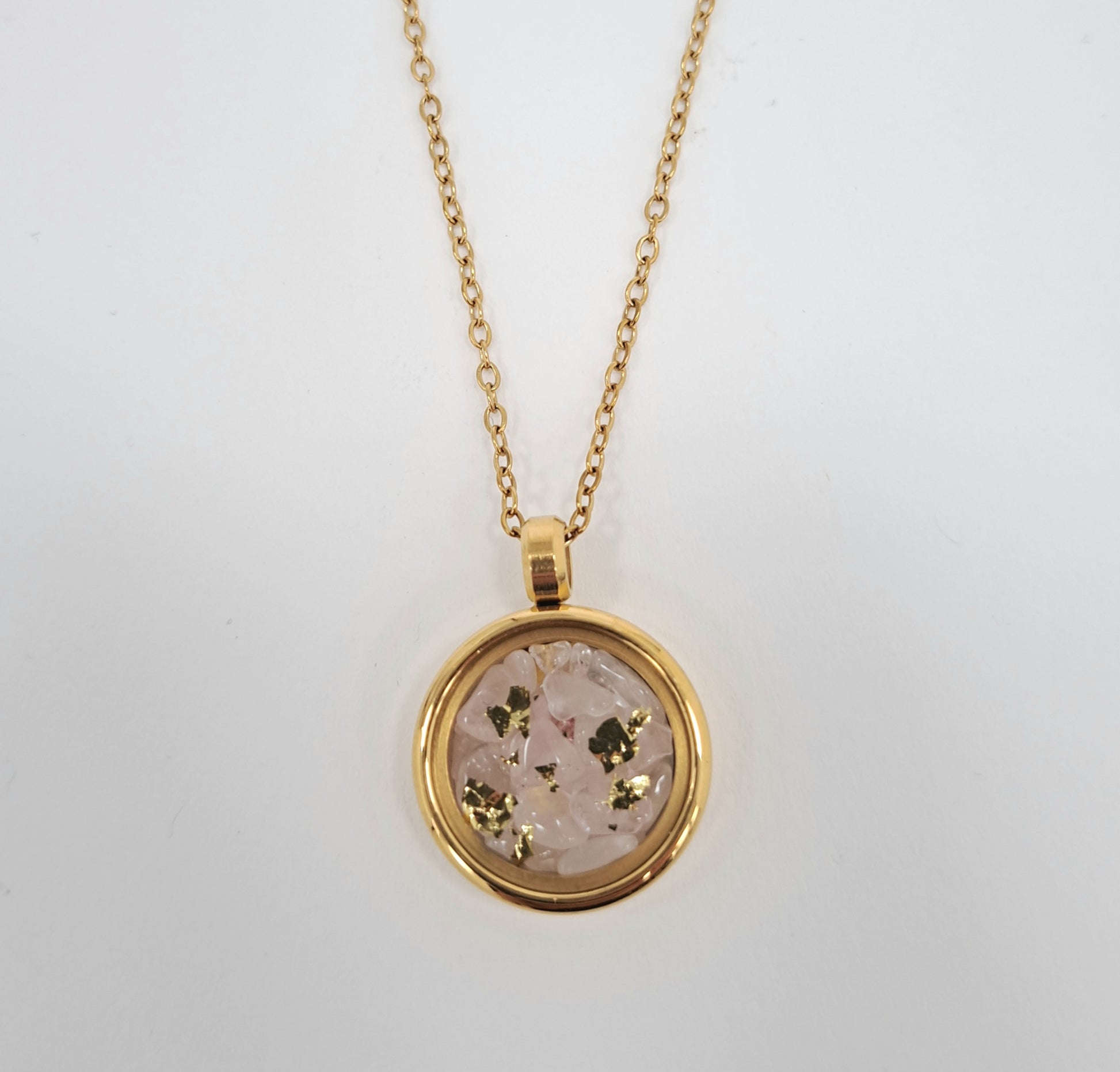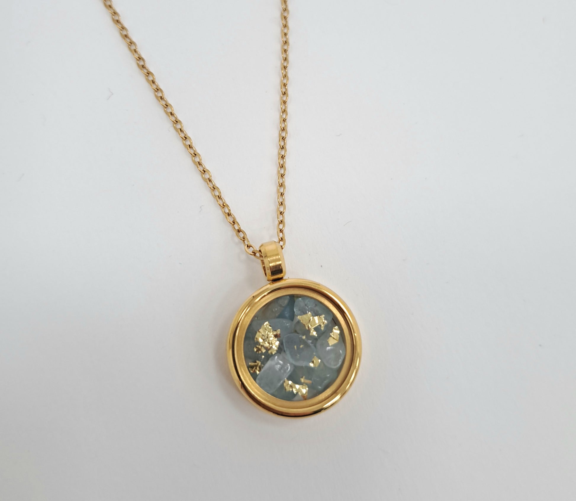 Collier composé d'une chaîne fine en acier inoxydable dorée et d'un médaillon rond rempli de fines pierres naturelles et de feuille d'or. Il est fini par une chaînette de rallonge et d'une perle à facette transparente.
