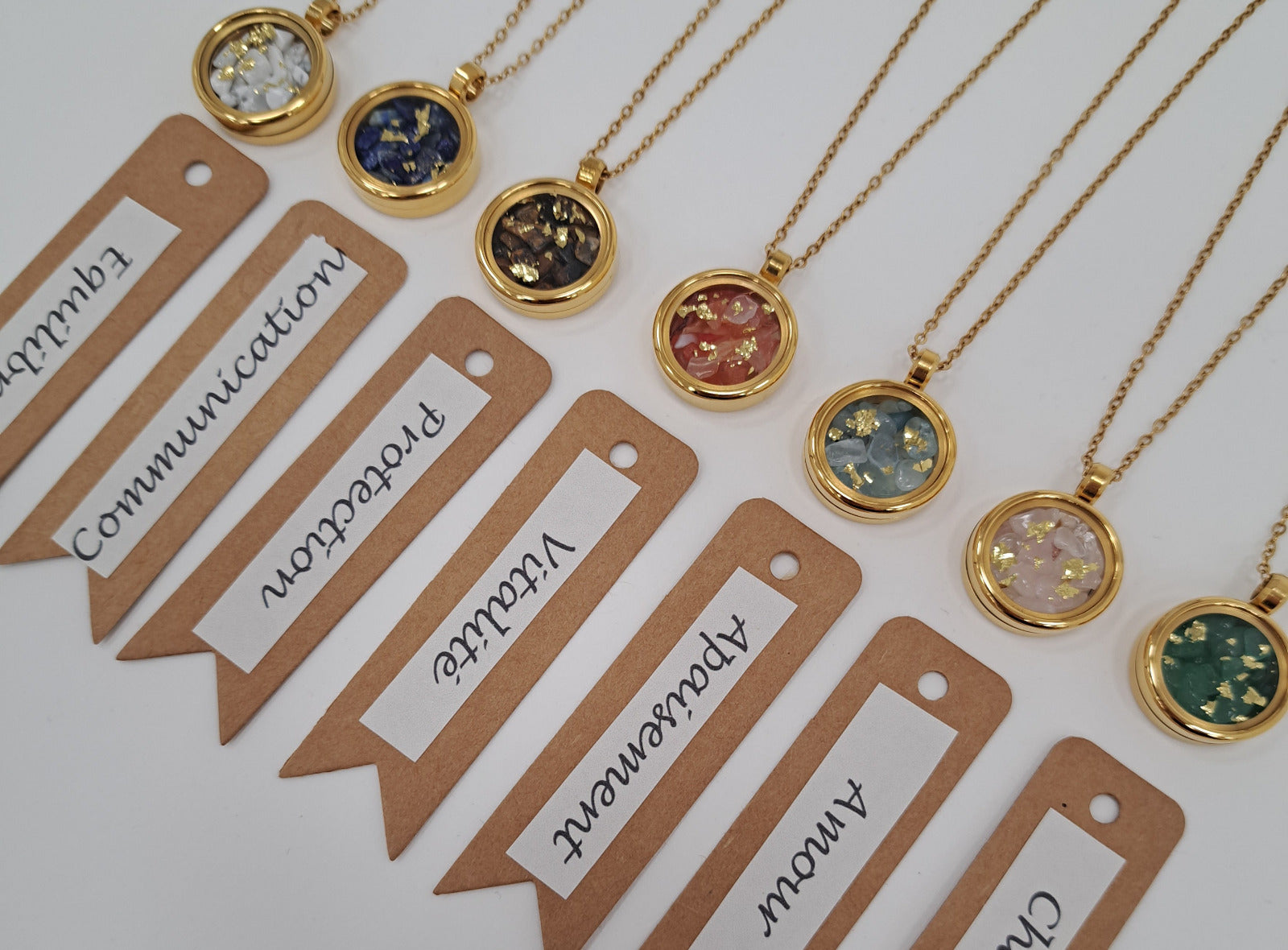 Au creux de ce médaillon se nichent des pierres naturelles, éclats de nature et d’énergie, choisies pour colorer vos jours de chance, de protection, d’amour, d’apaisement et autres vertus.