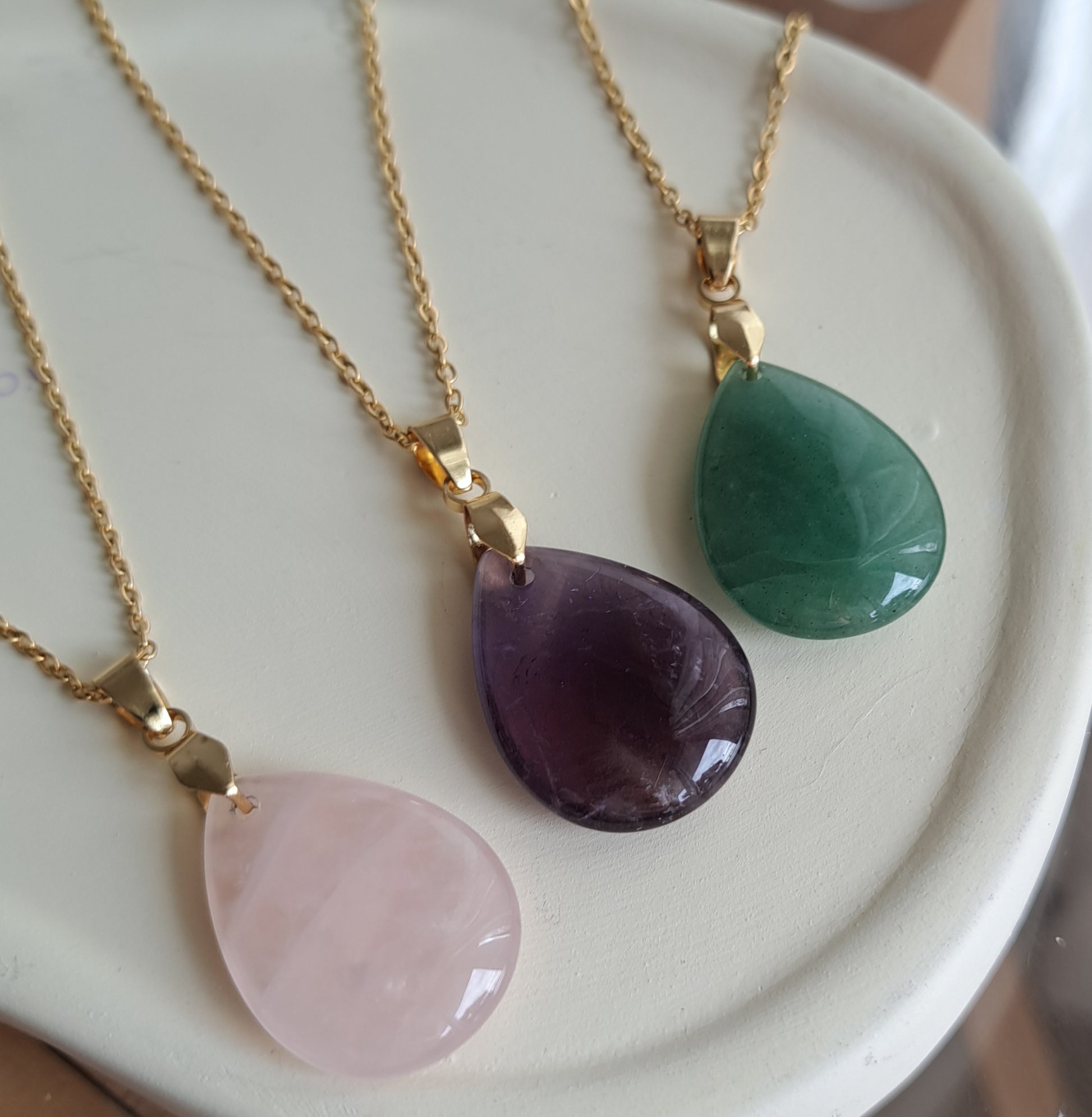 Collier composé d'une chaîne fine en acier inoxydable dorée ou argentée et d'un pendentif goutte en pierre d'aventurine verte.