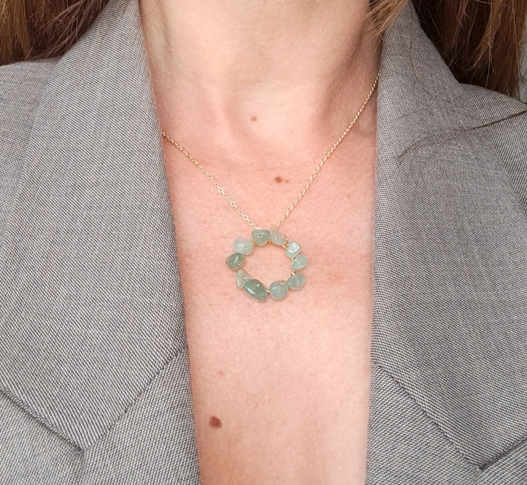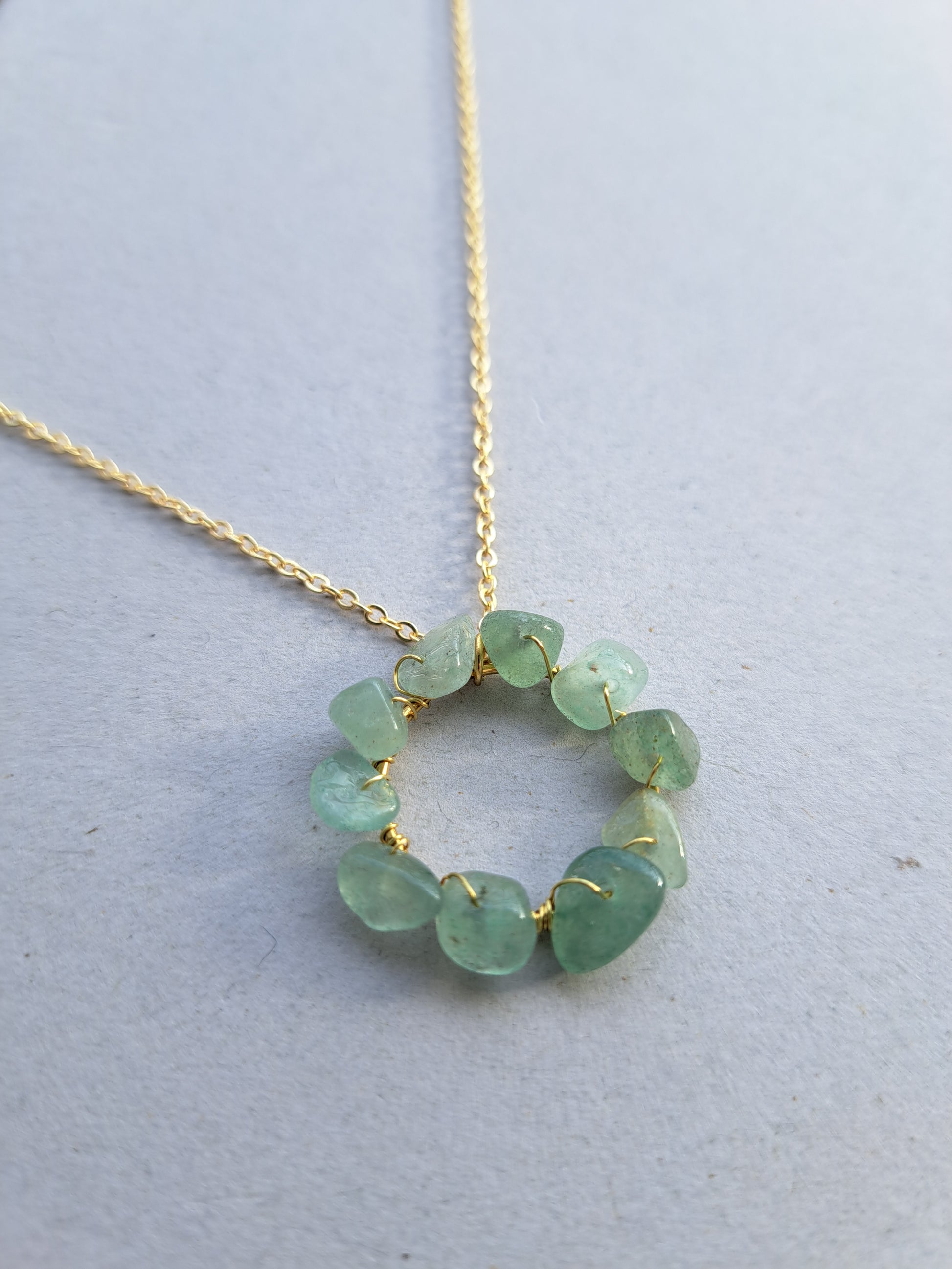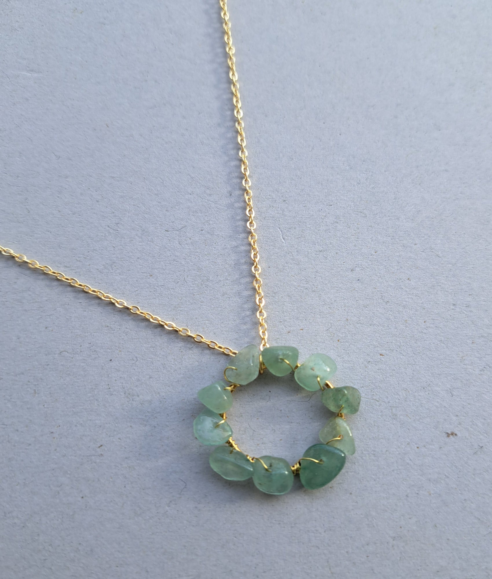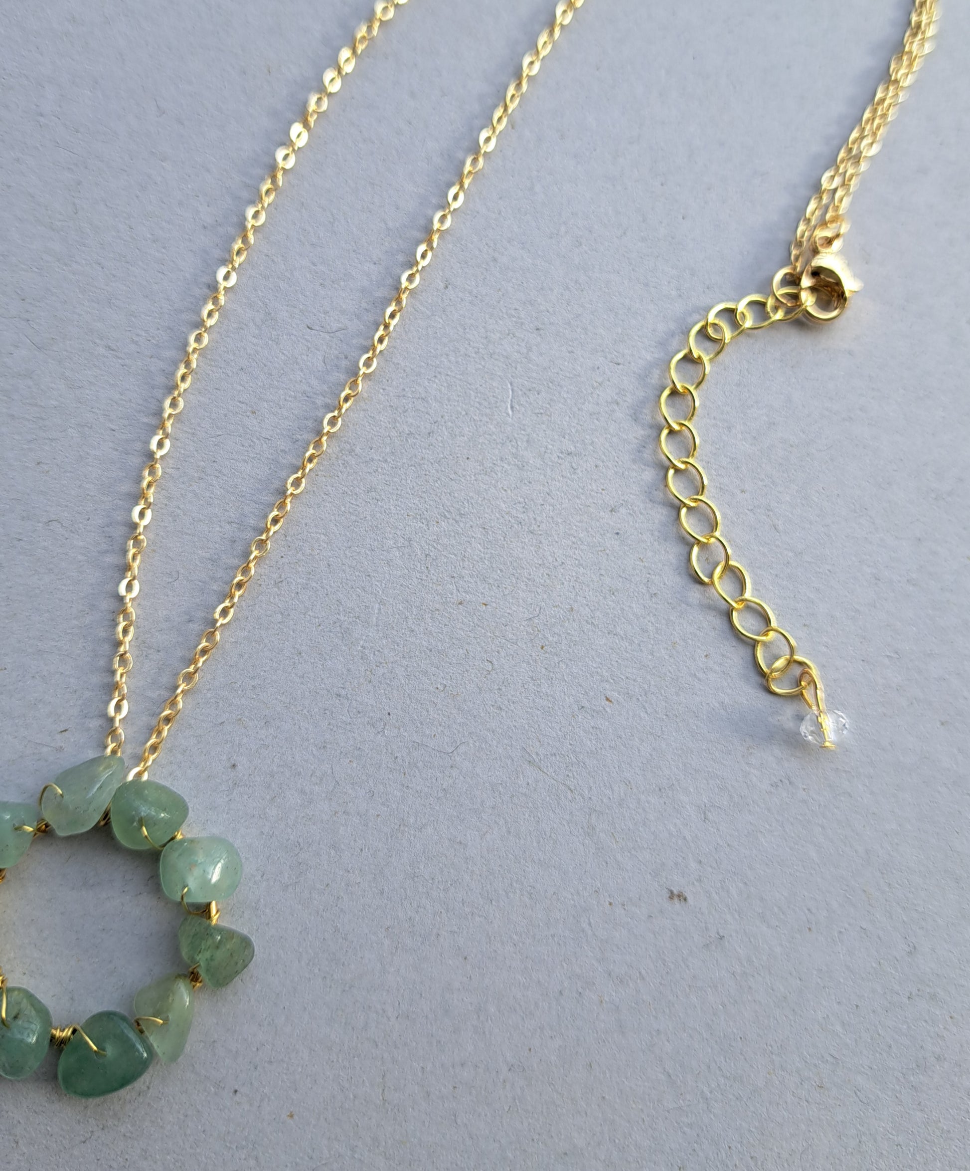Necklace composed of a fine gold chain and a pendant decorated with green aventurine stones.