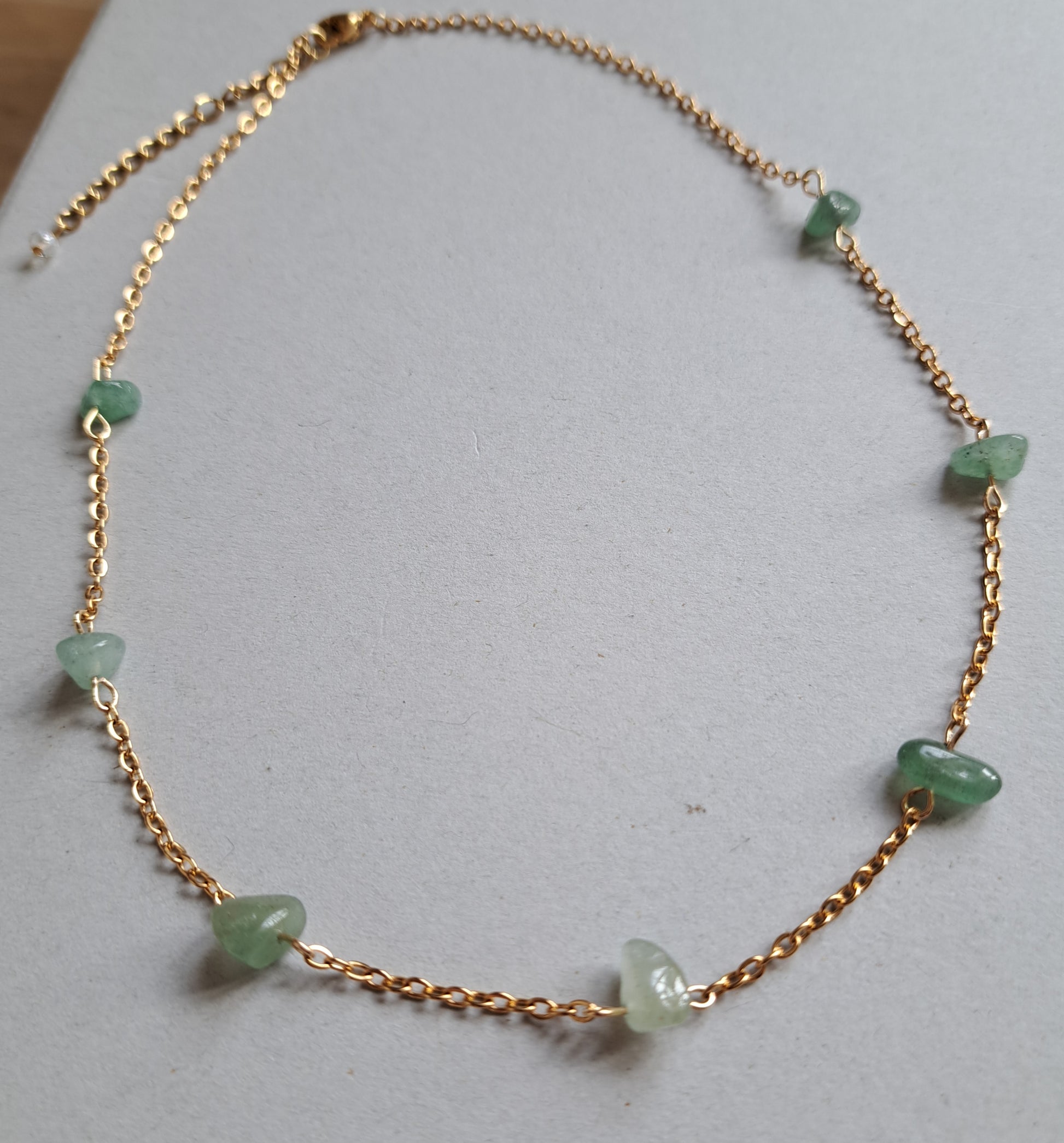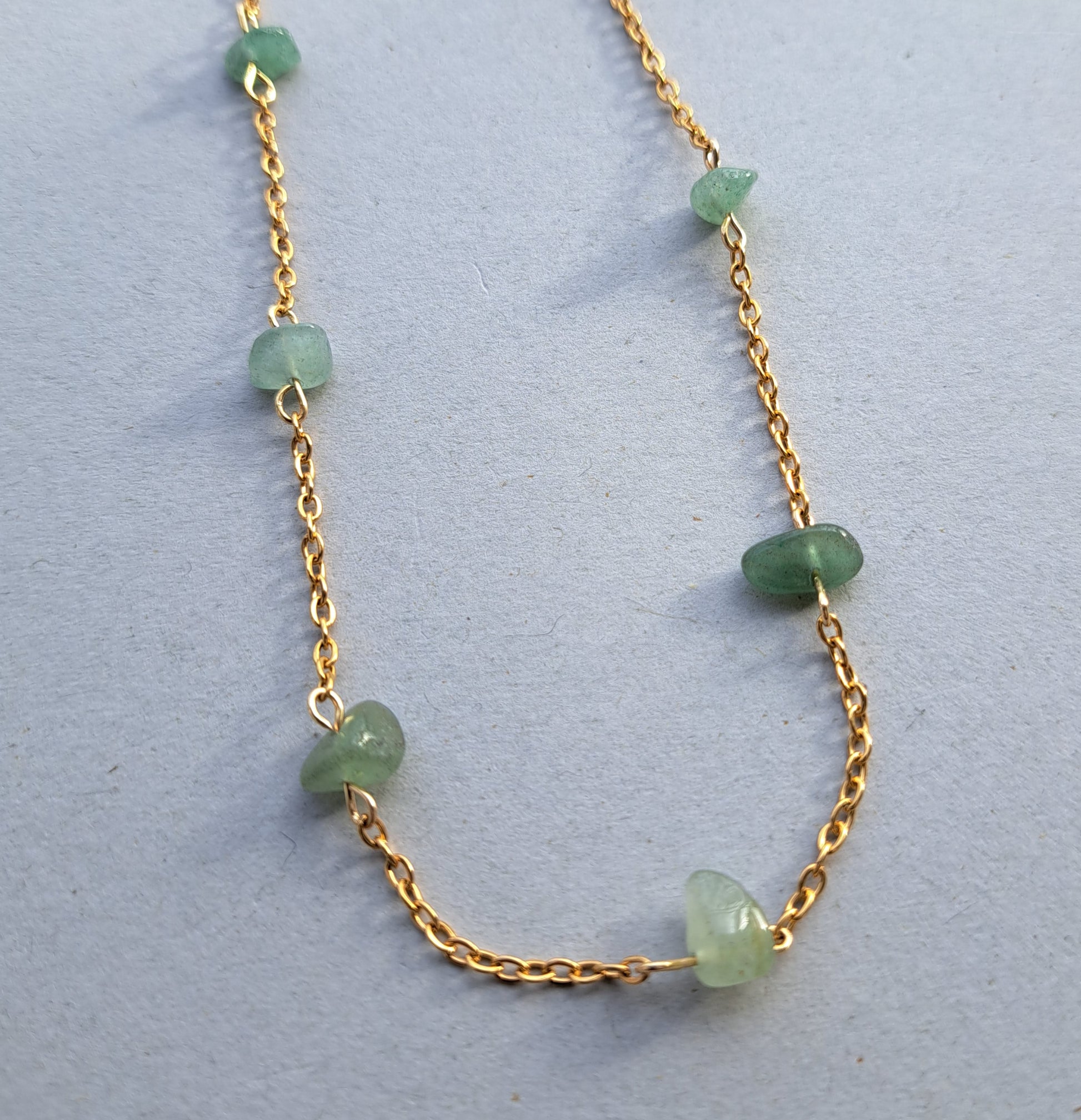 Necklace made of fine gold stainless steel chains and green aventurine beads.