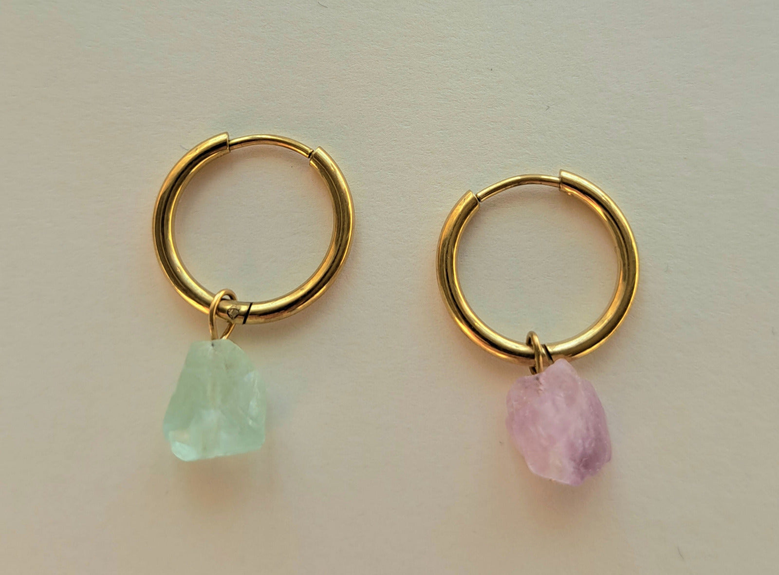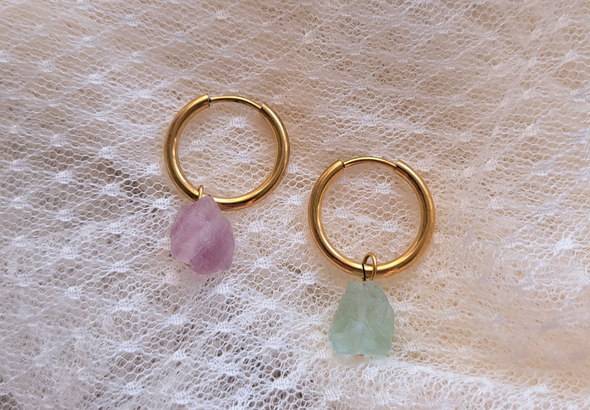 Boucles d'oreilles fines en acier inoxydable composées de 2 anneaux de 1,7cm de diamètre et de perles brutes de fluorite dépareillées.