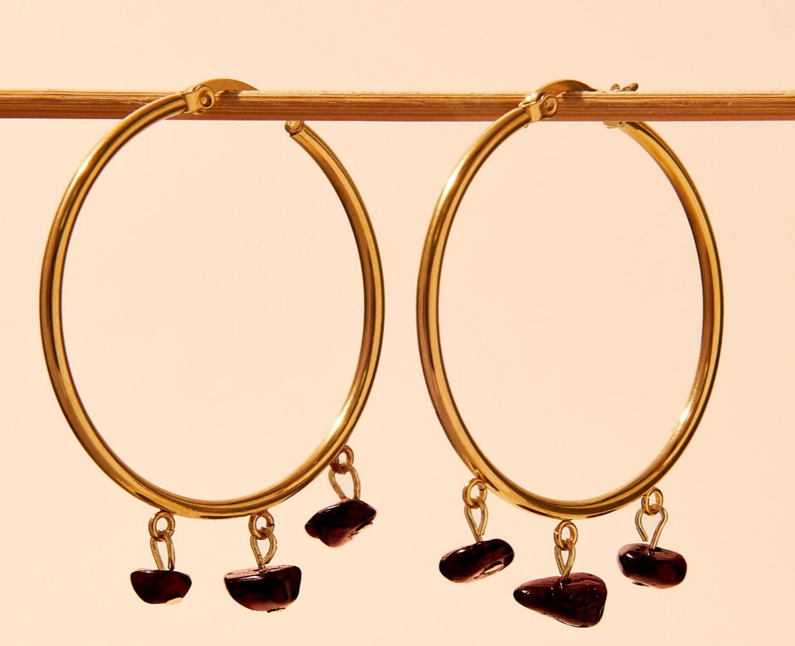 Hoop earrings made of gold-plated stainless steel and garnet beads in burgundy tones.