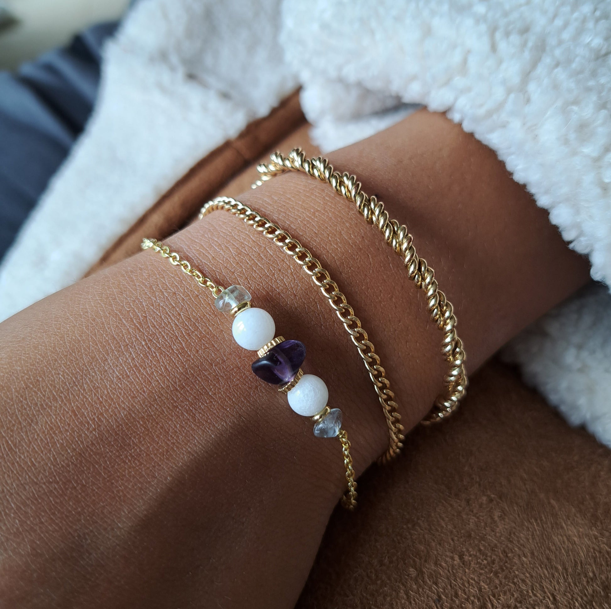 Fine bracelet composed of a golden stainless steel chain, golden spacer beads and natural stones.