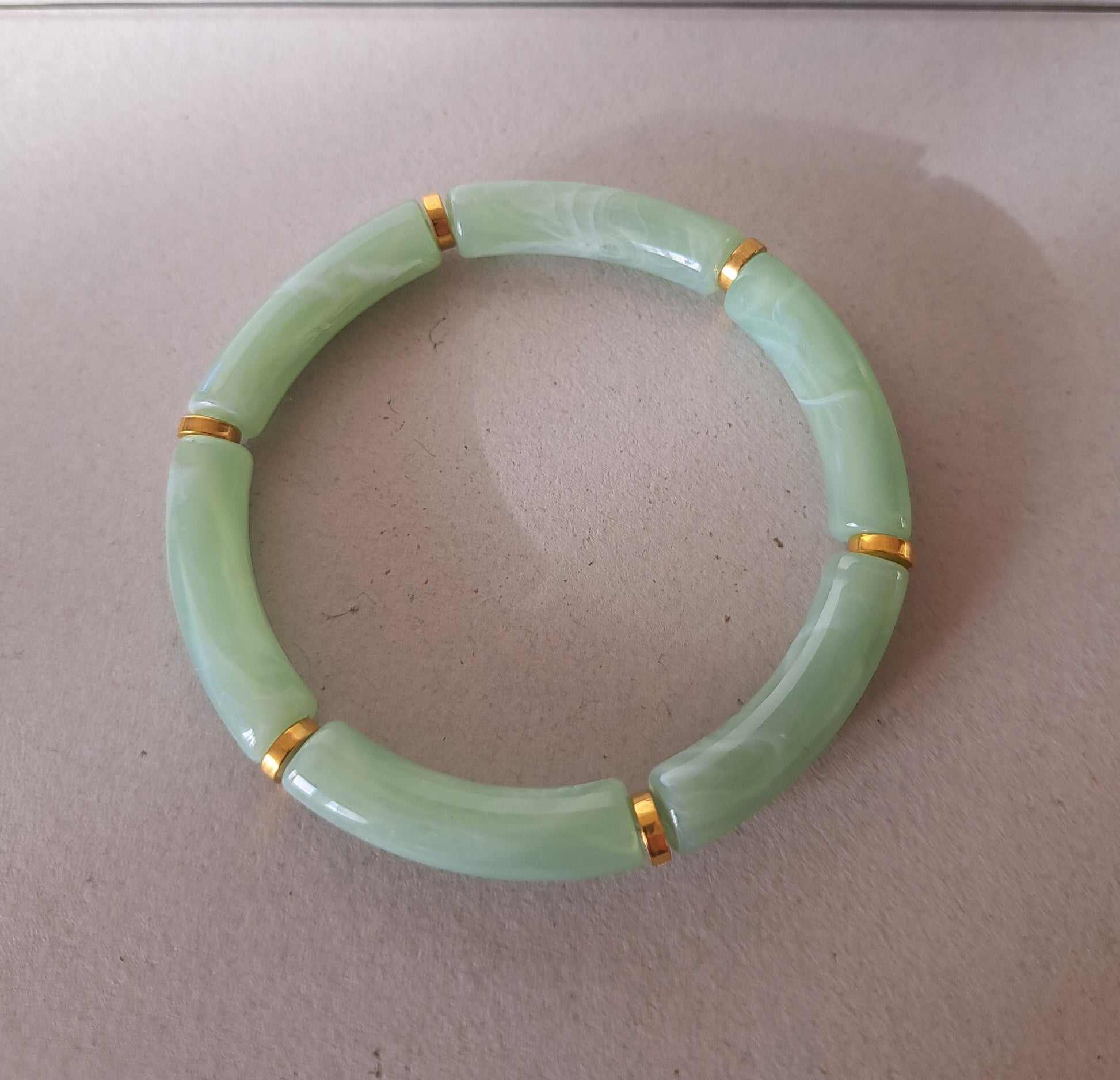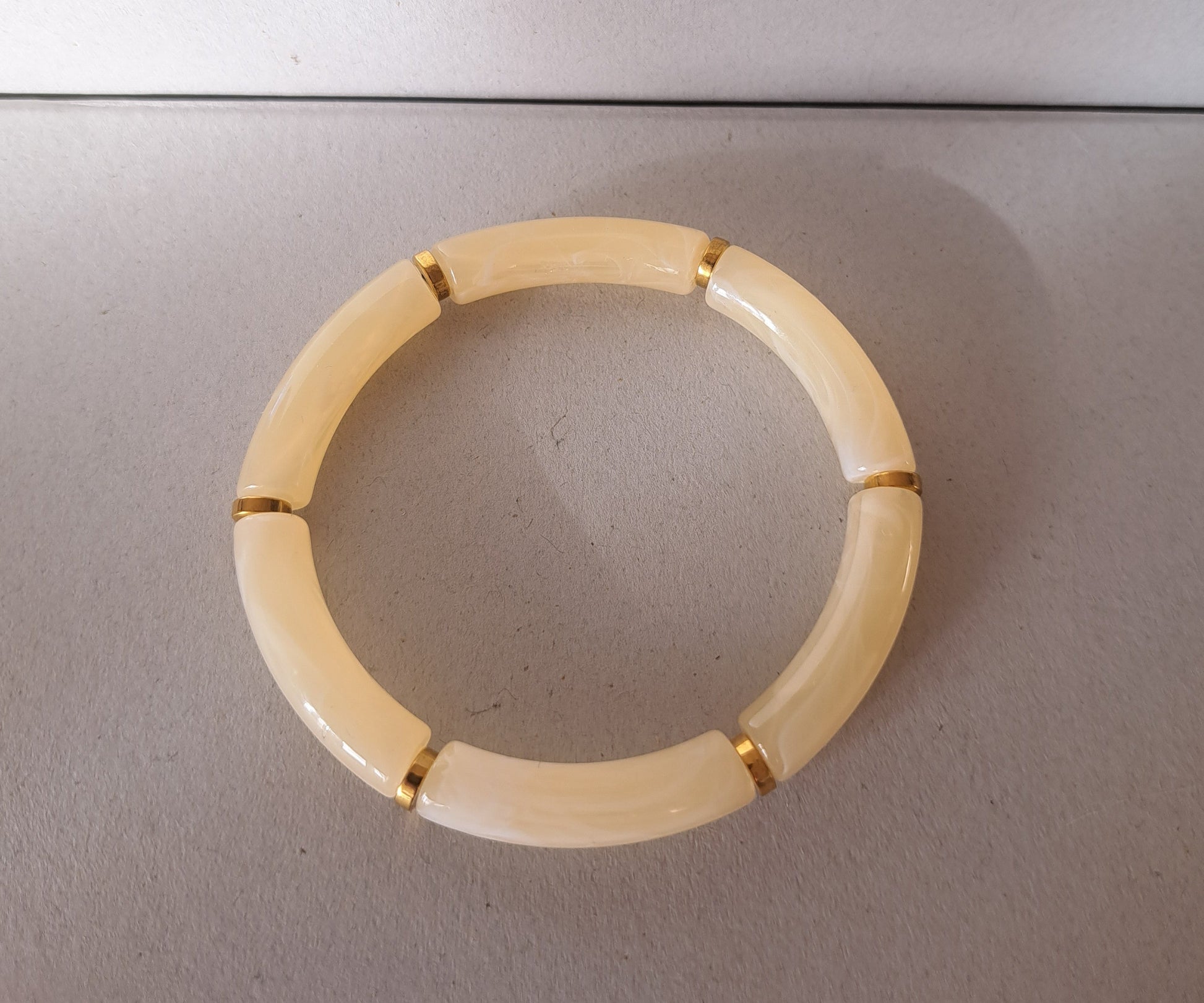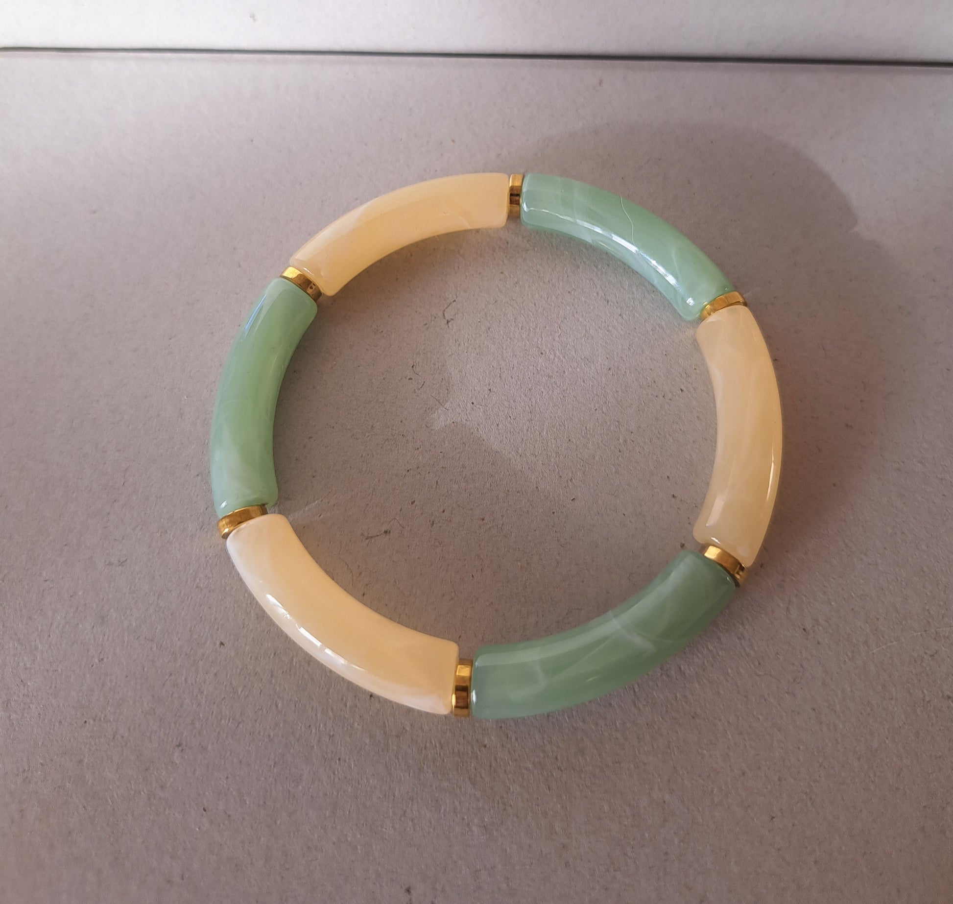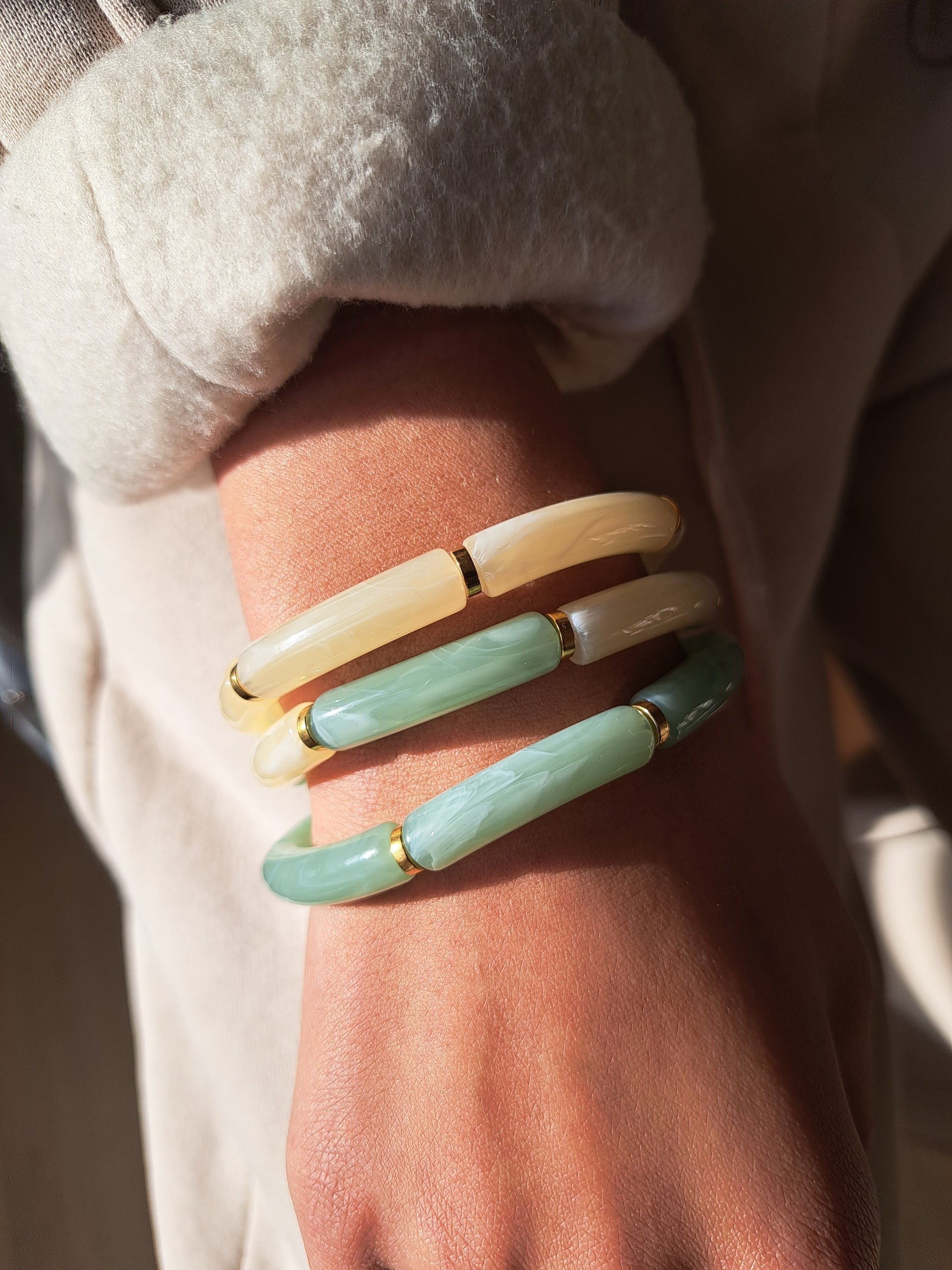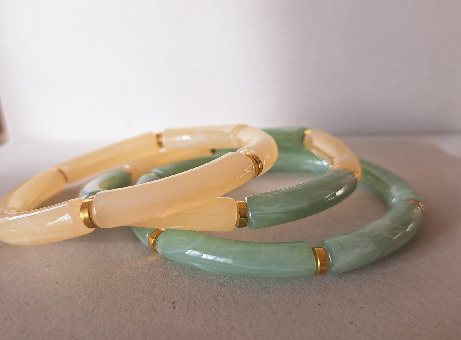 Set of 3 resin bracelets, each composed of 6 resin tubes and 6 gold stainless steel spacer beads. All mounted on a transparent, resistant elastic band.