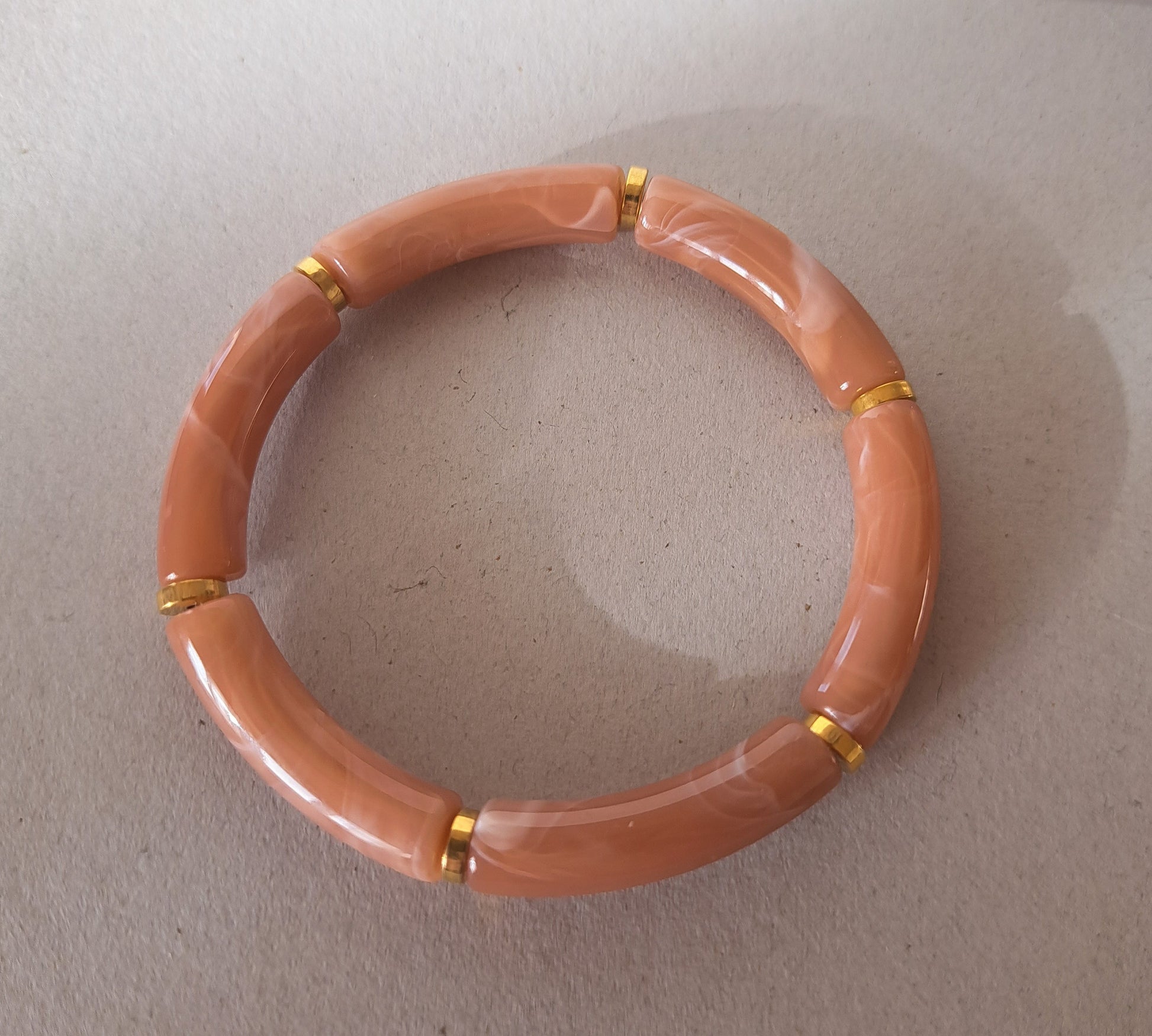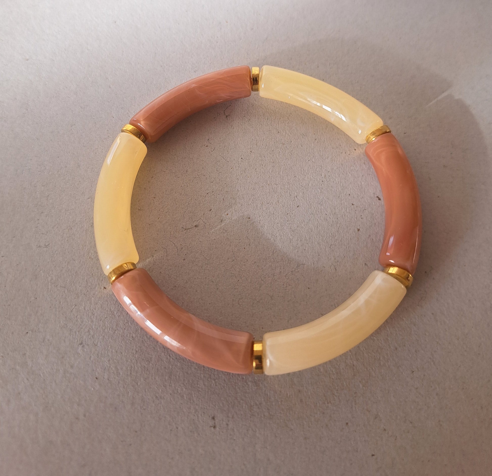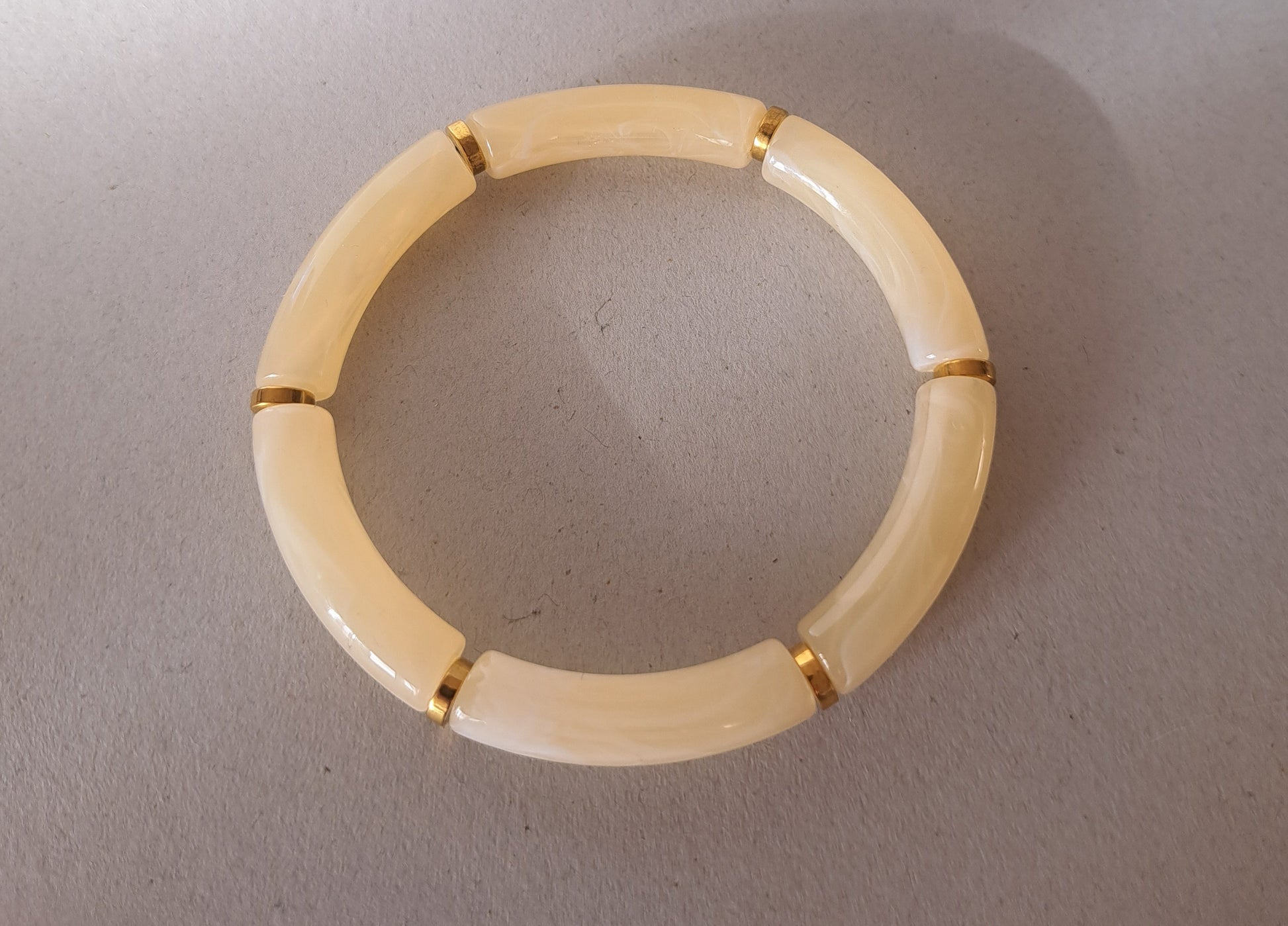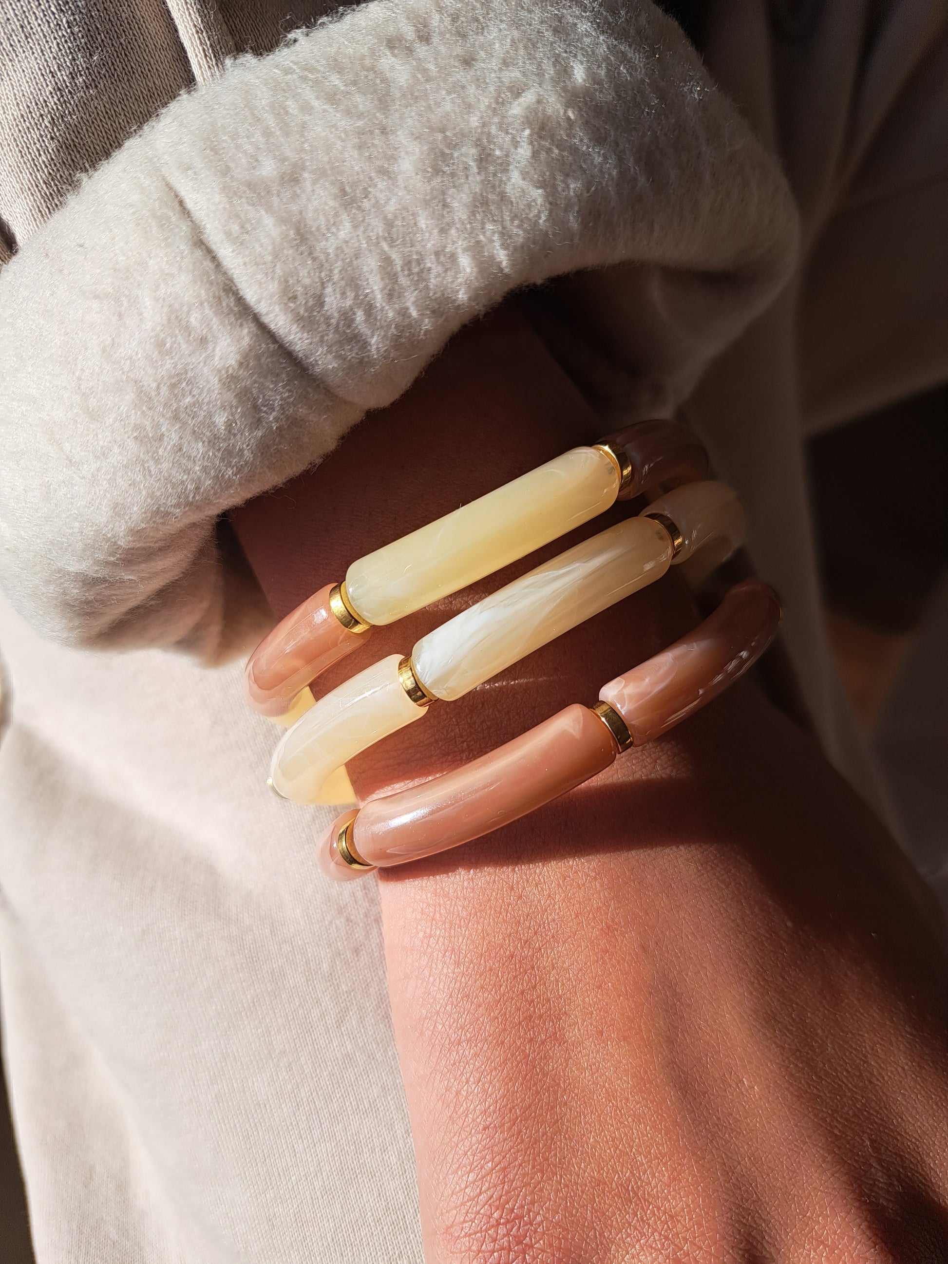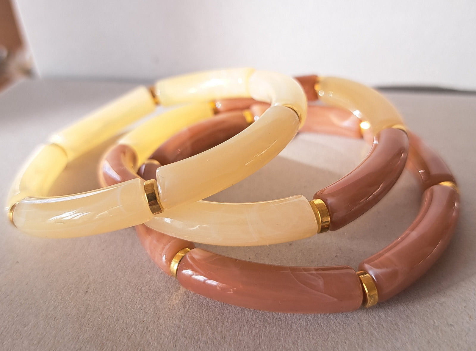 Set of 3 resin bracelets, each made up of 6 resin tubes and 6 gold stainless steel spacer beads.