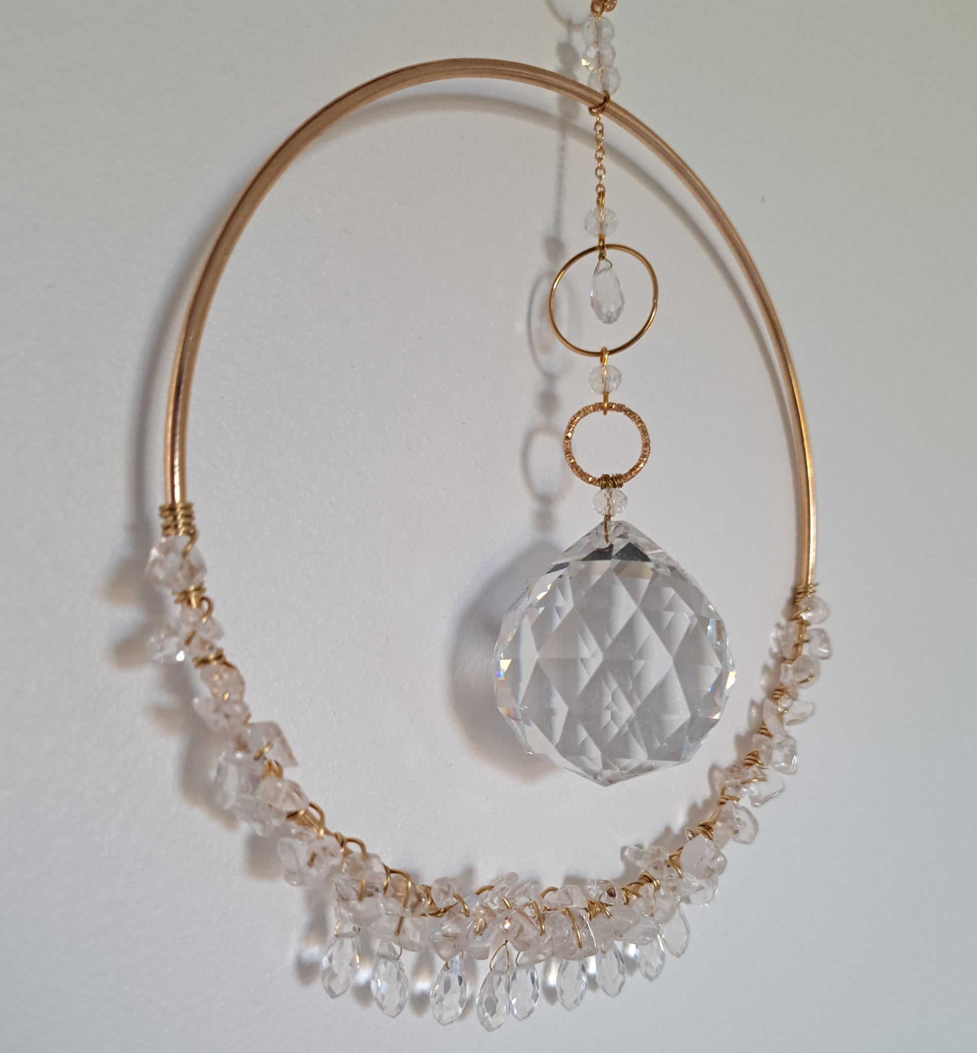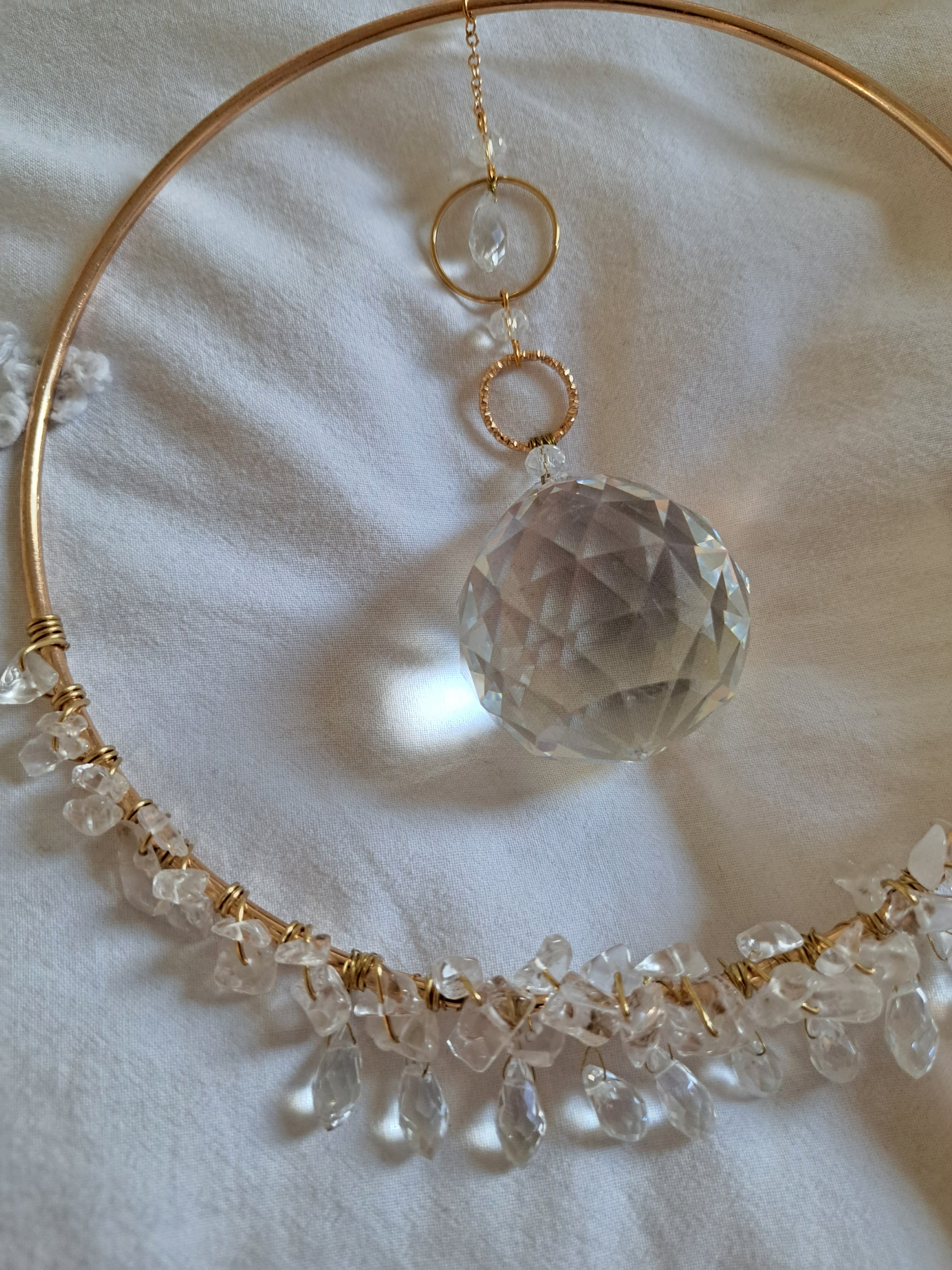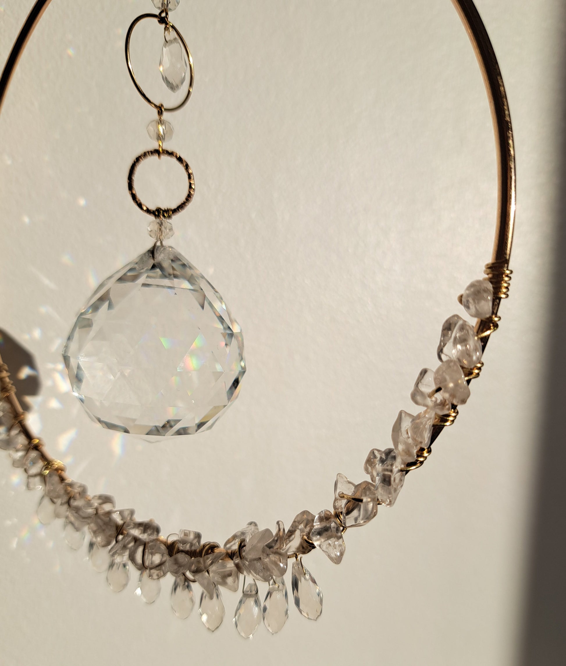 - A 15cm diameter golden brass circle decorated at the bottom with natural rock crystals and faceted glass beads in drops.