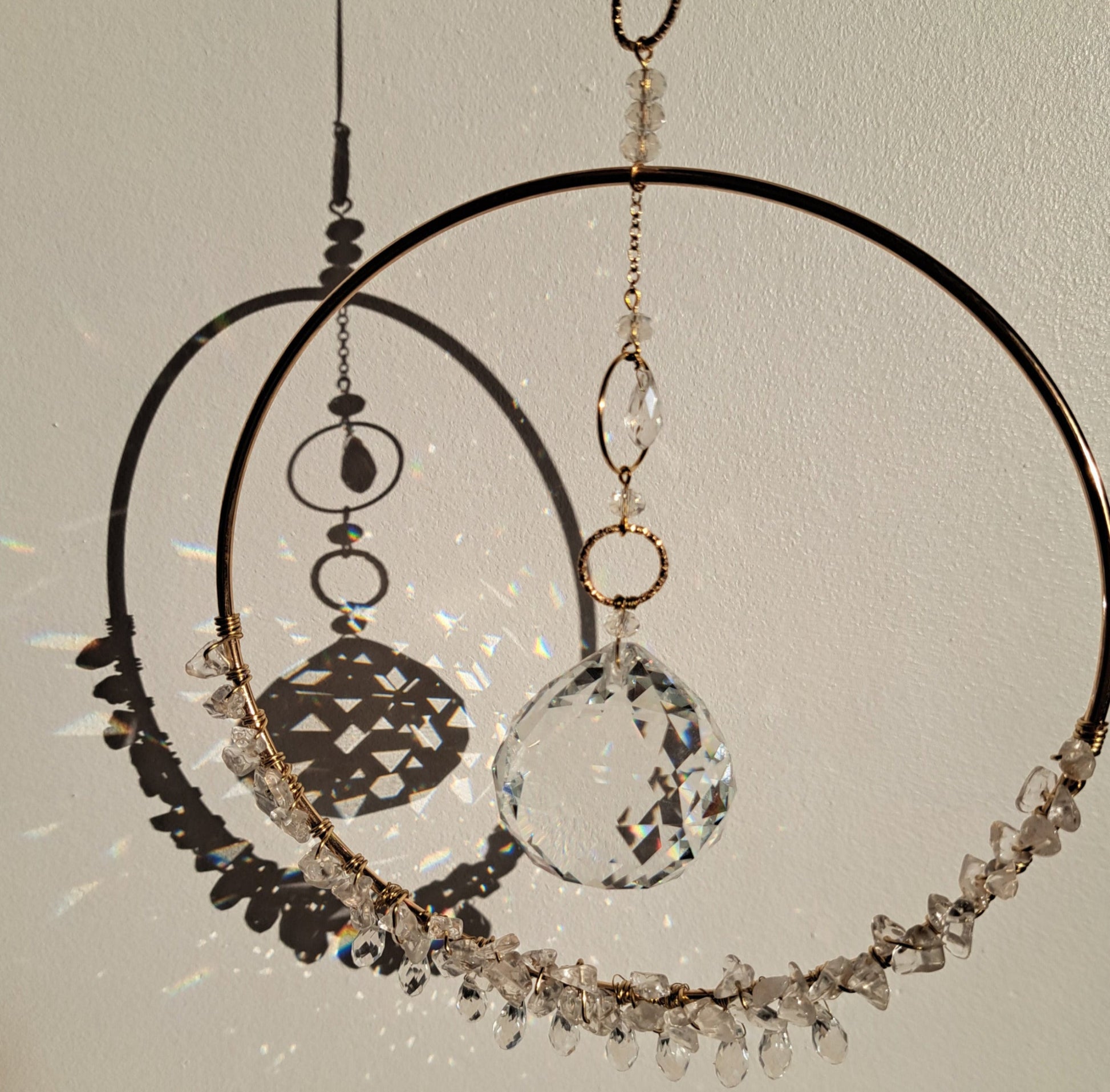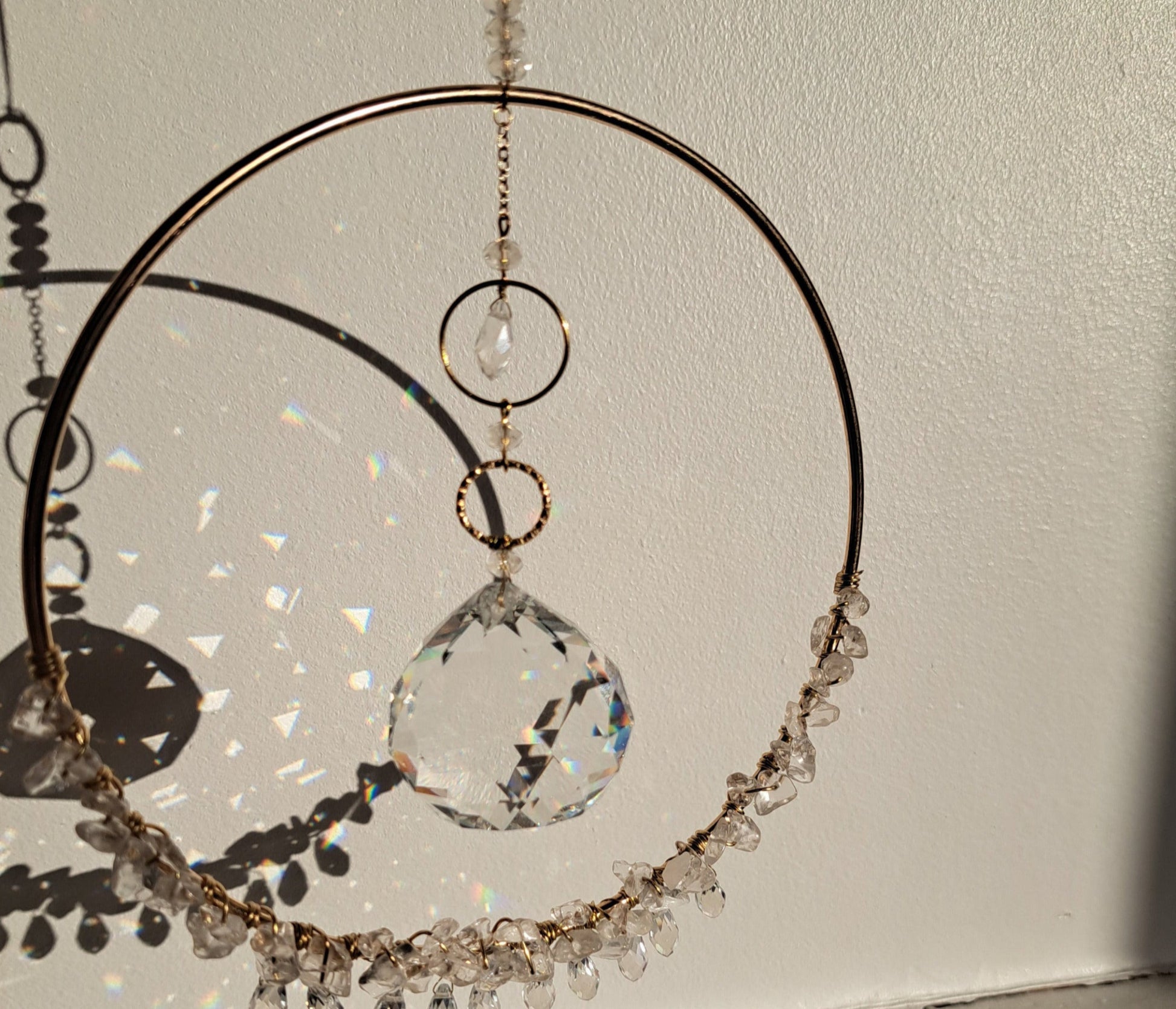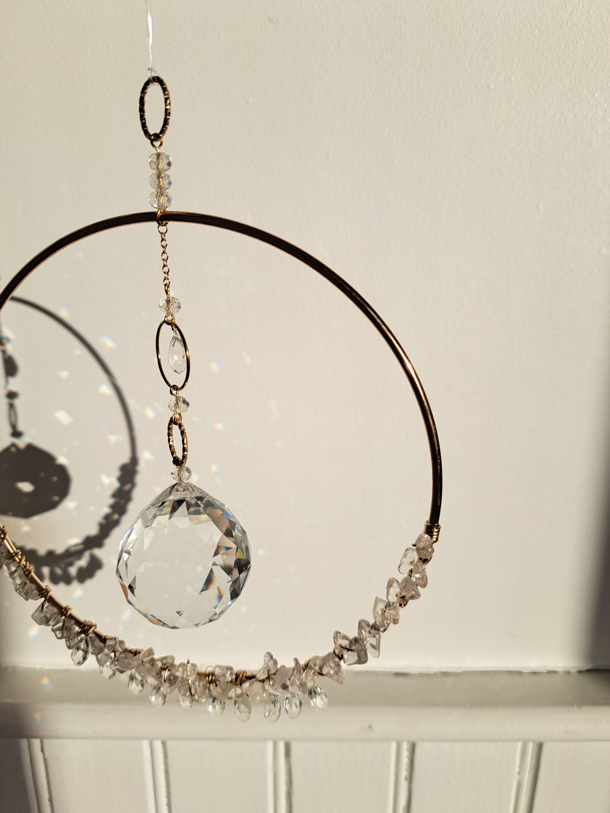 - A 15cm diameter golden brass circle decorated at the bottom with natural rock crystals and faceted glass beads in drops.