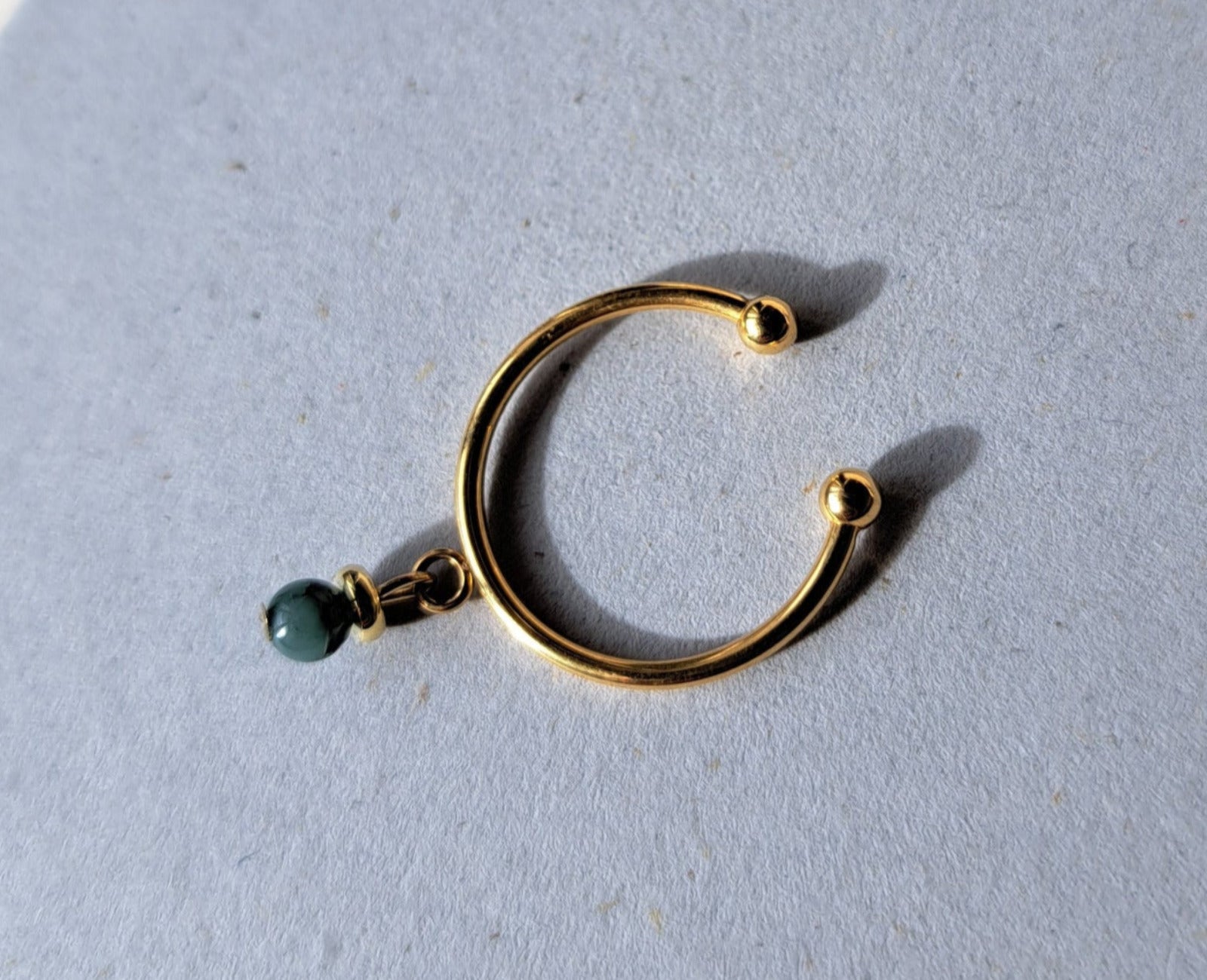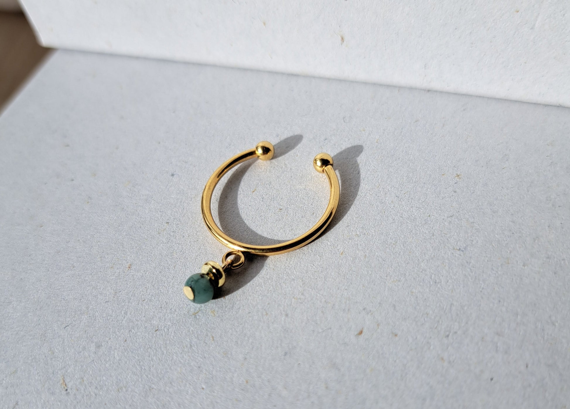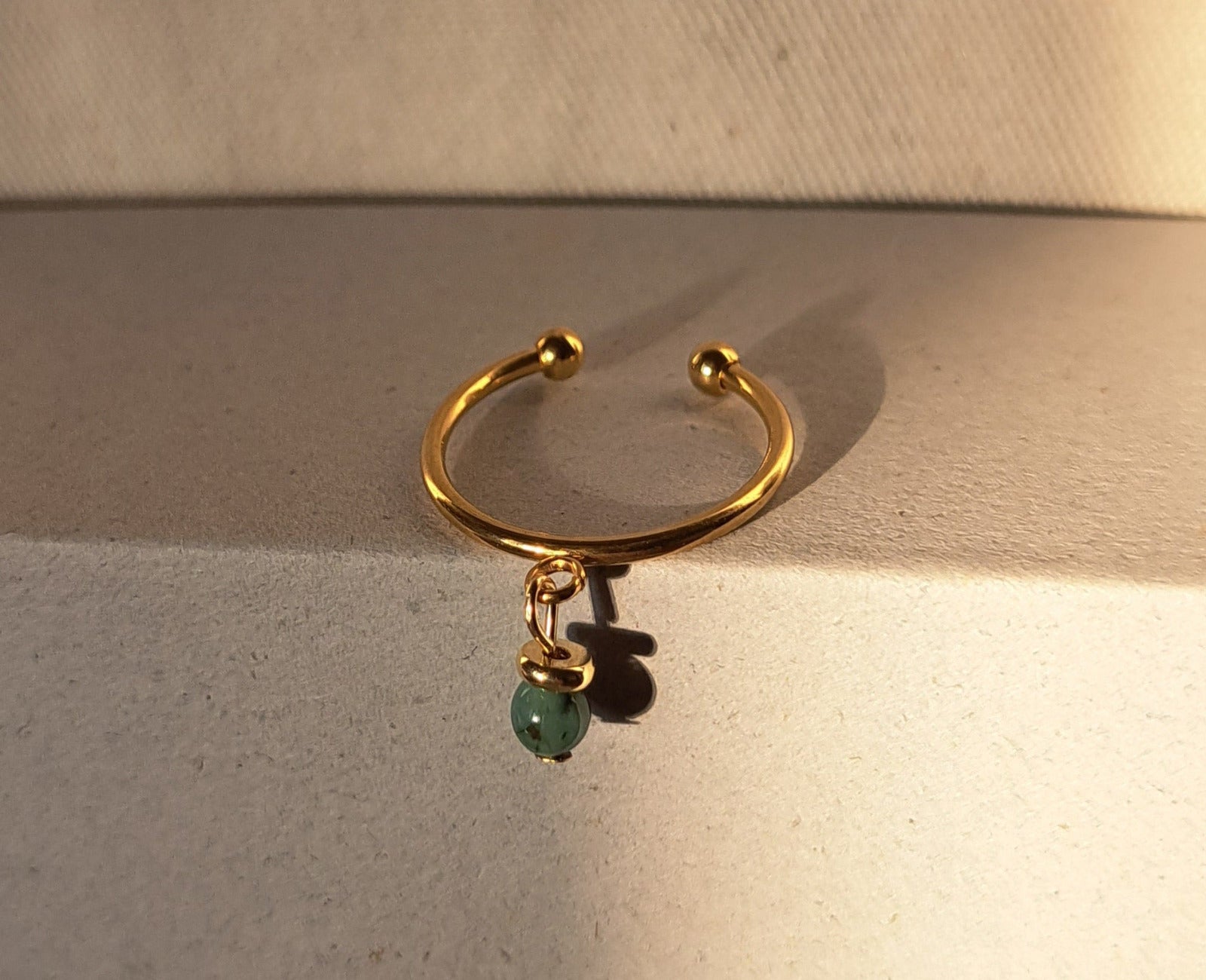 Bague en acier inoxydable réglable et breloque perle d'émeraude et perle plate dorée.