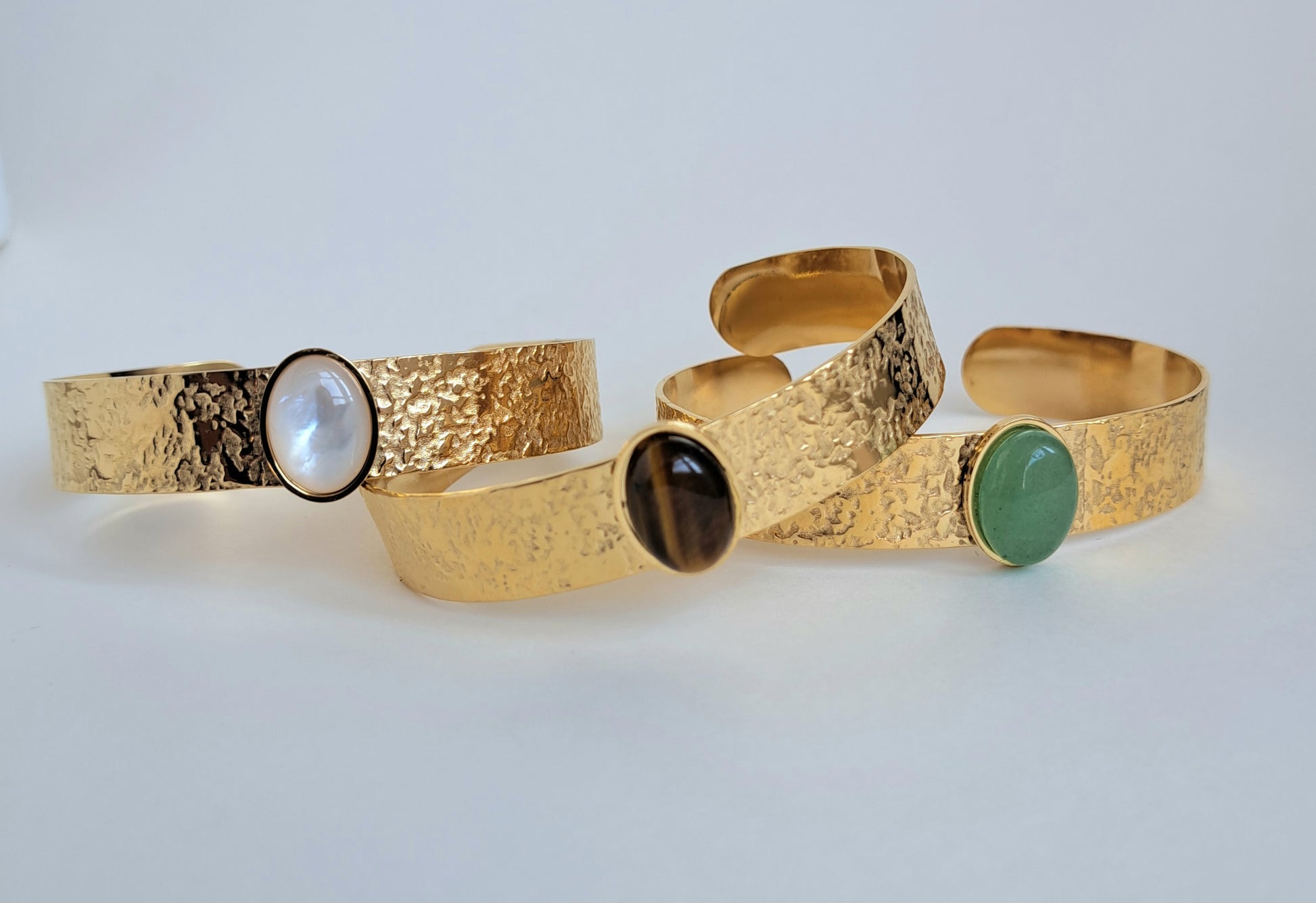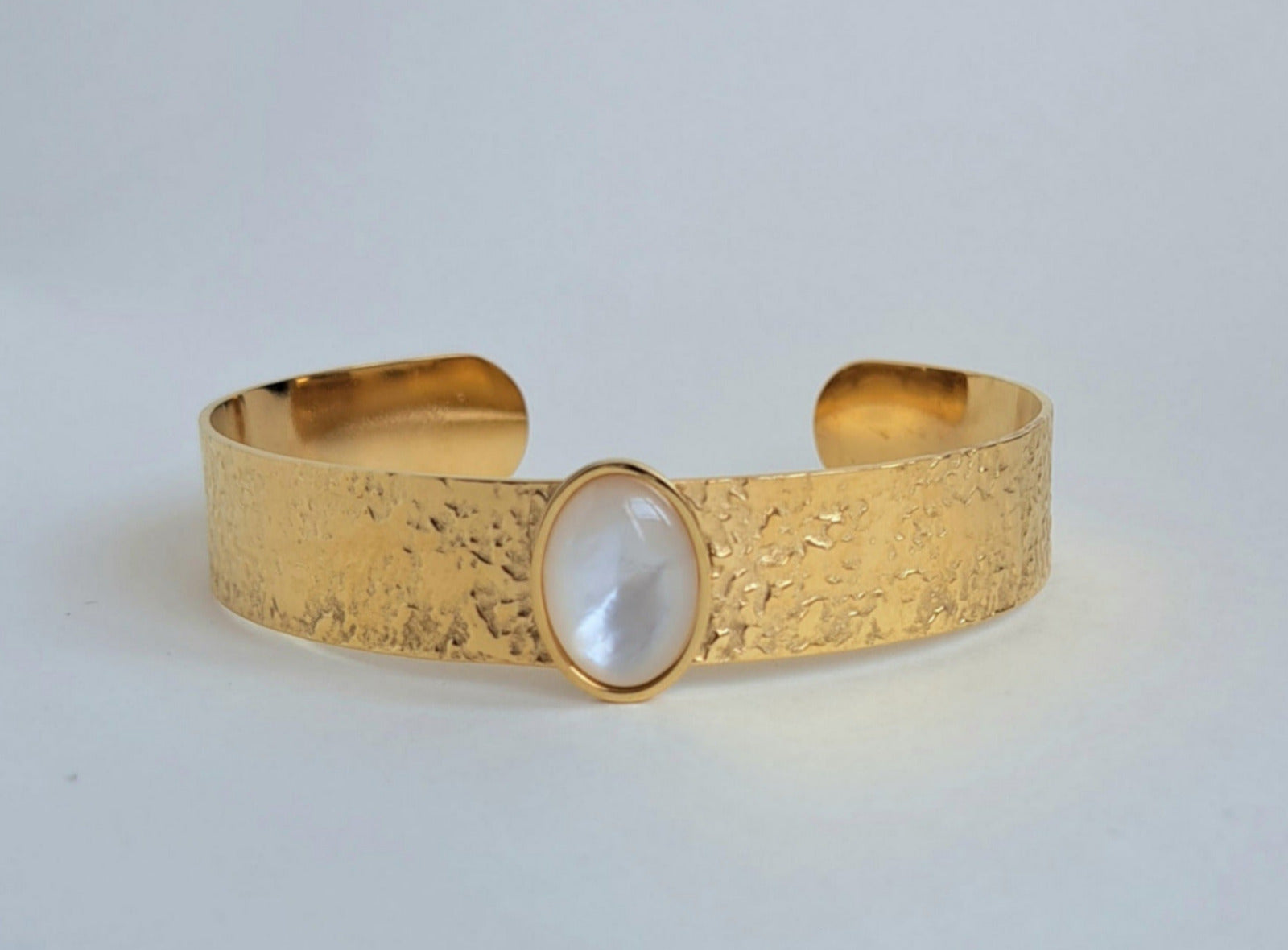 Bracelet jonc doré en acier inoxydable texturé serti d'une pierre de lune blanche irisée.