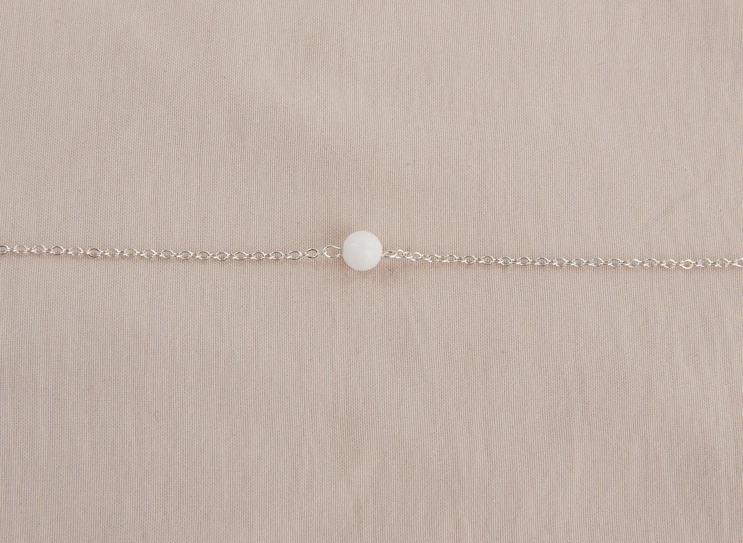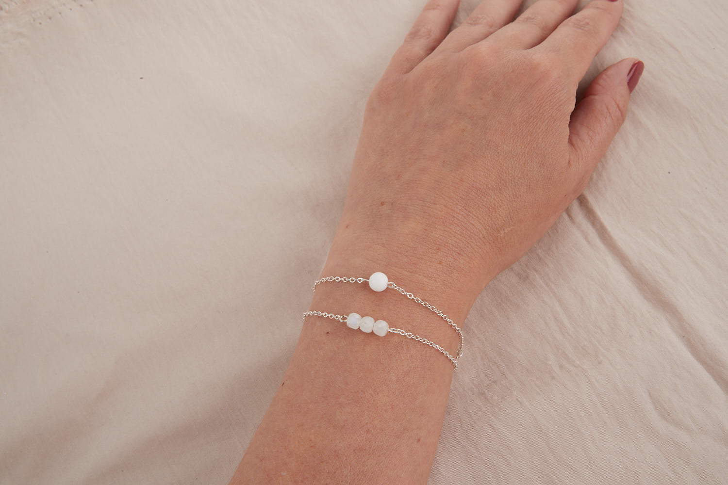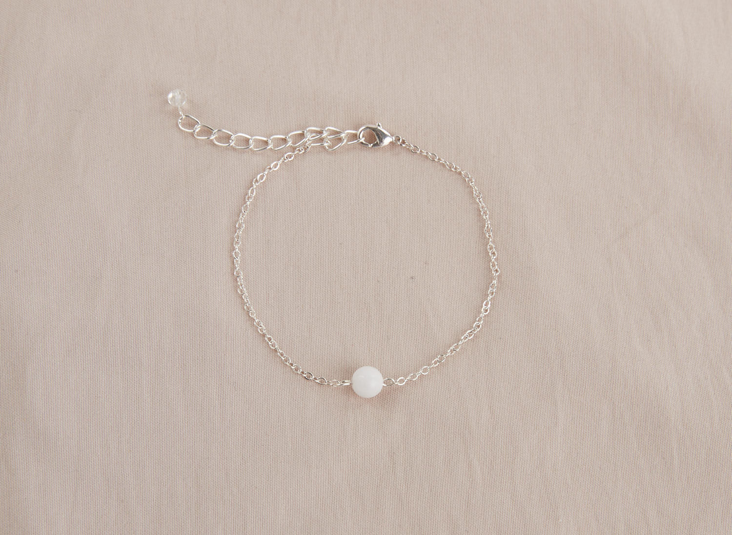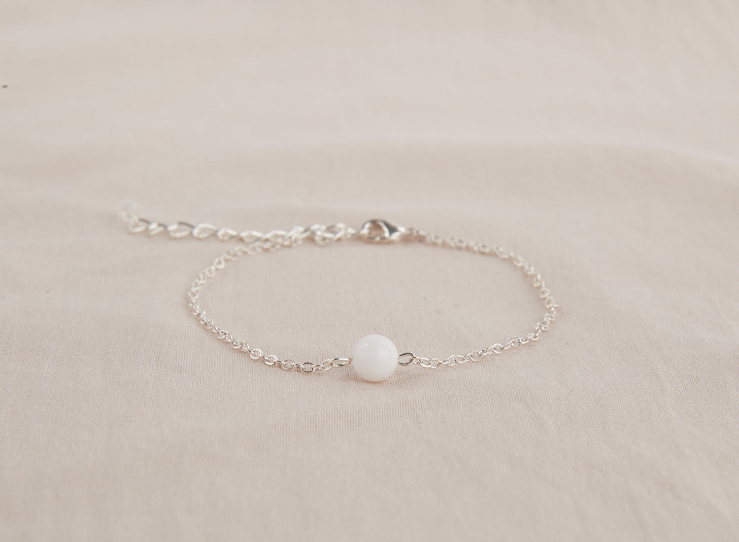 Bracelet fin composé d'une chaînette argentée en acier inoxydable et d'une perle naturelle de lune blanche.