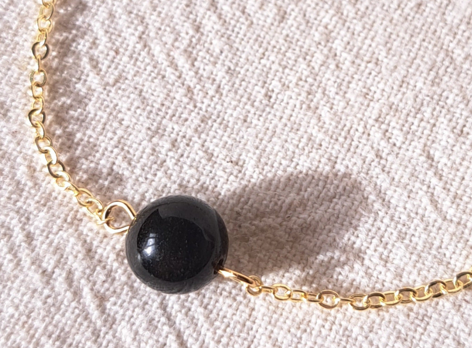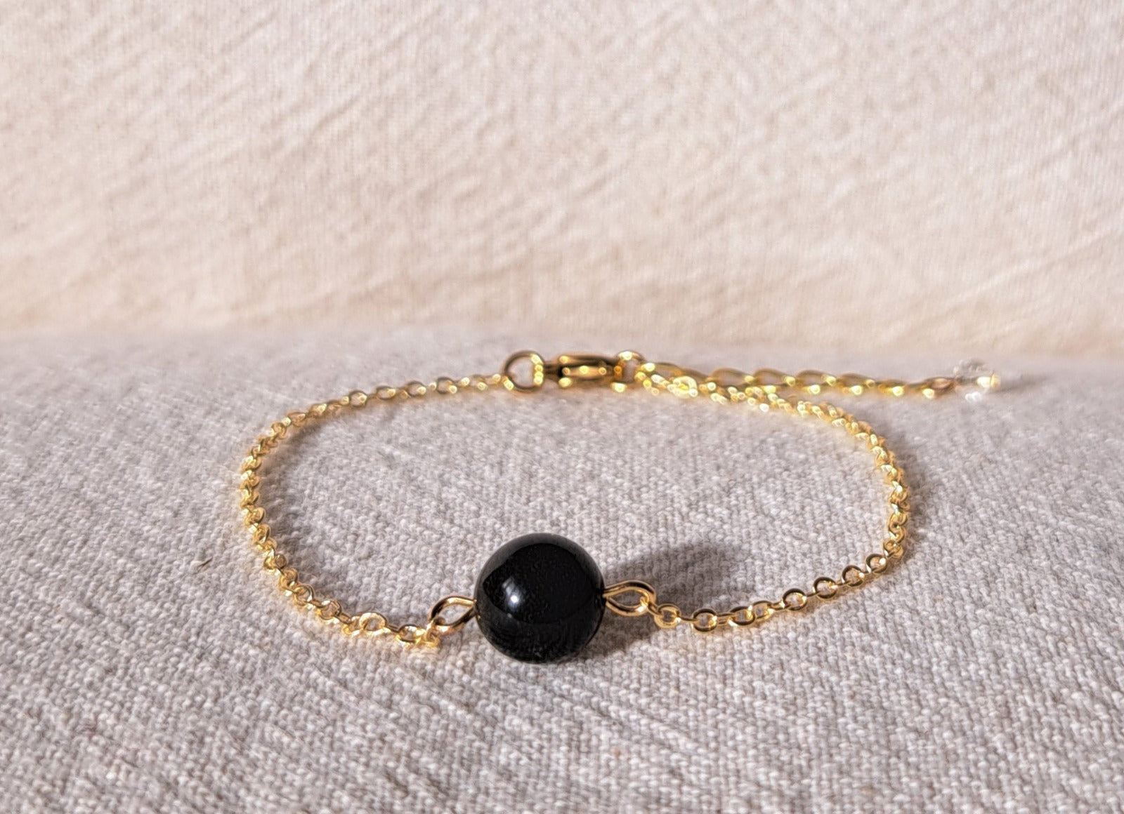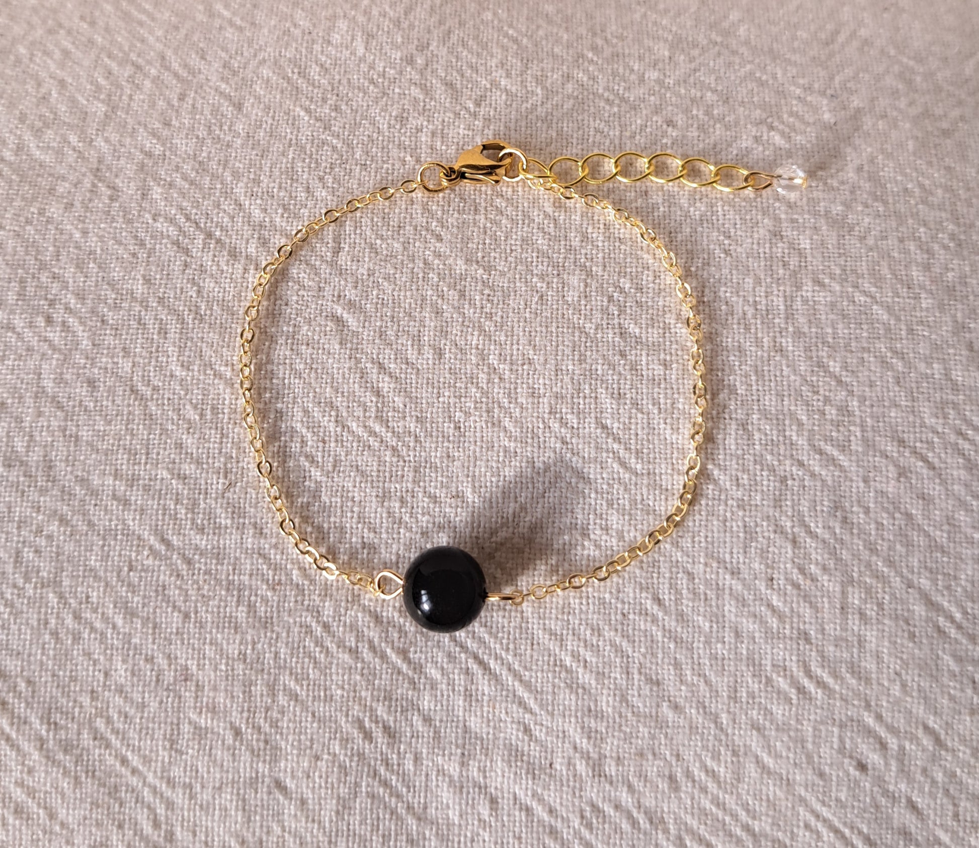 Bracelet fin composé d'une chaînette dorée en acier inoxydable et d'une perle obsidienne de 8mm de diamètre.