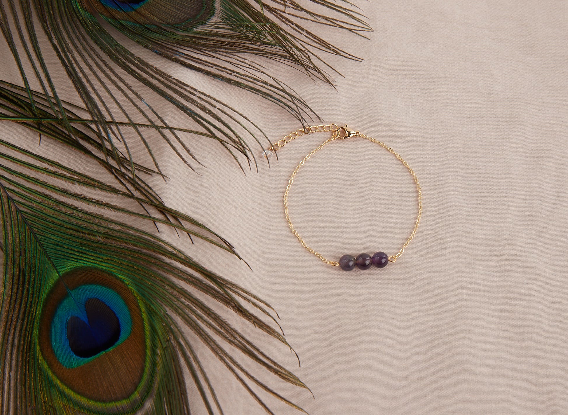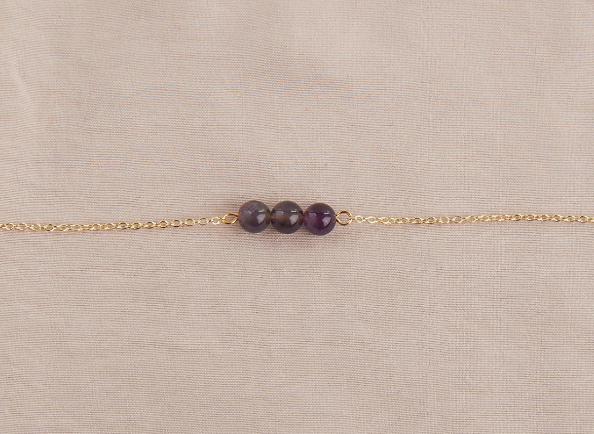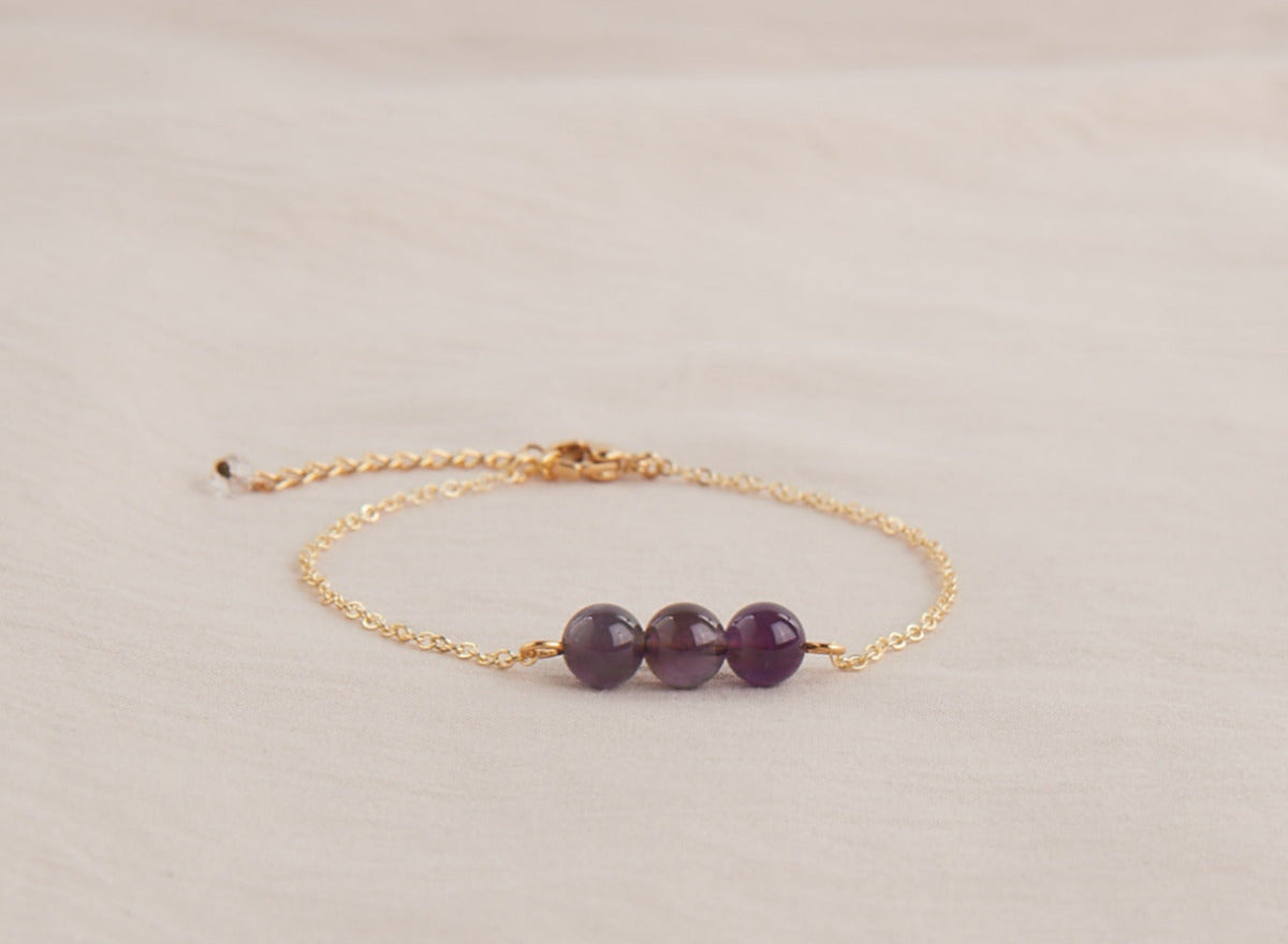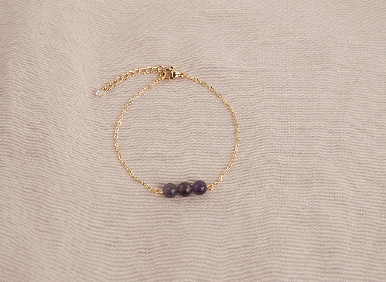 Bracelet fin composé d'une chaînette dorée en acier inoxydable et de 3 perles améthyste violet.