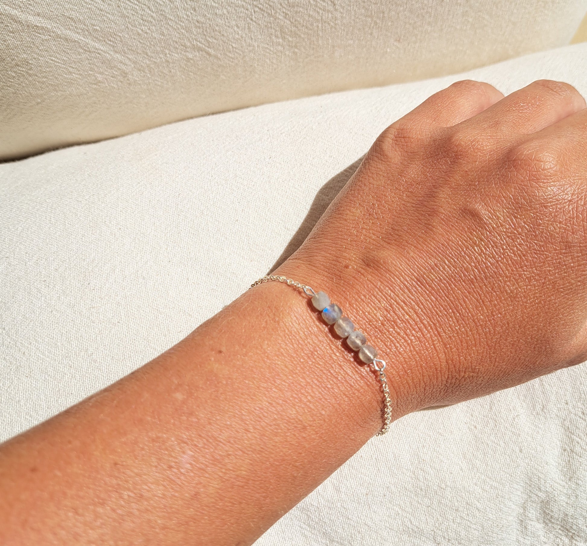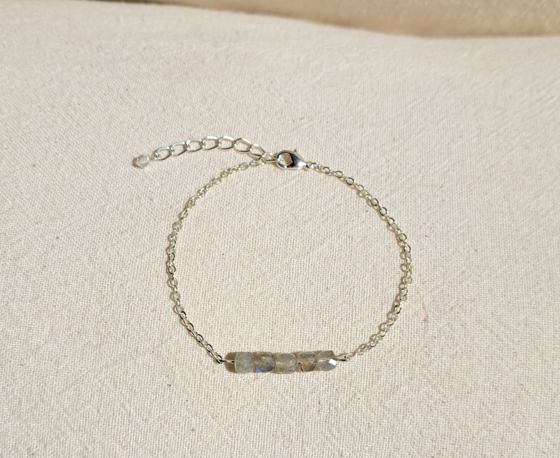 Bracelet fin composé d'une chaînette argentée en acier inoxydable et de cinq perles cubes naturelles labradorite grises irisées.